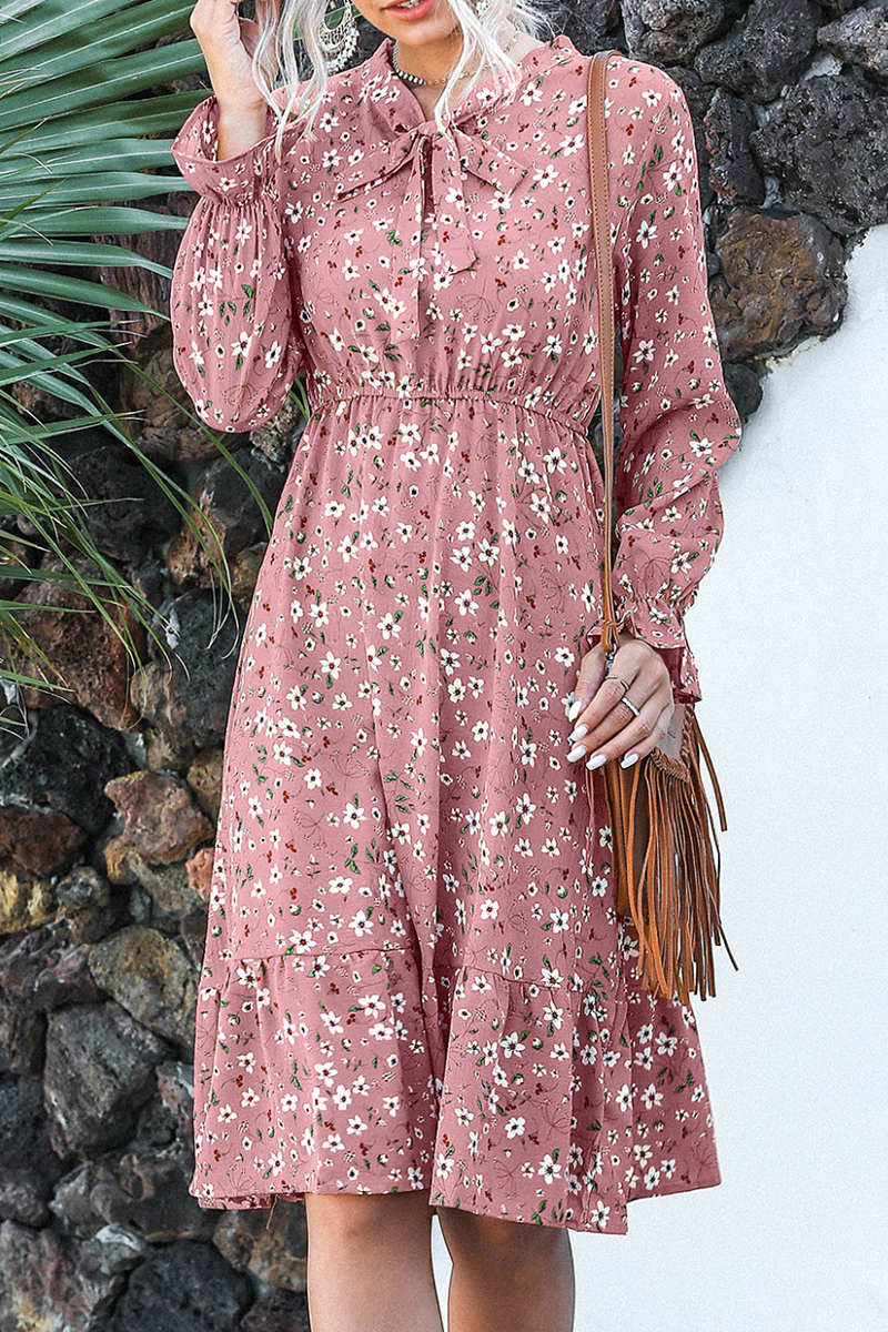 Elegant Floral Fold With Belt Ribbon Collar Pleated Dresses