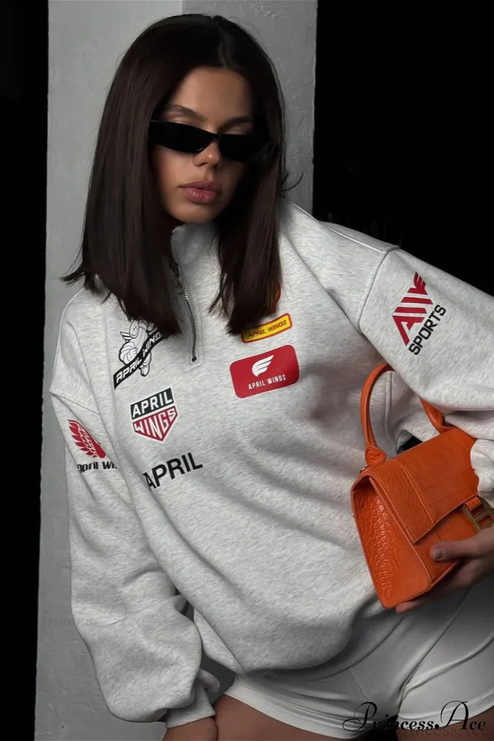 Half Zip Biker Print Stand Collar Loose Sweatshirt