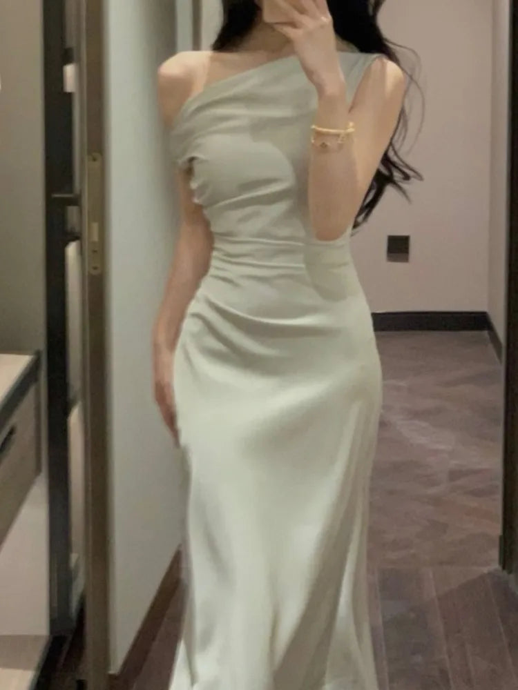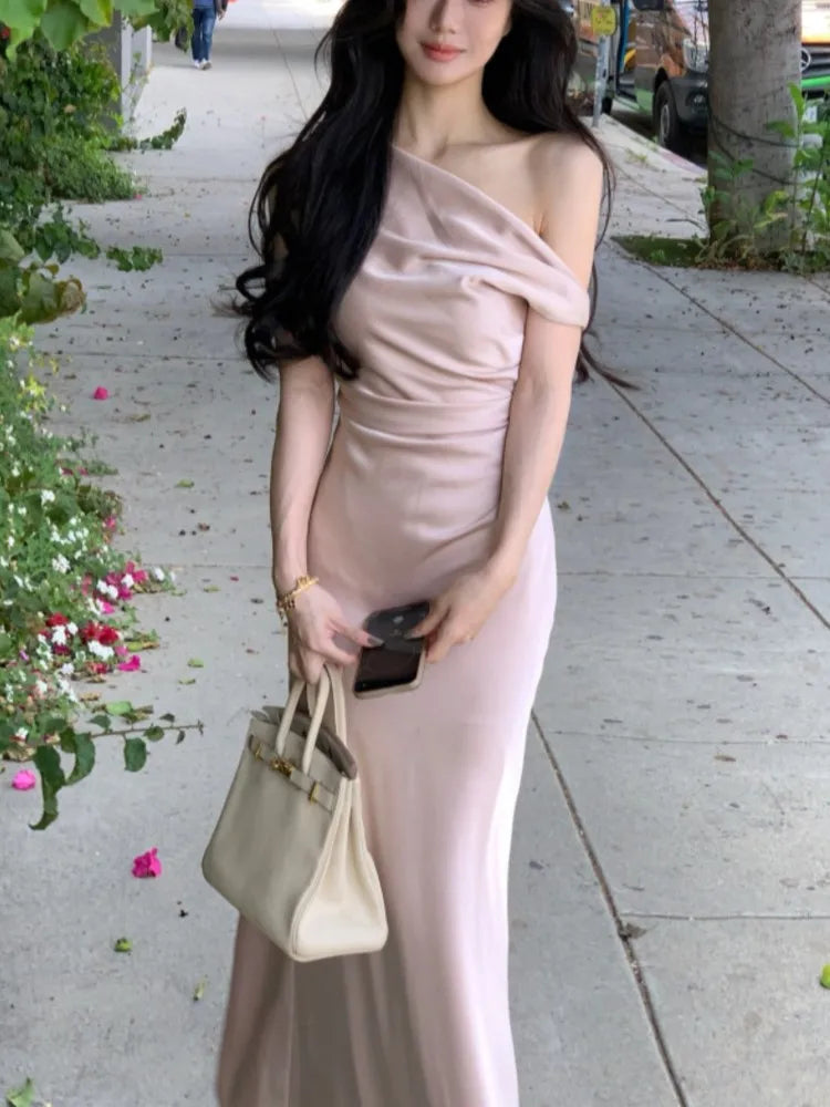 Elegant Evening Party Satin Long Dresses for Women Summer Pink Birthday Robe Sexy Slash Sleeveless Slim Female Clothing