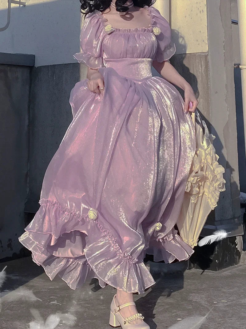 French Vintage Purple Dress Summer Puff Sleeve Backless Bow ALine Midi Dress Fashion Party Evening Palace Princess Dress