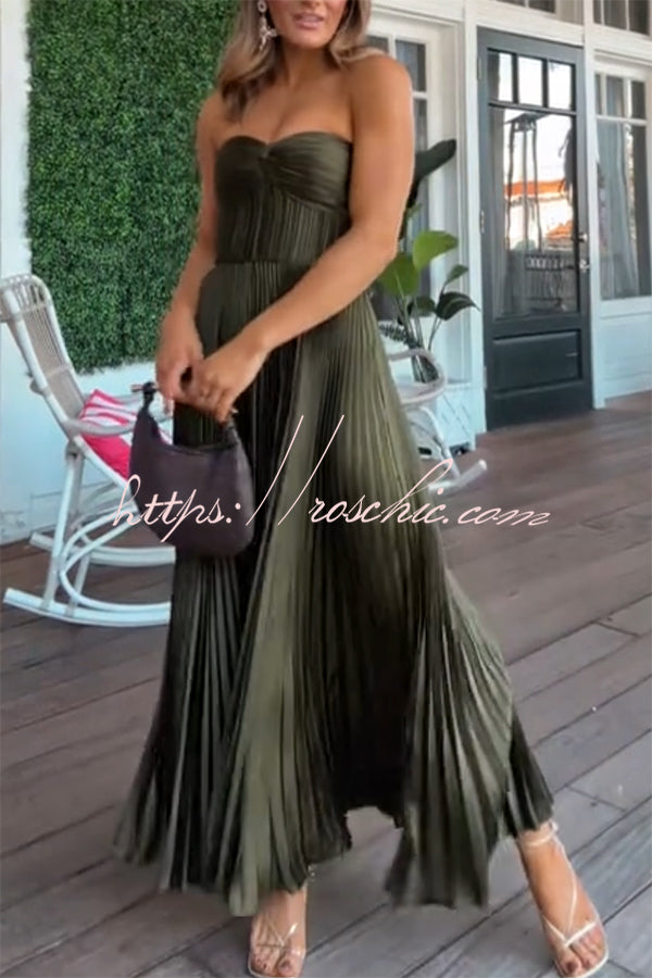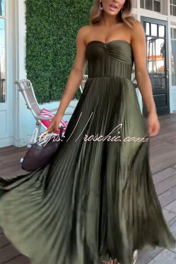 Love Note Satin Sweetheart Twist Off Shoulder Pleated Maxi Dress
