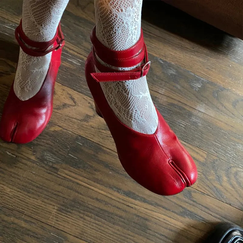 New Spring Fashion Split Toe Women Pumps Chunky Round Ankle Strap Buckle High Heels Red Leather Brand Design Winter Shoes Women