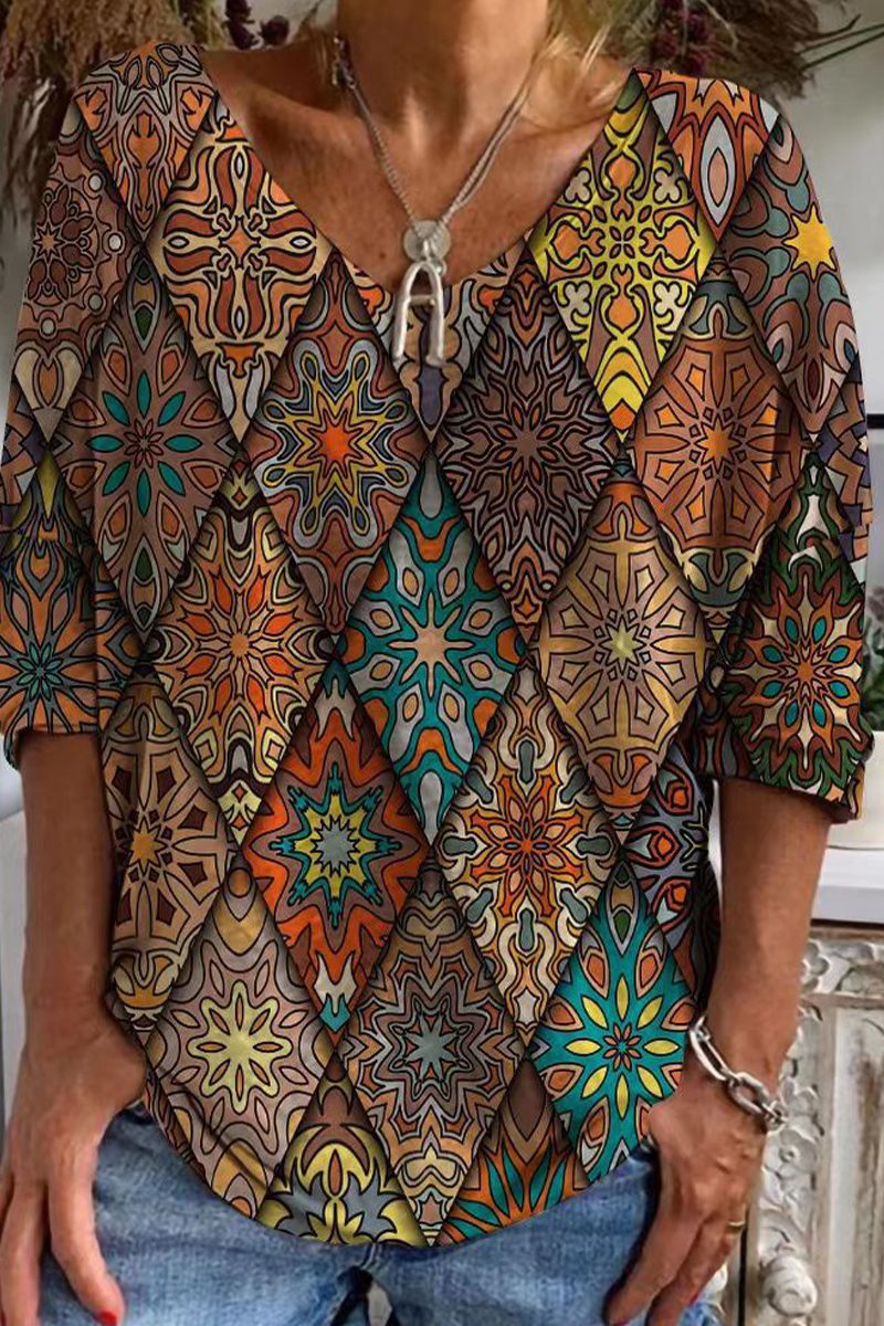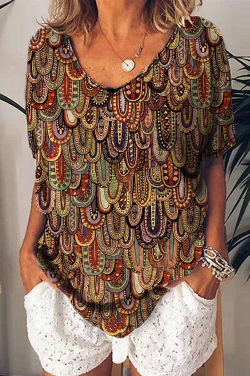Casual Print Patchwork U Neck T-Shirts(3 Colors)