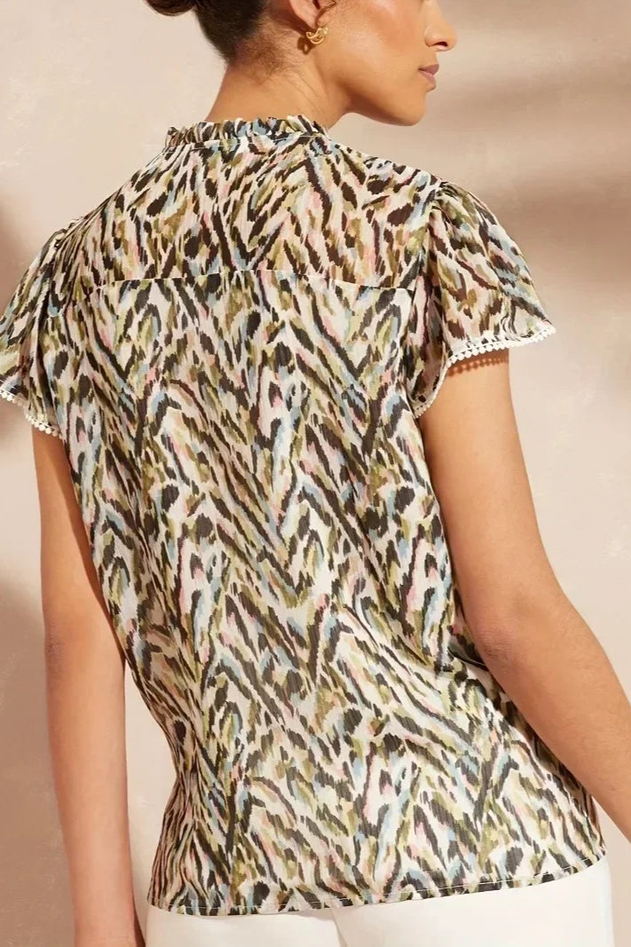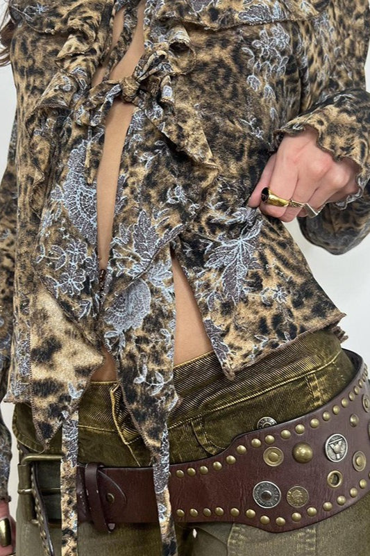 Vintage Animal Print Tie Front Ruffle Blouse