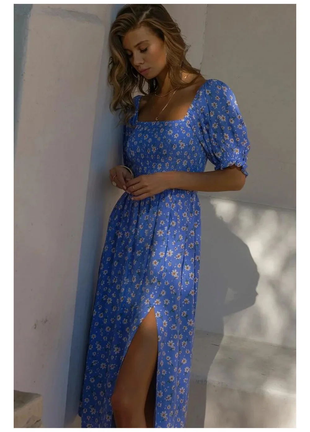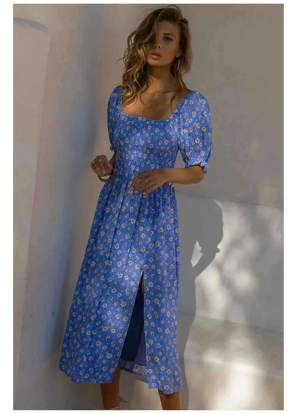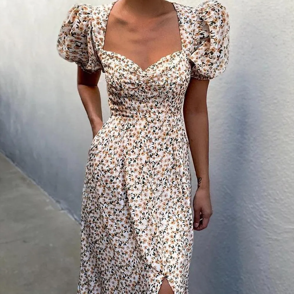 DressBetty - 2023 Women Elegant Floral Print Summer Dress V-neck Puff Sleeve Split Midi Dress