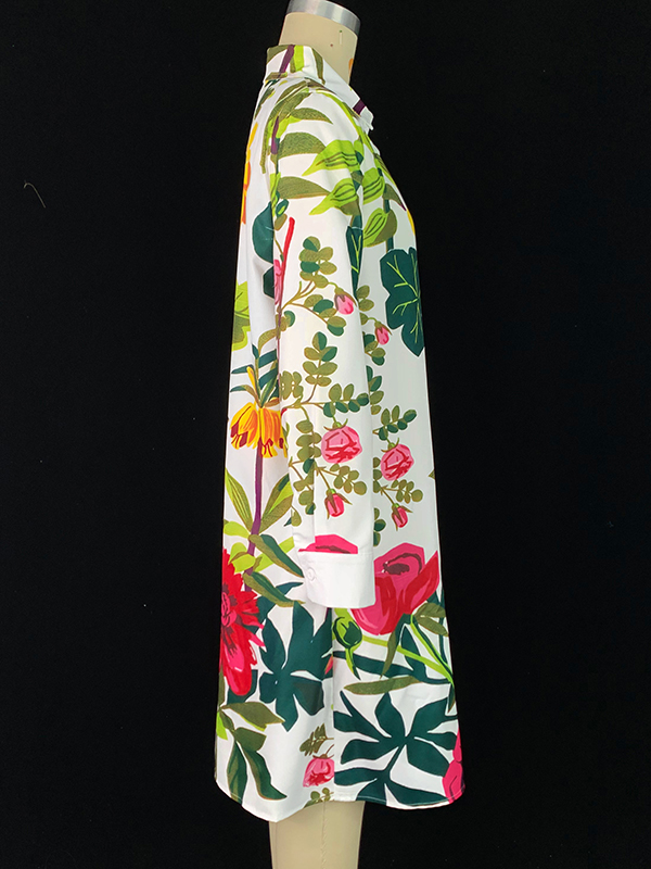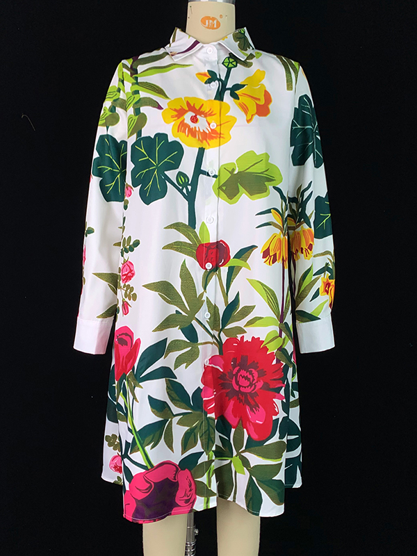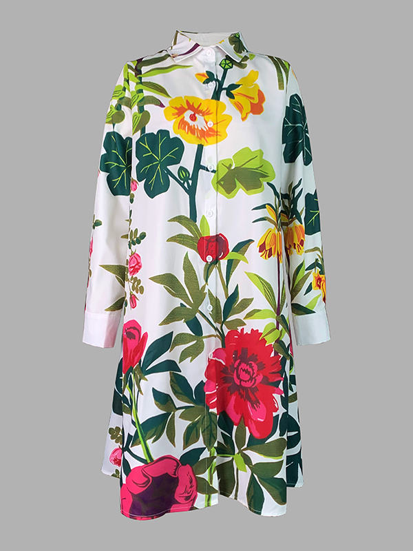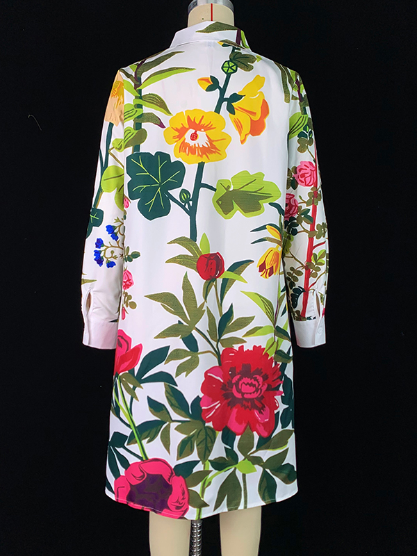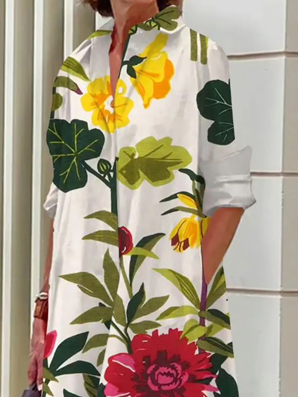A-Line Long Sleeves Flower Print Pockets Split-Joint Lapel Midi Dresses