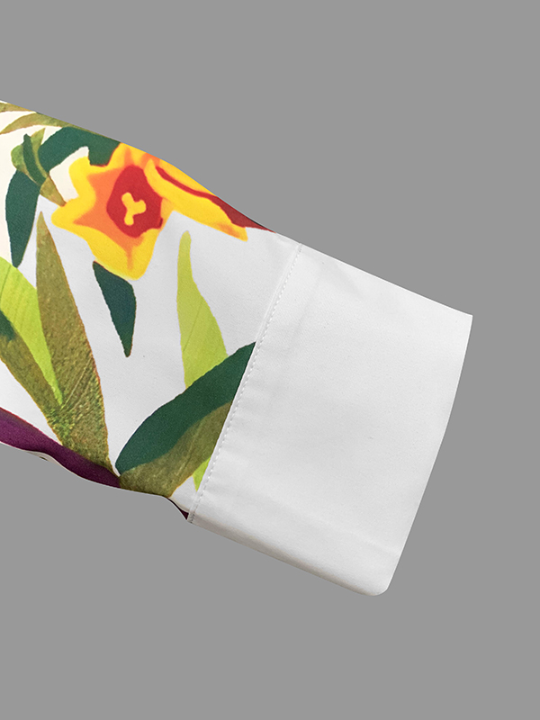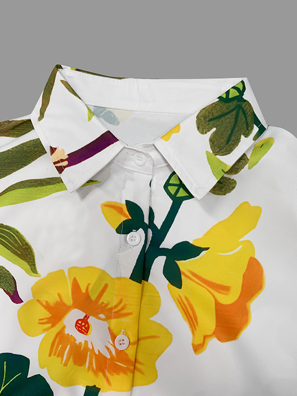 A-Line Long Sleeves Flower Print Pockets Split-Joint Lapel Midi Dresse