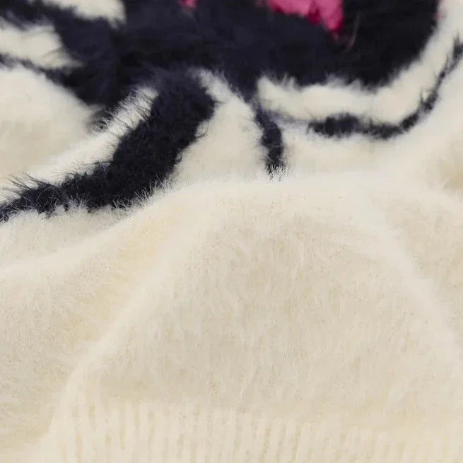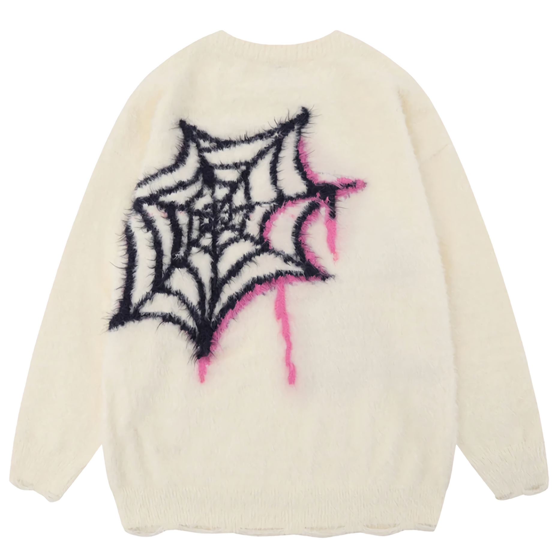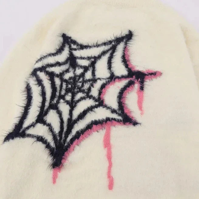 Cream-colored plush sweater featuring a_large spider graphic_with a pink star on its body. The spider design is rendered in fuzzy black texture, creating a striking contrast against the light background. This unique, eye-catching piece combines cozy comfort with edgy, alternative style for a bold fashion statement.