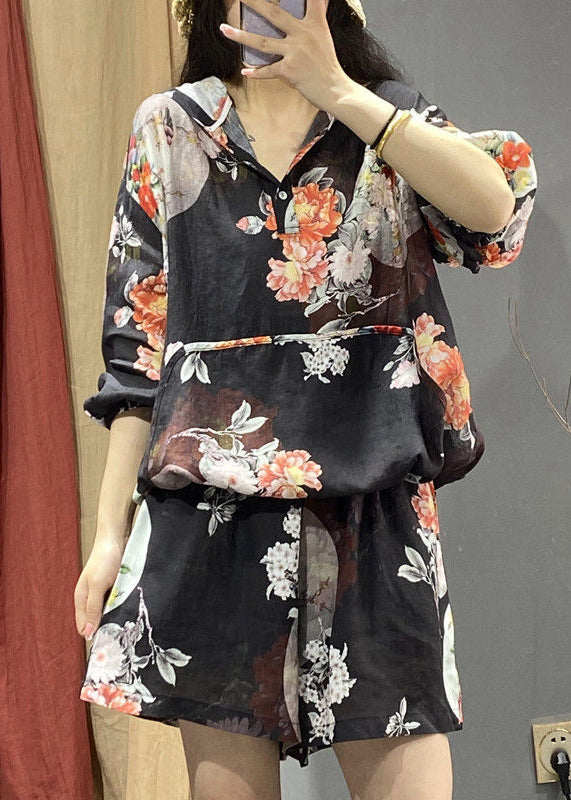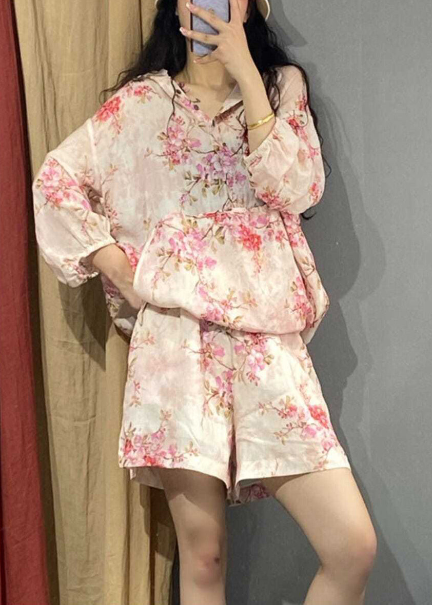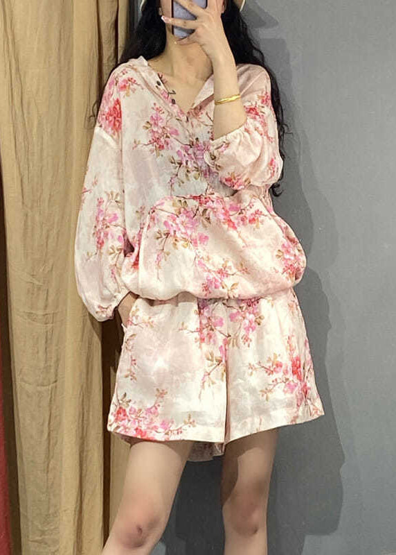 This long-sleeve two-piece set features a beautiful pink print, along with a hood, shirts, and shorts. It's the perfect addition to any wardrobe.