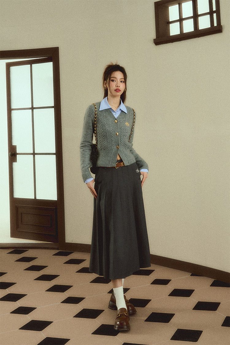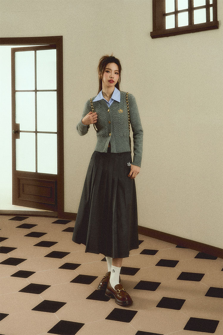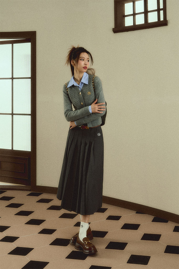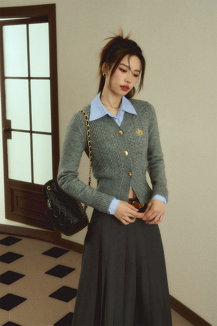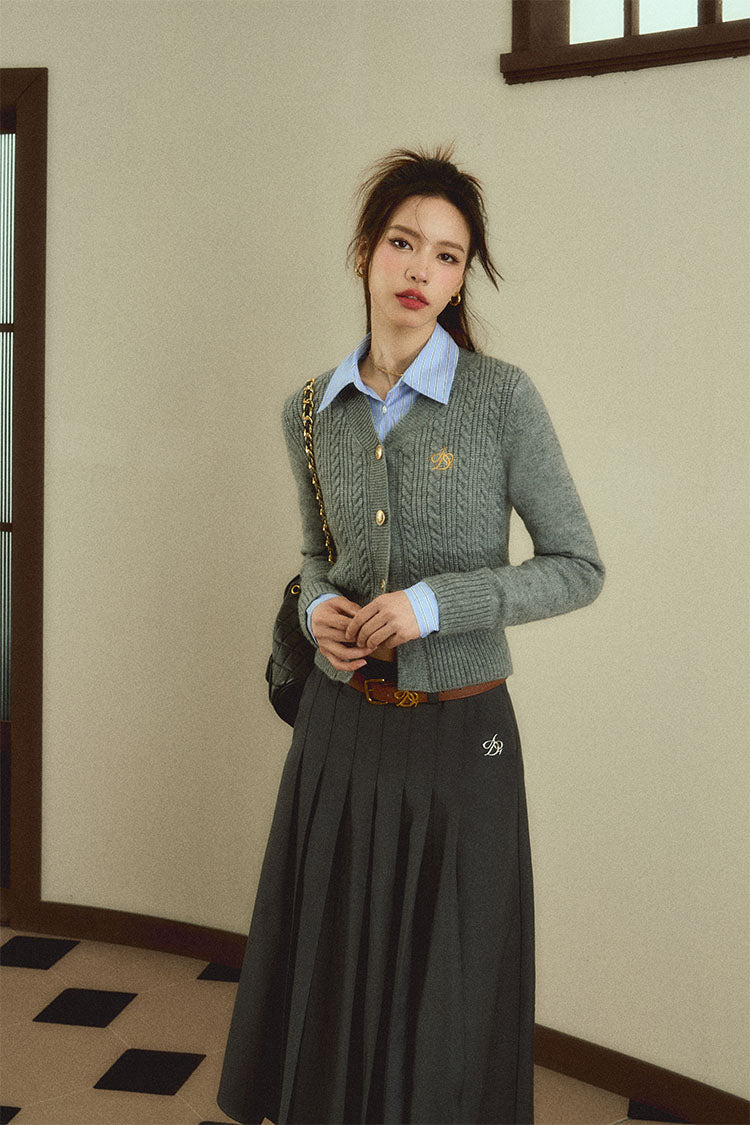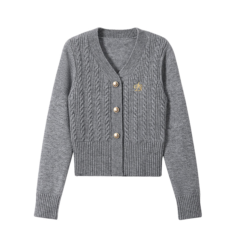 Expertly crafted from soft, durable materials, our Classic Gray Cable Knit Cardigan is the perfect addition to any wardrobe. With a timeless v-neck design and convenient button-front closure, this sweater is both fashionable and comfortable. The embroidered logo adds a touch of sophistication.