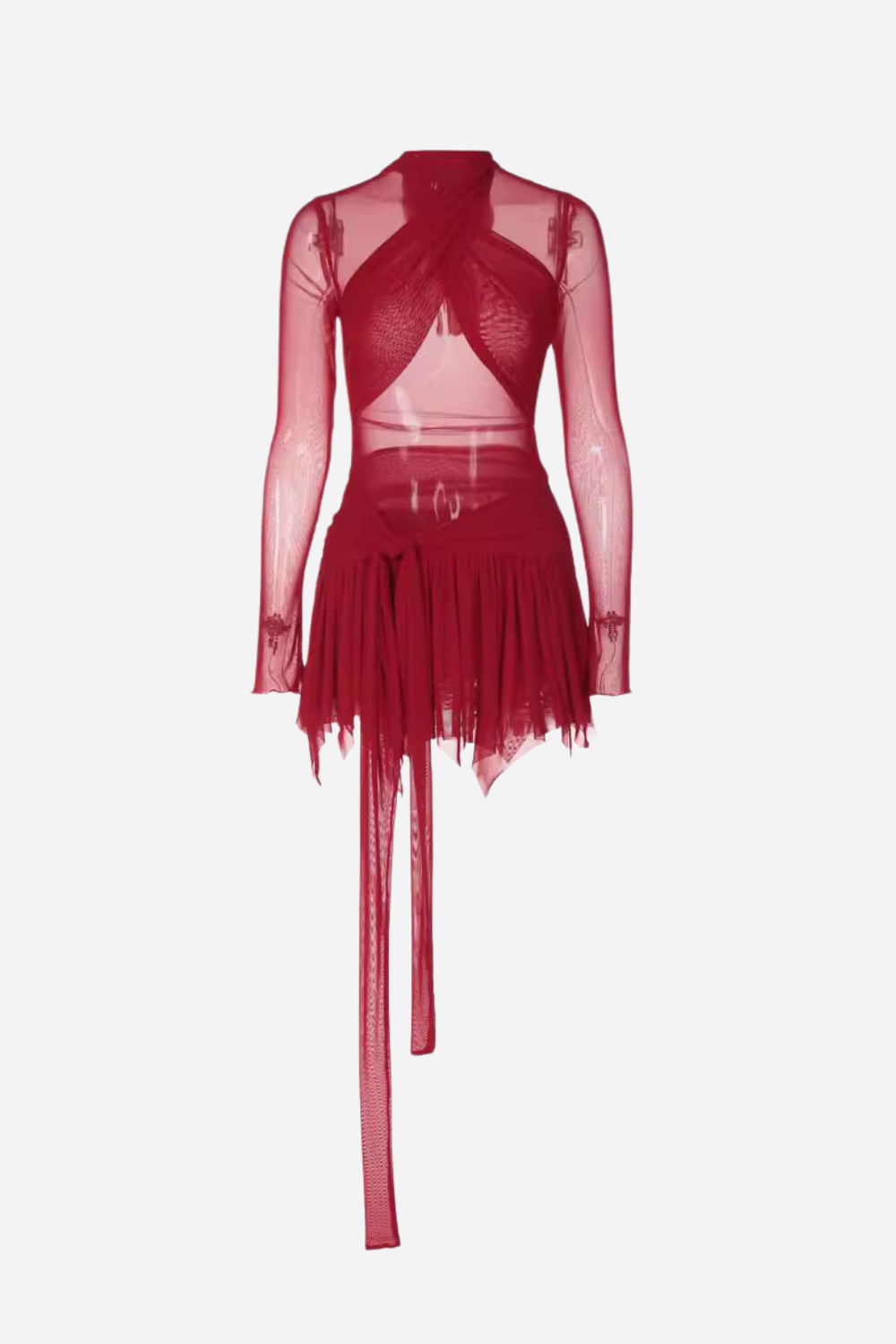 Unleash your inner firecracker with our Cross Body Asymmetry Mini Mesh Dress. Its ravishing red hue, daringly sheer mesh, and knotted hip line exude confidence and allure. The cross body straps and flared hem add an audaciously unique touch, while the balletcore aesthetic sets you apart from the crowd. Be bold, be fearless, be unforgettable.