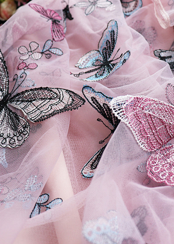 French Pink Embroidered Butterfly High Waist Tulle Skirt Spring