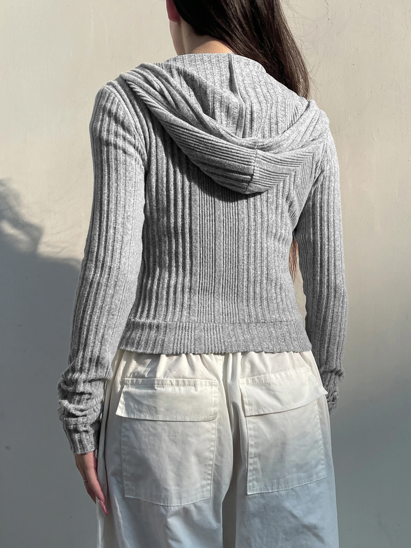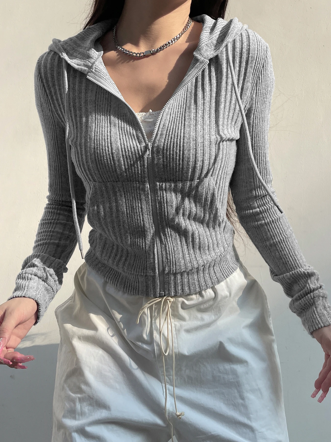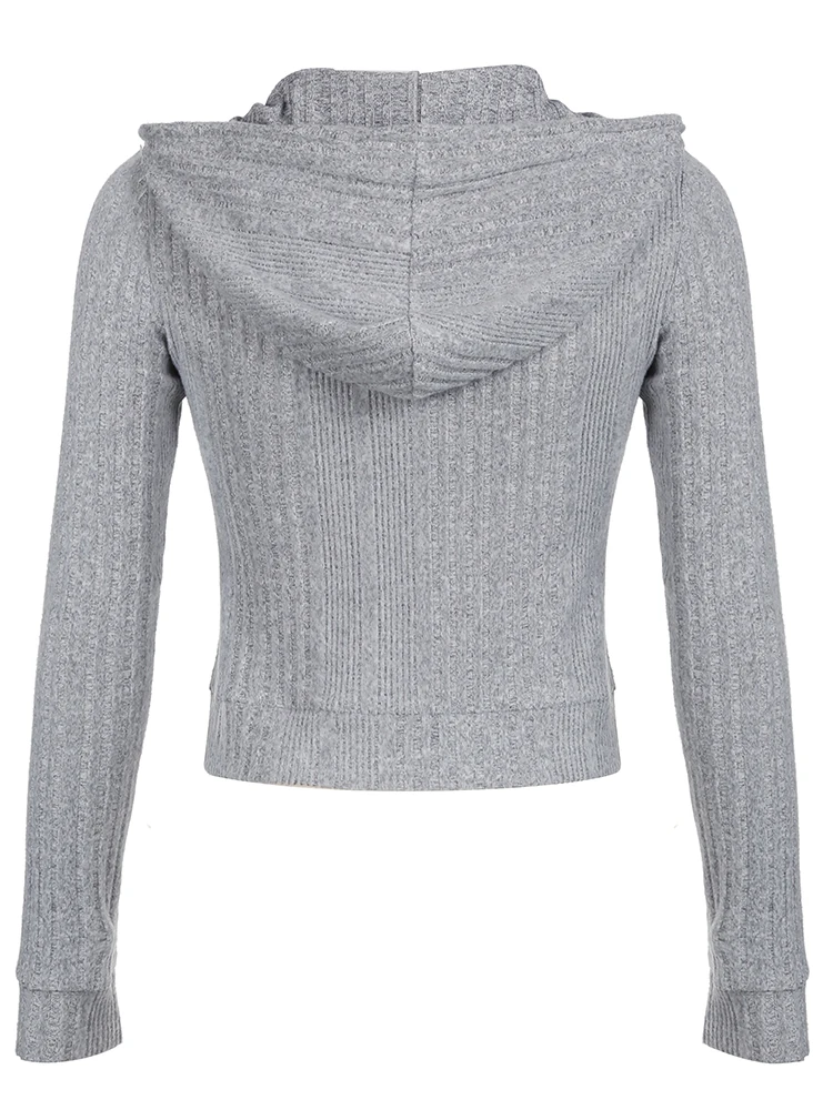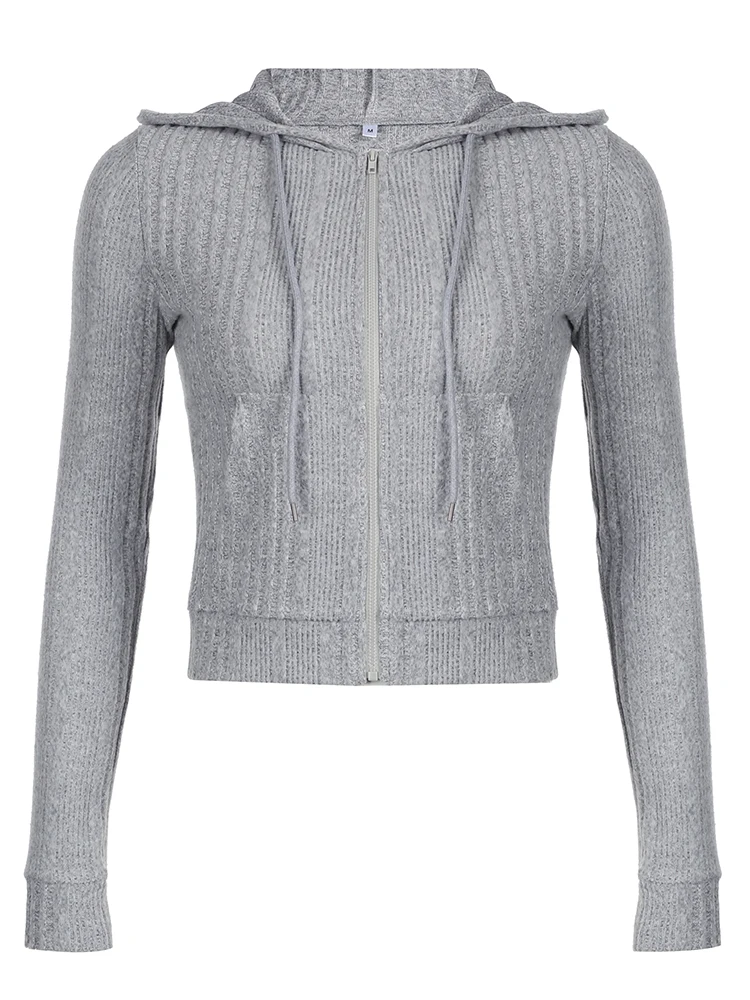 Gray Zip Up Knitted Hooded Jackets Women Pockets Details Solid Simple Basic Minimalist Slim Long Sleeve Hoodies Knitwear