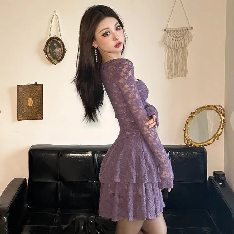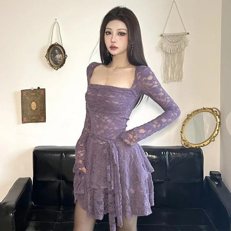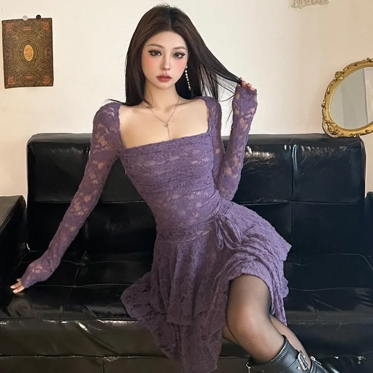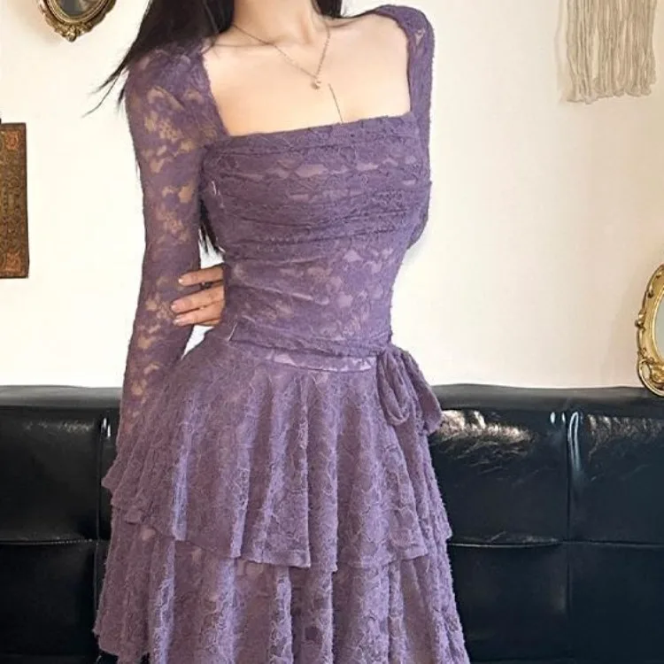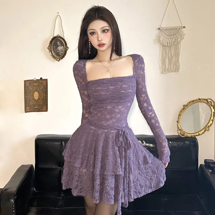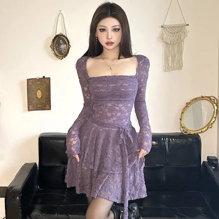 Lace Causal Women Dress Square Collar Slim Waist Tunic All Match Dresses Y2k Aesthetic Sexy Fashion Elegant Vestidos