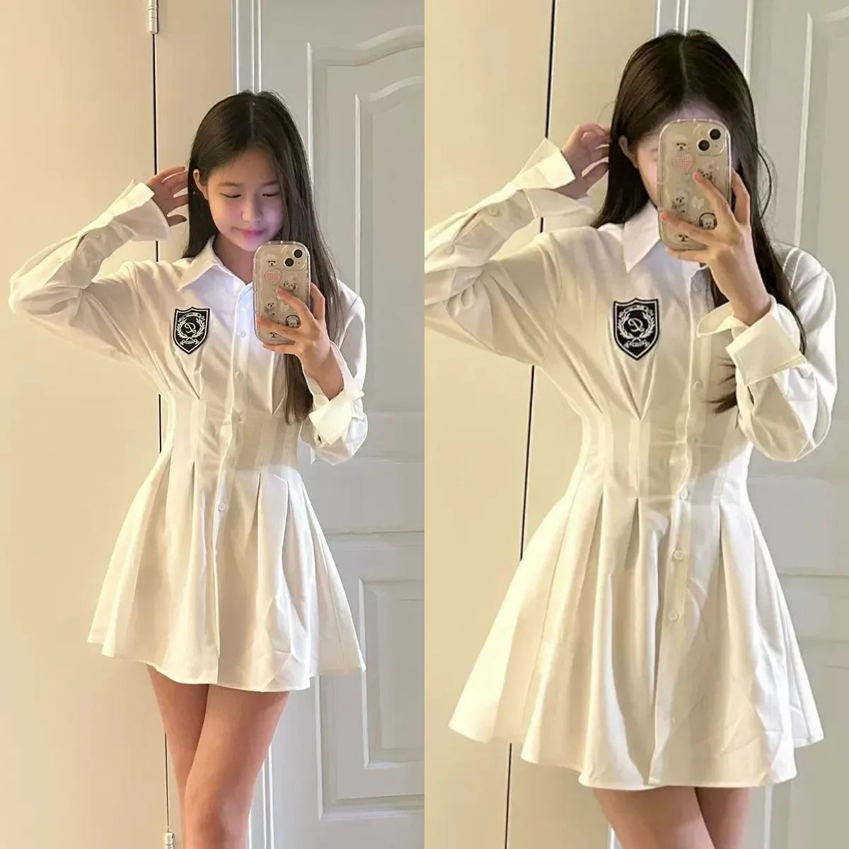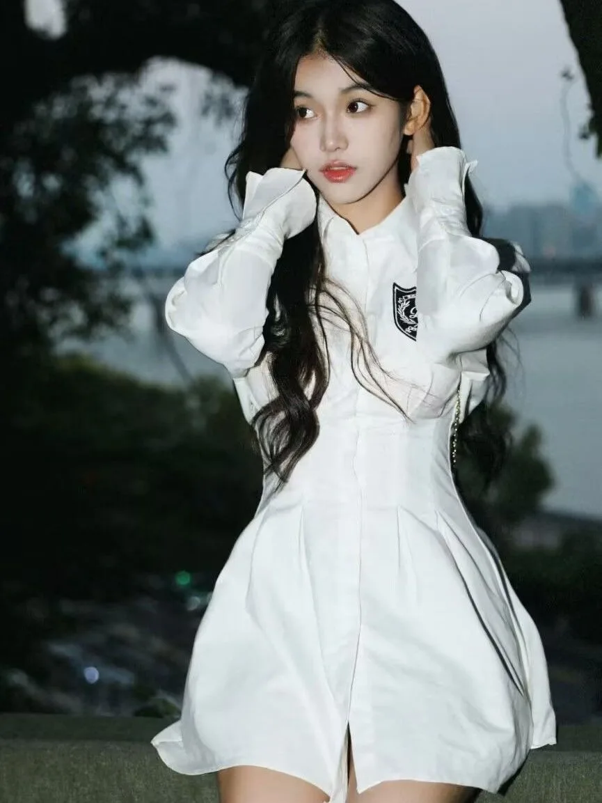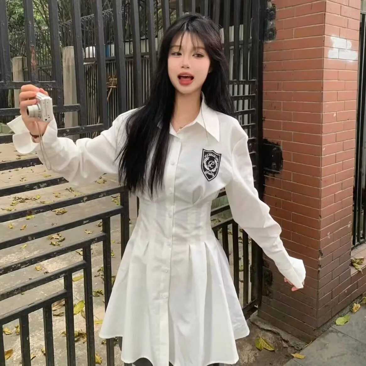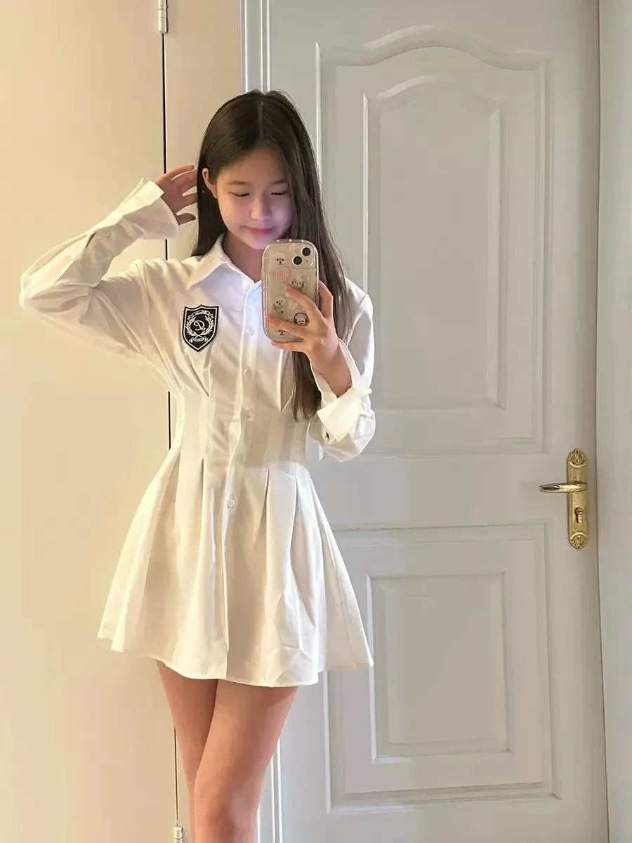 KYLETHOMASW - 2024 New Autumn Korean College Style Dress Women Casual Polo Collar Waist White Shirt Short Dresses Elegant Long Sleeves Dresses