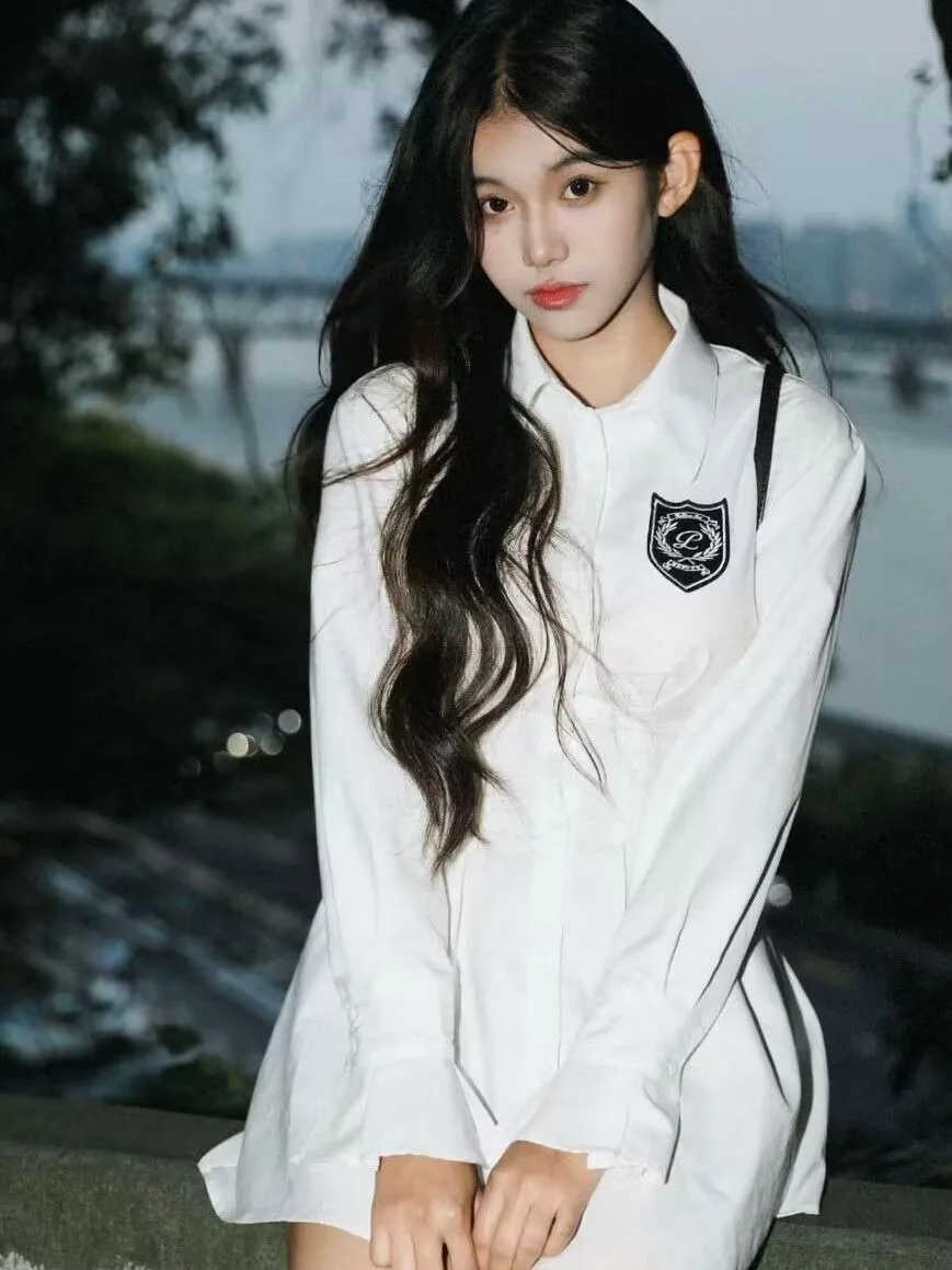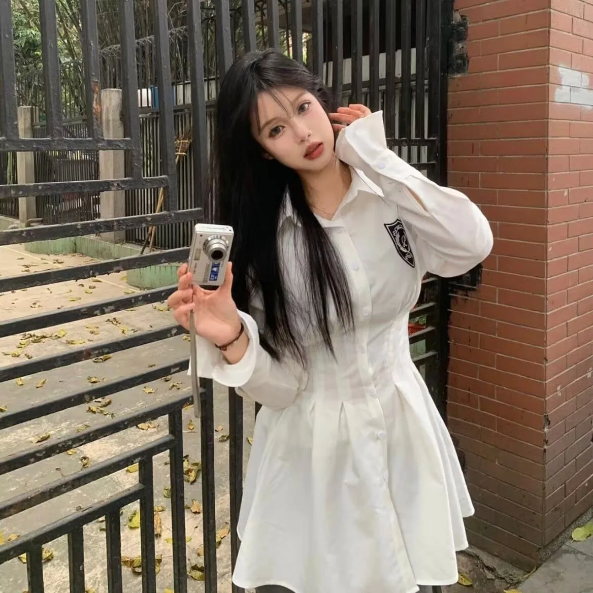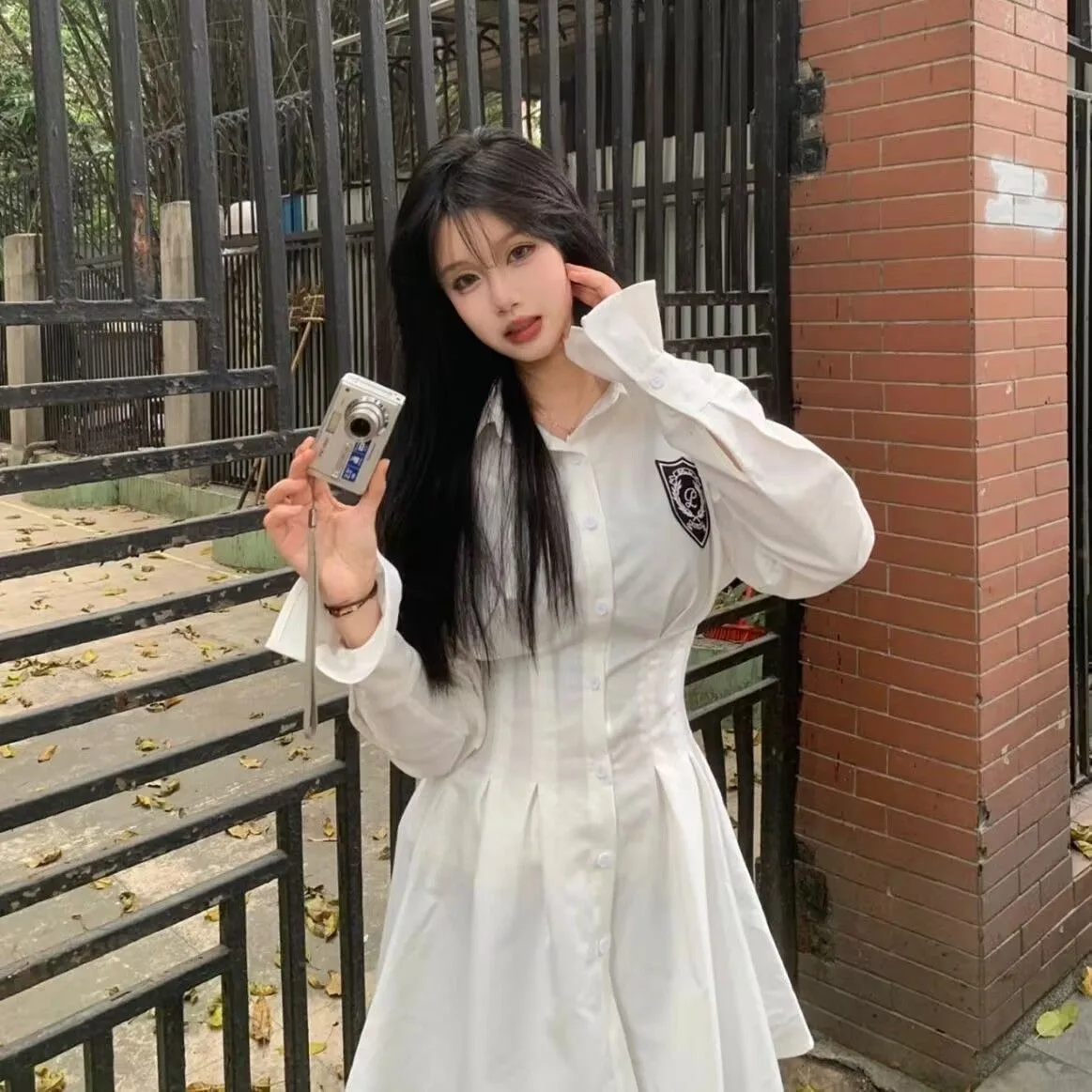 KYLETHOMASW - 2024 New Autumn Korean College Style Dress Women Casual Polo Collar Waist White Shirt Short Dresses Elegant Long Sleeves Dresses