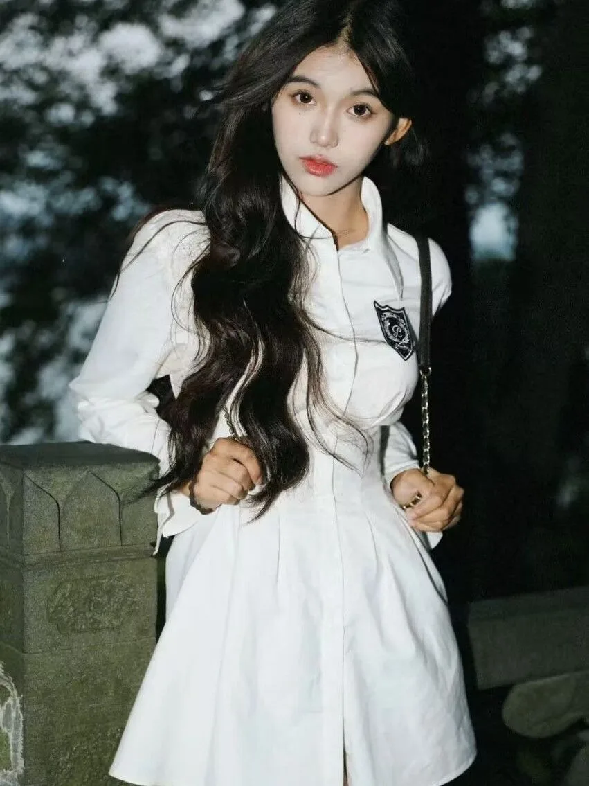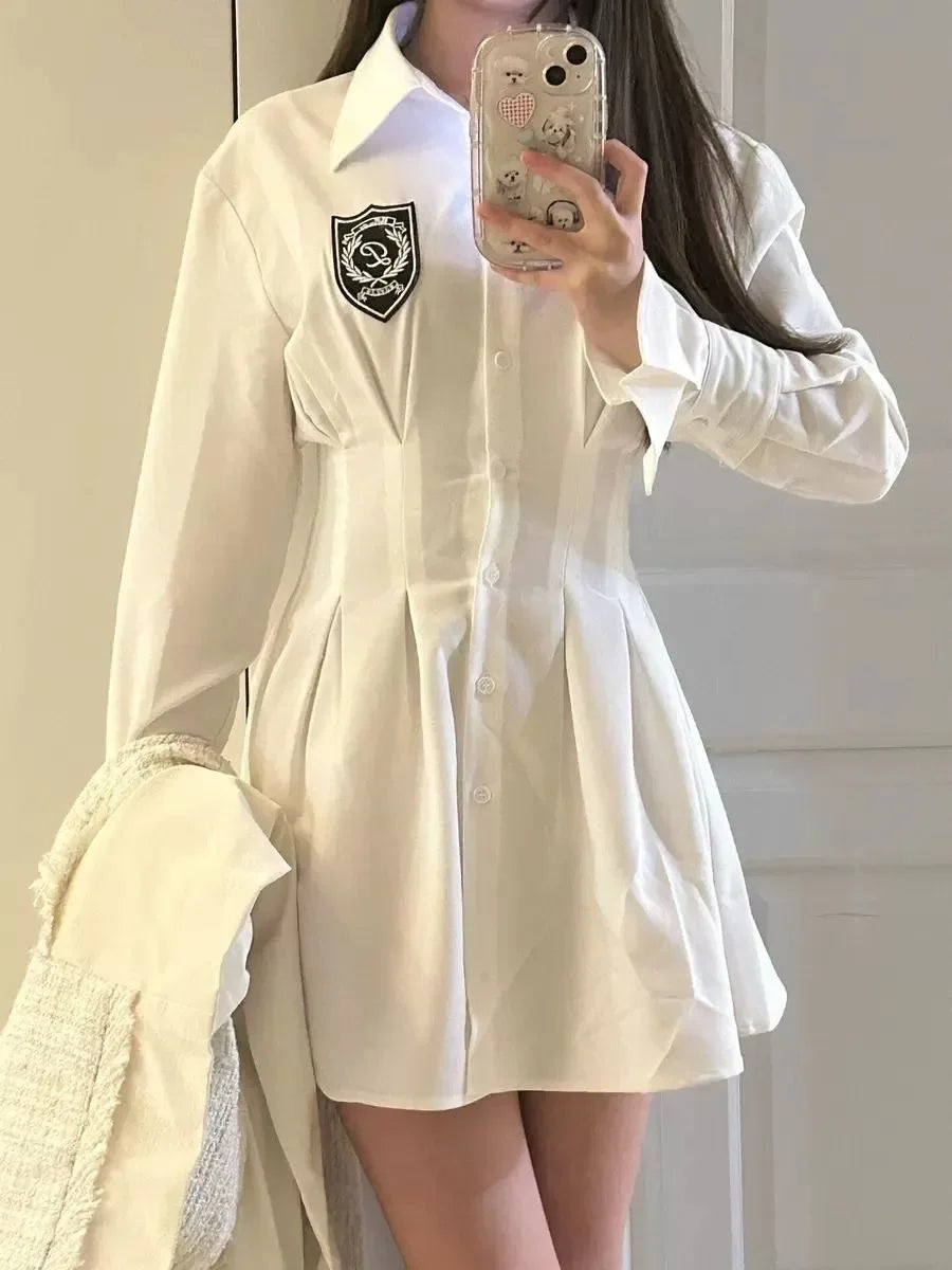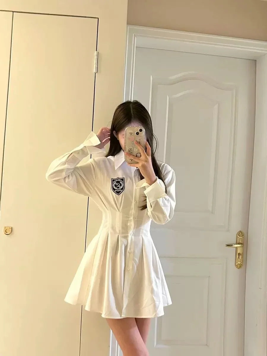 2024 New Autumn Korean College Style Dress Women Casual Polo Collar Waist White Shirt Short Dresses Elegant Long Sleeves Dresses