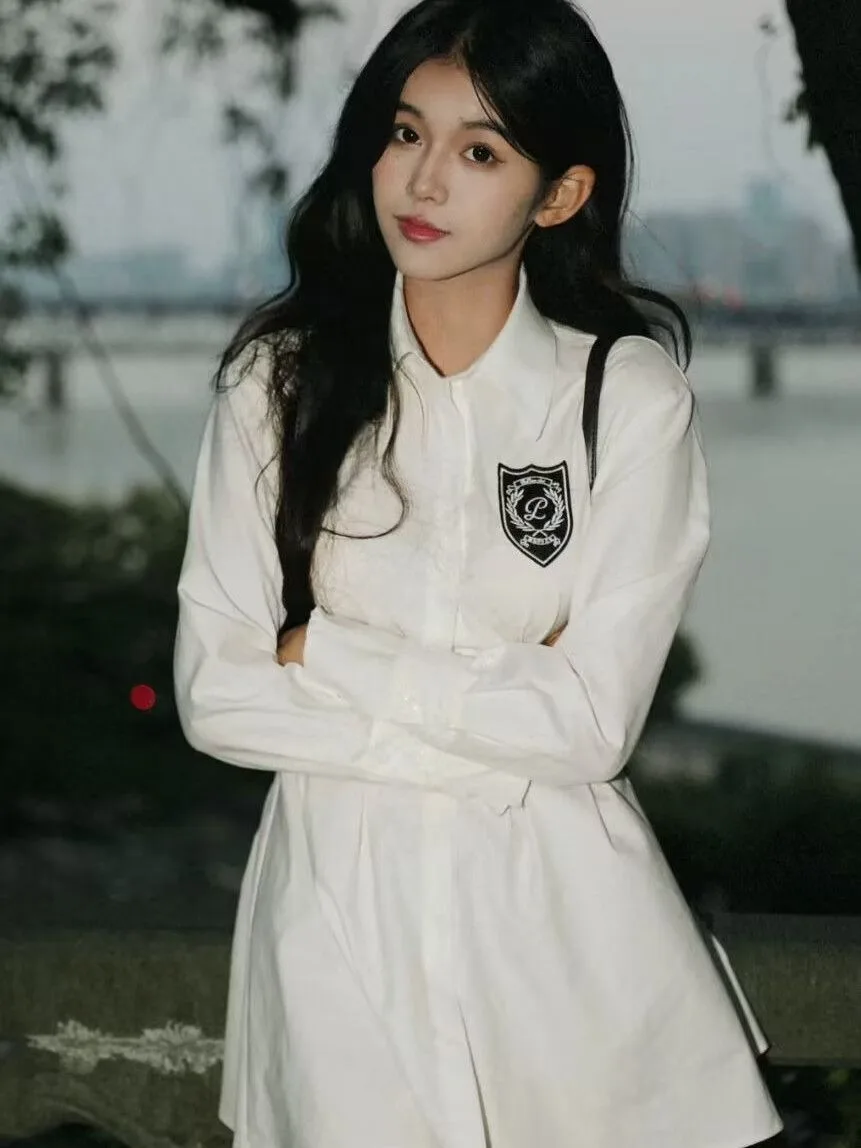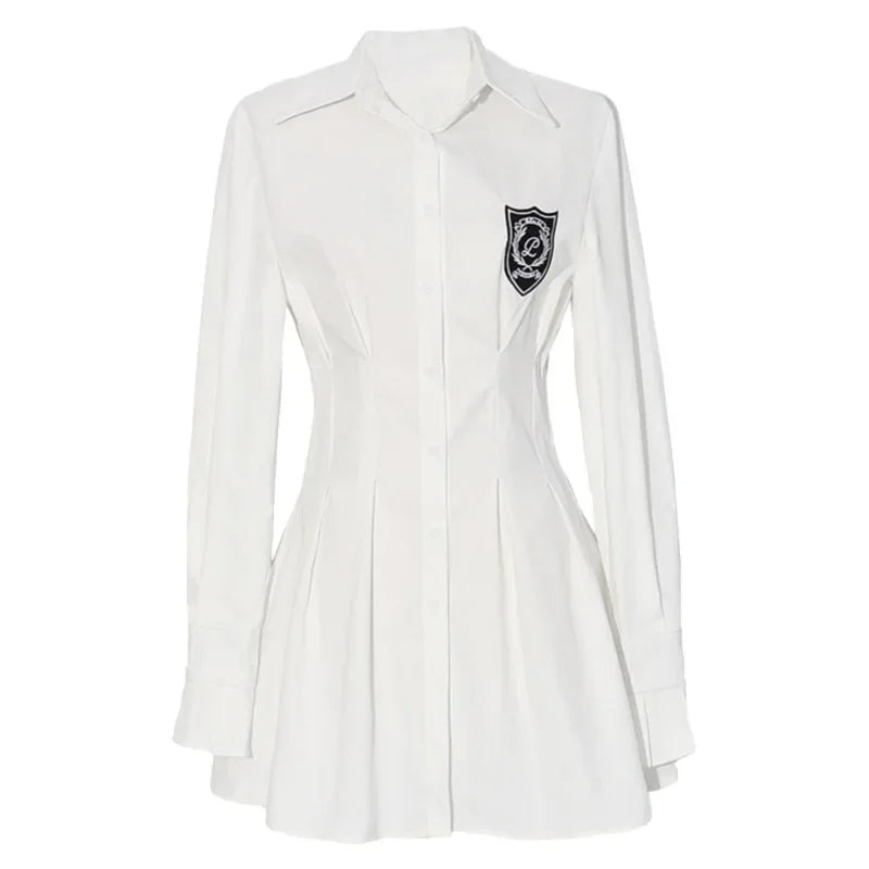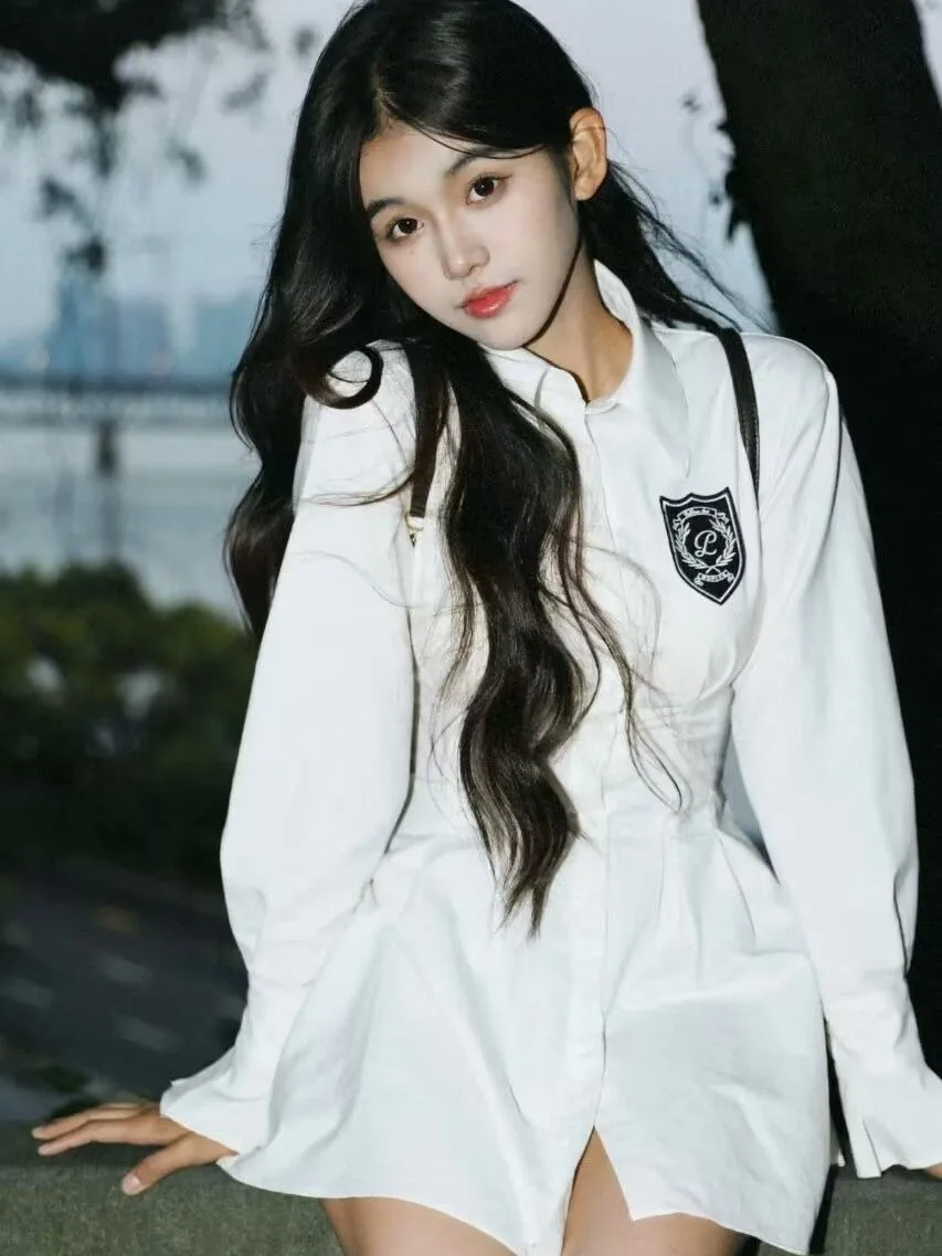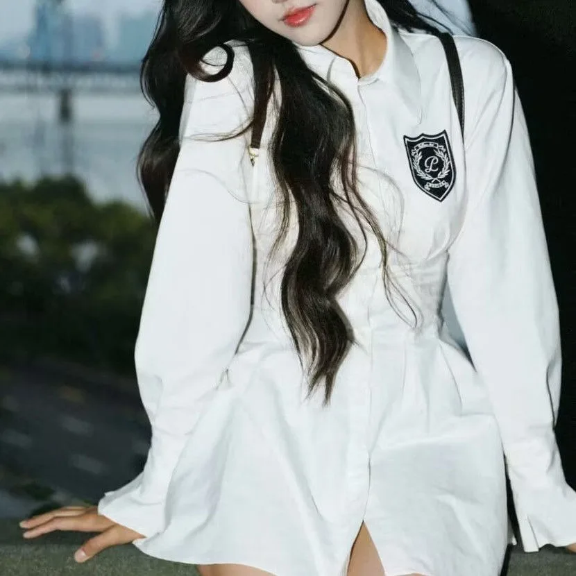 2024 New Autumn Korean College Style Dress Women Casual Polo Collar Waist White Shirt Short Dresses Elegant Long Sleeves Dresses