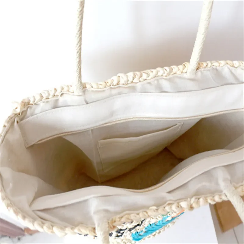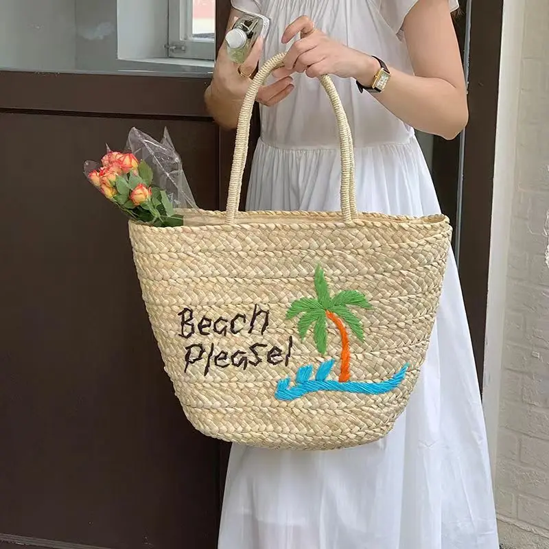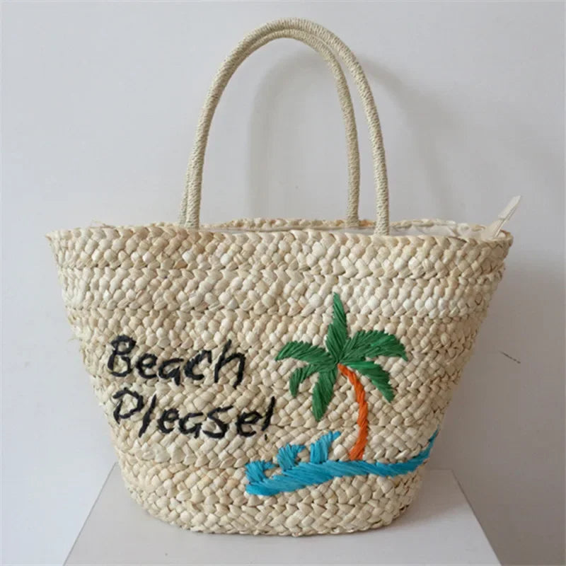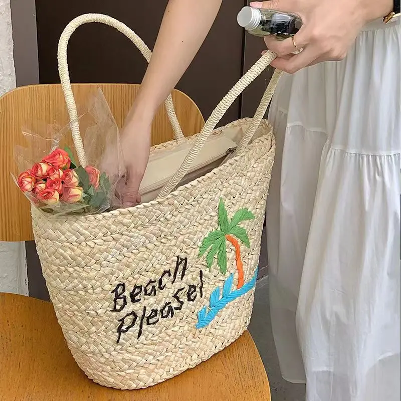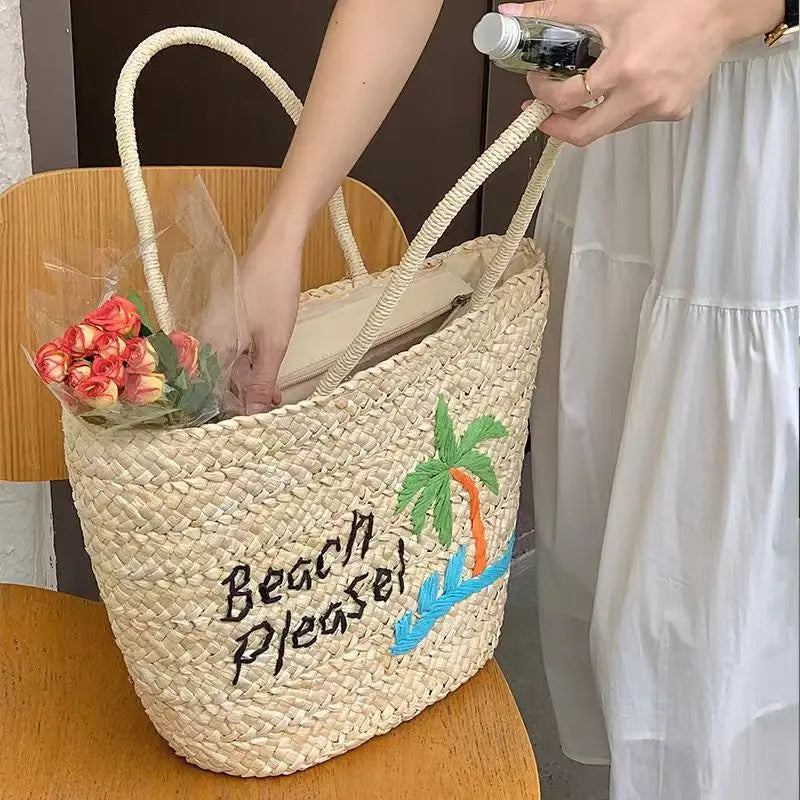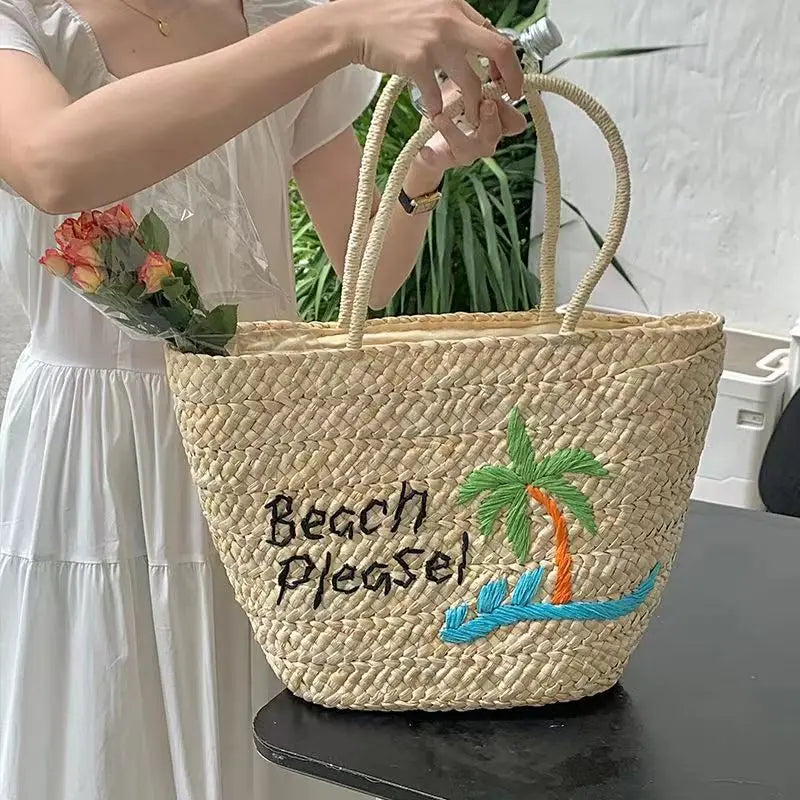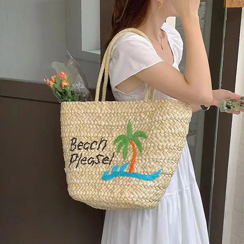 KYLETHOMASW - 2024 Summer Women's Large Capacity Coconut Tree Straw Bag Bohemia Bali Hand Woven Rattan Tote Bag Seaside Vacation Beach Handbag