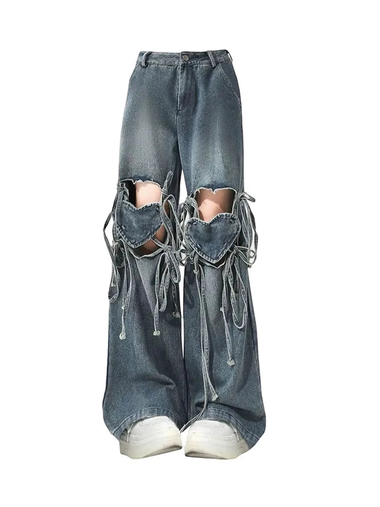 Kylethomasw American Vintage Trousers Style Ripped Hole Love Heart Lace Up Jeans Summer Blue Cozy Casual Wide Leg Pants Sexy Sweet Harajuku