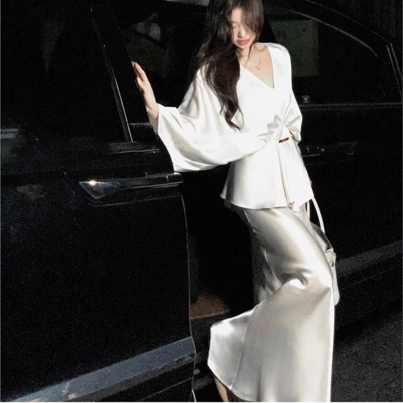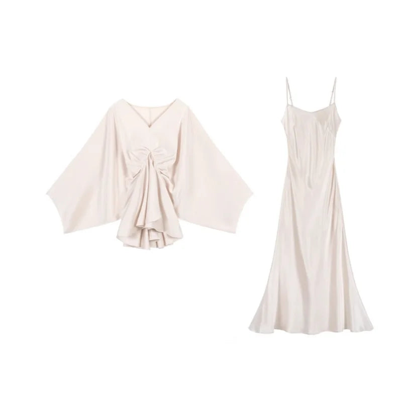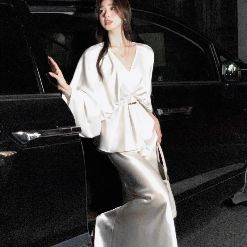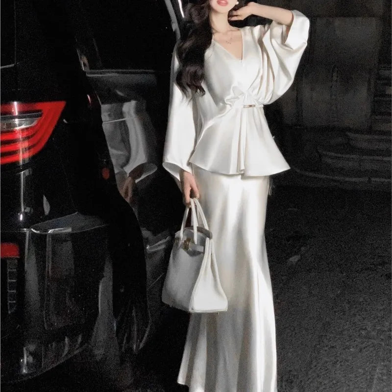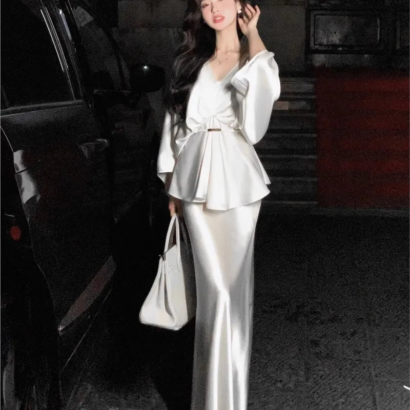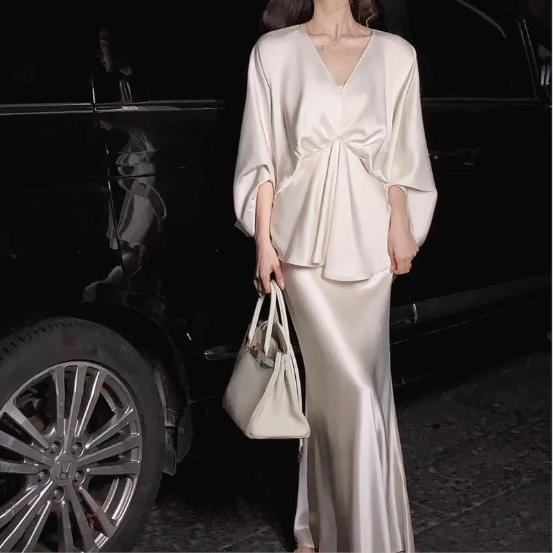 KYLETHOMASW - Autumn New Elegant Satin Two-piece Dress Set Women Wedding Evening Party Dress V-neck Top Slip Mermaid Dress Prom Robe Outfits