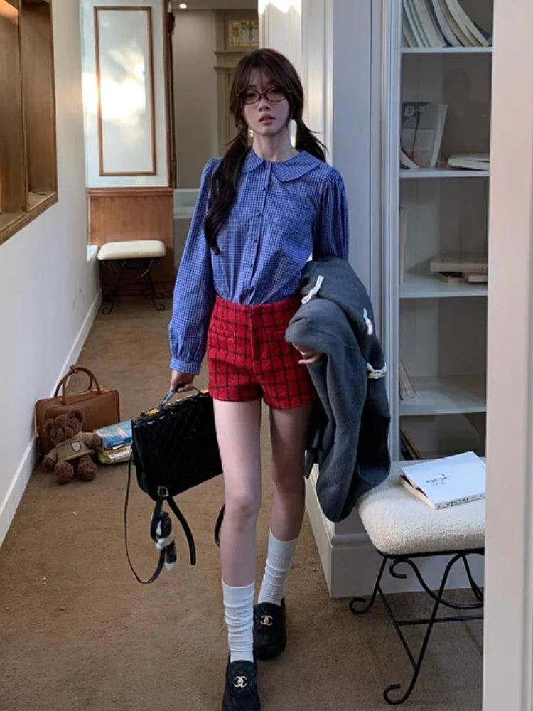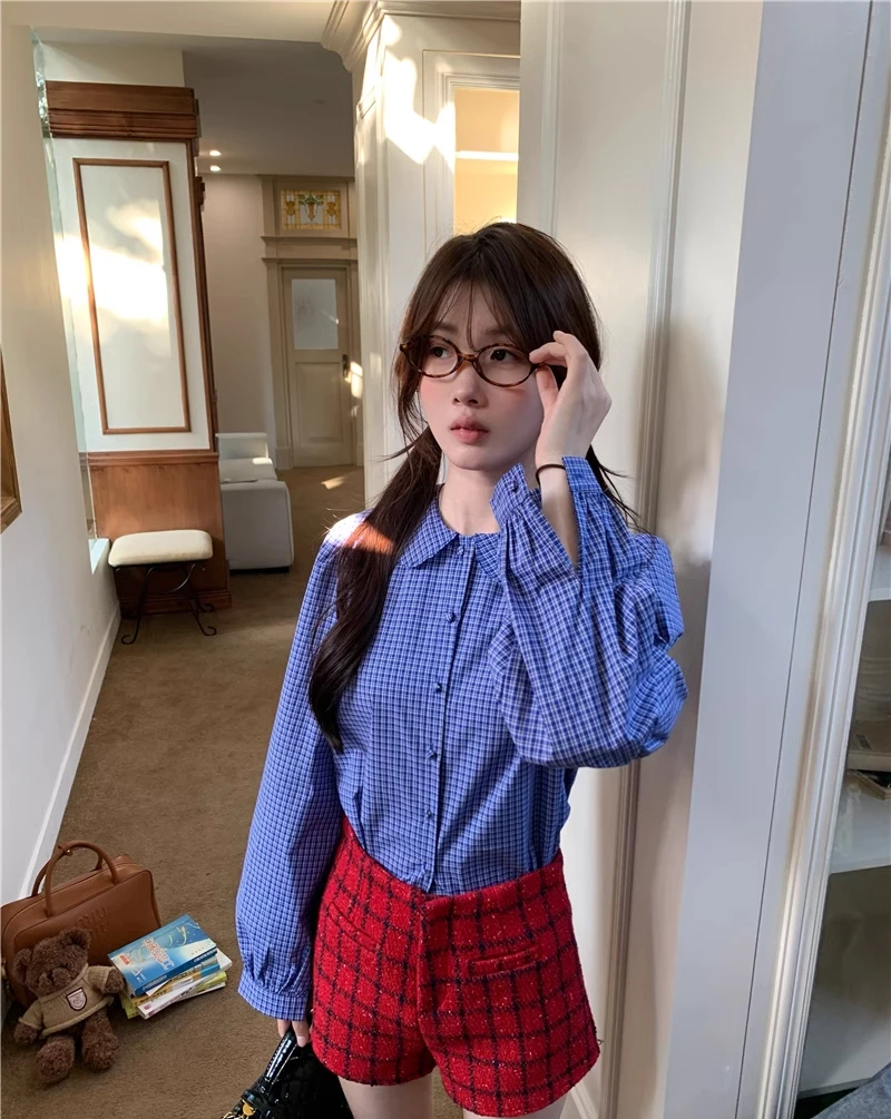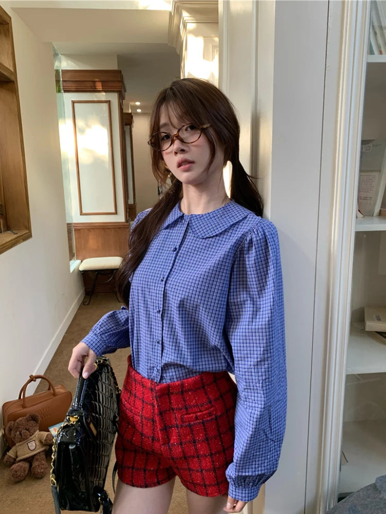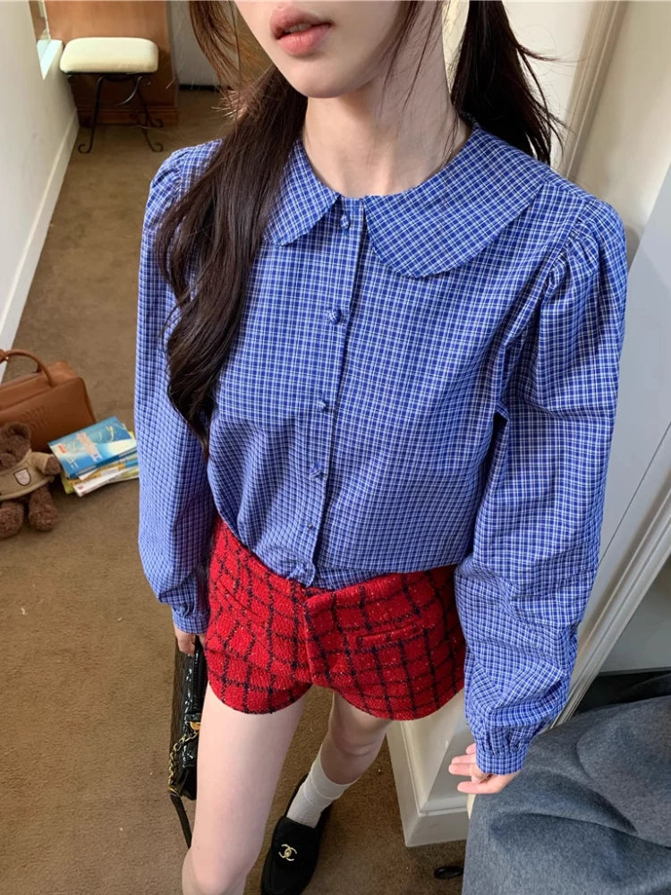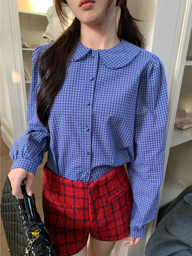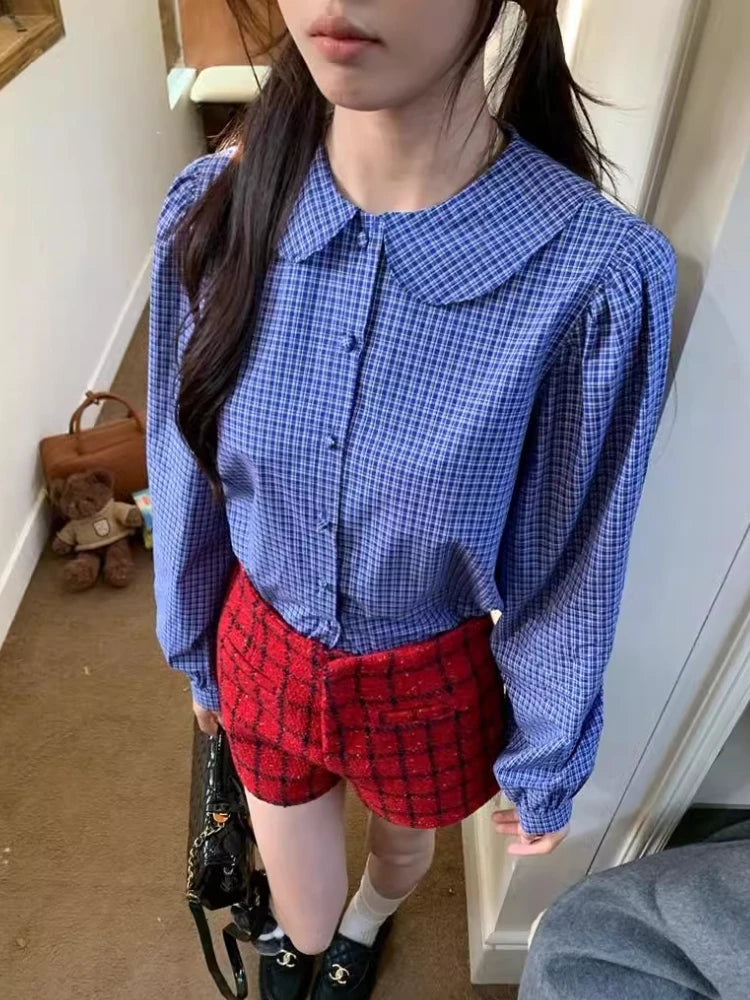 Kylethomasw Blue Plaid Shirt Women Kawaii Peter Pan Collar Blouse Female Preppy Style Puff Sleeve Top with Teen Girl Spring Clothes