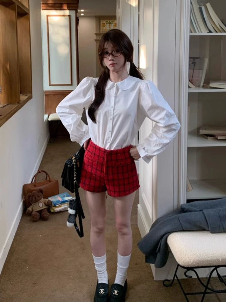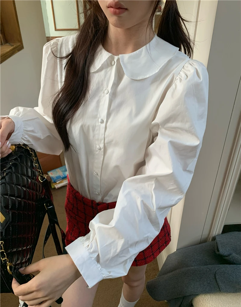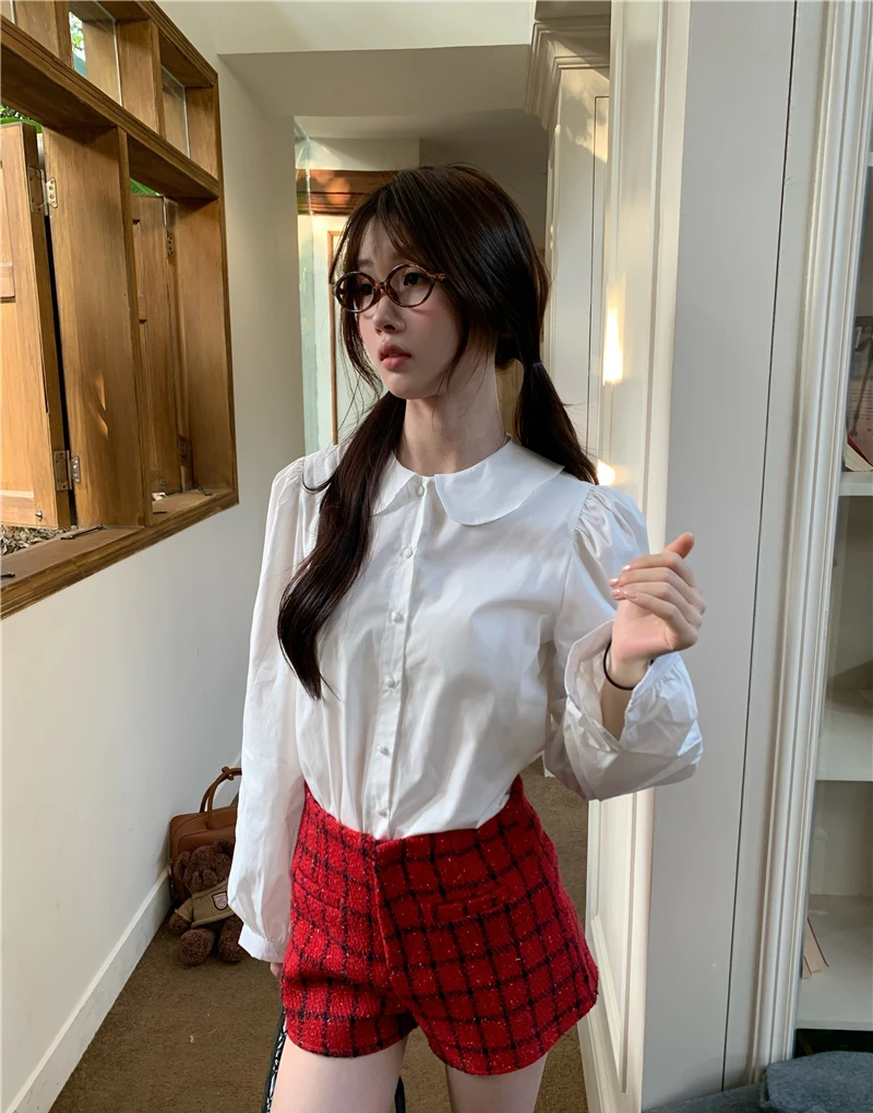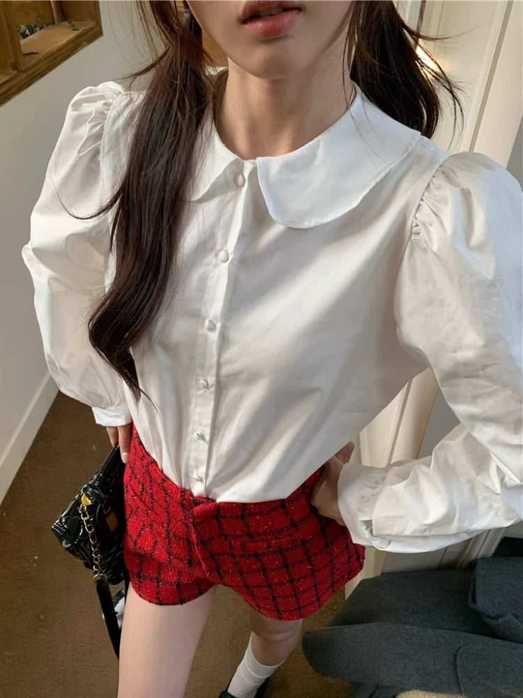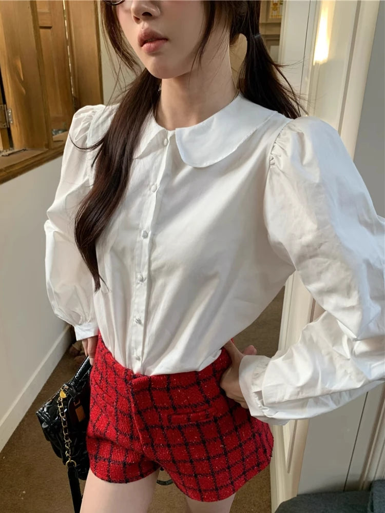 Kylethomasw Blue Plaid Shirt Women Kawaii Peter Pan Collar Blouse Female Preppy Style Puff Sleeve Top with Teen Girl Spring Clothes