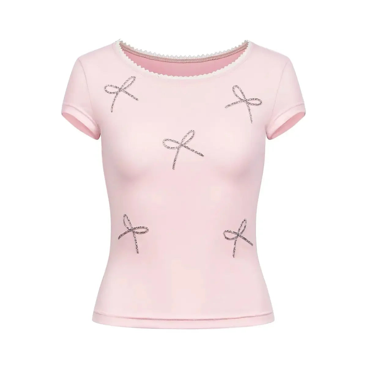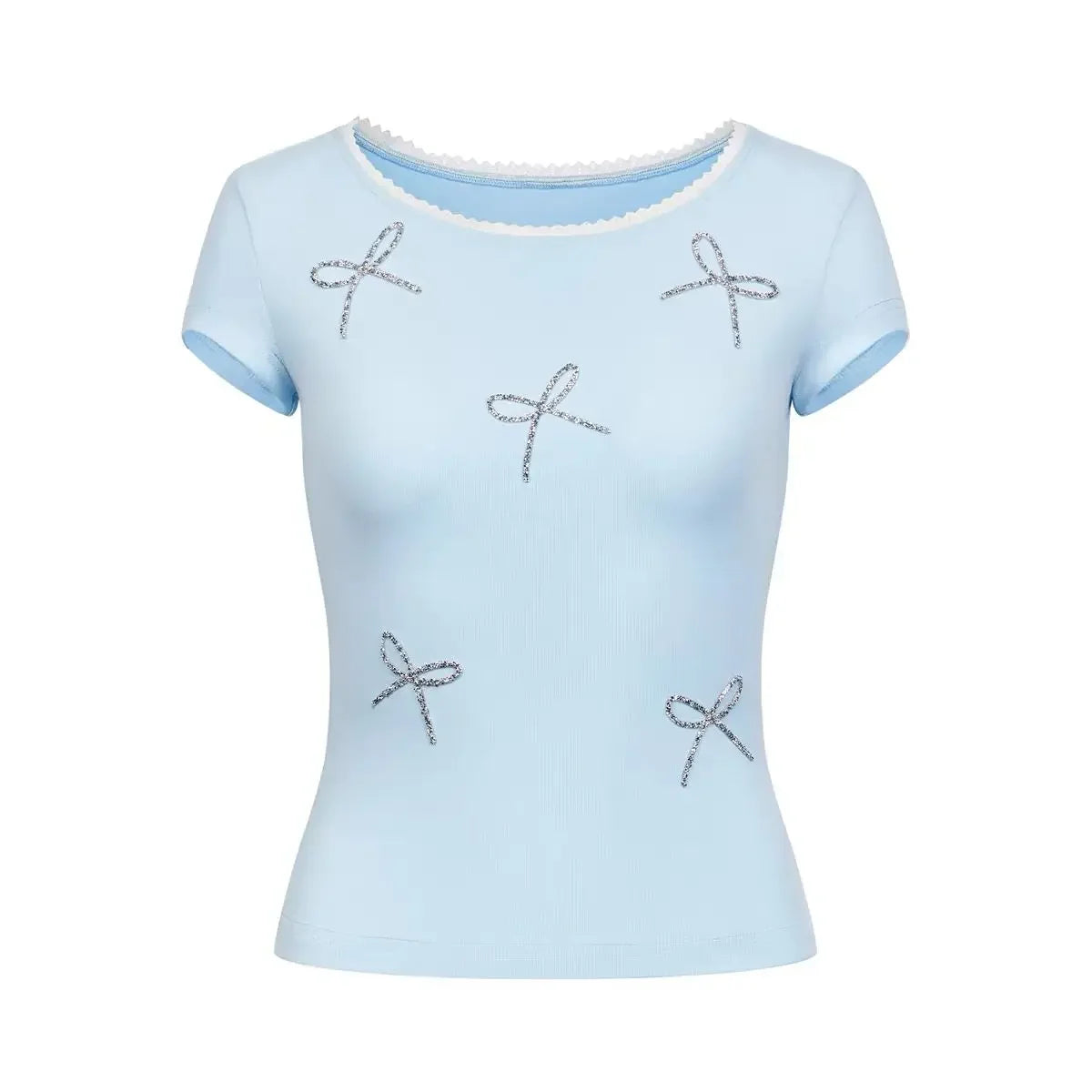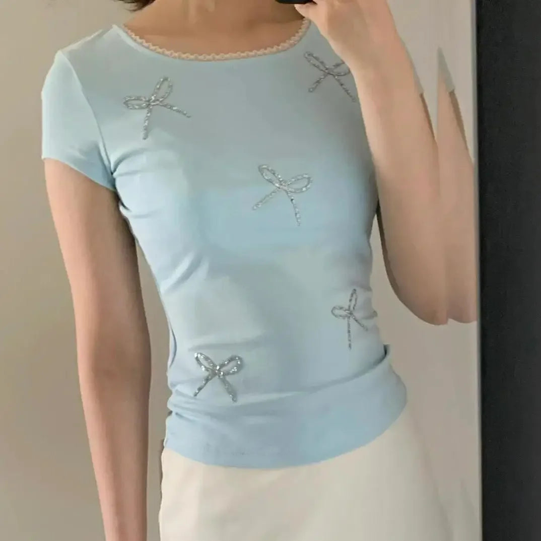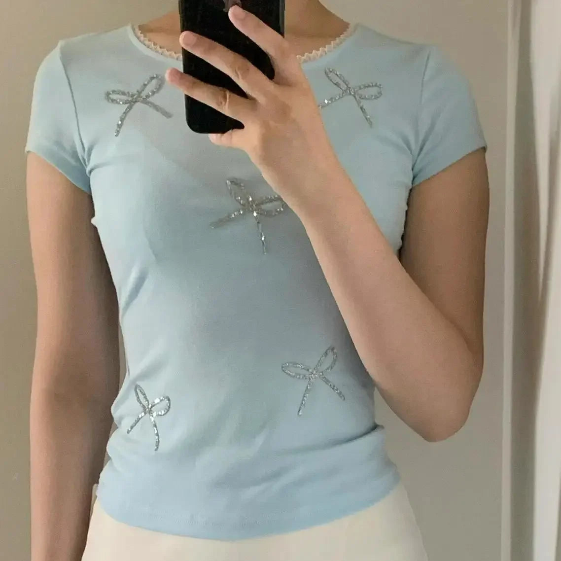 Bow Hot Diamond Tshirt Women Tops Summer American Sweet and Spicy Lace Short Sleeve Slim Short y2k Crop Tops Women Clothing