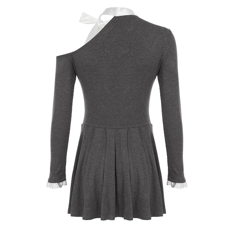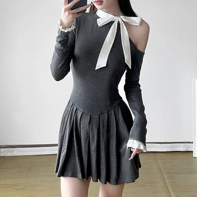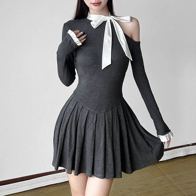 KYLETHOMASW - Contrast Lace-up Bow Off Shoulder Dress Princess Style A-line Pleated Dresses Holiday Party Birthday Outfits Y2K Robe