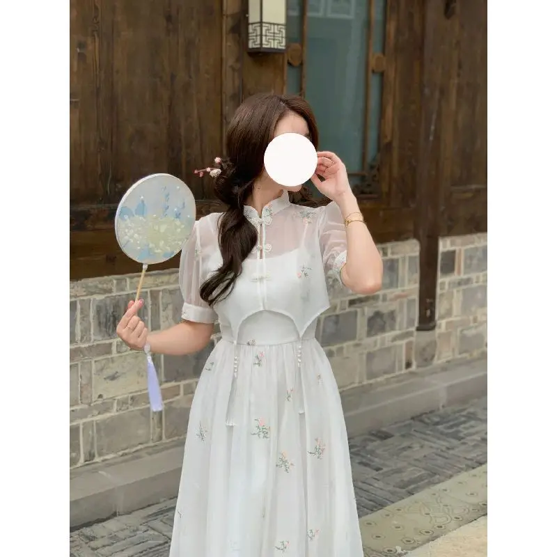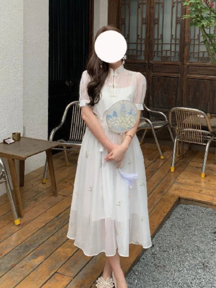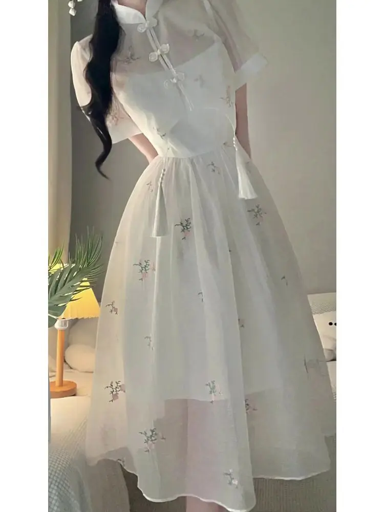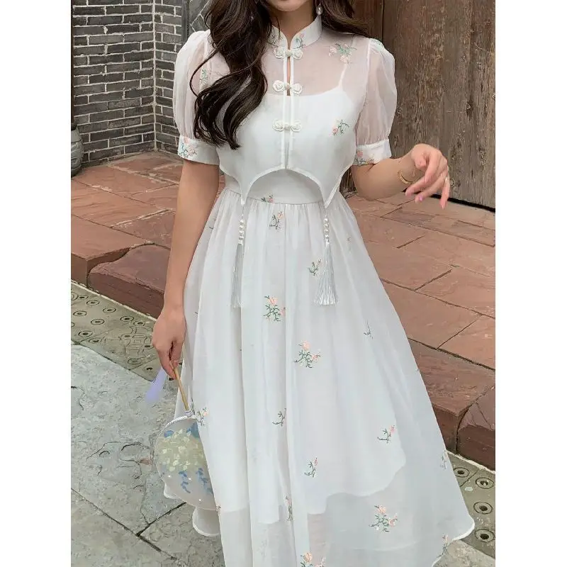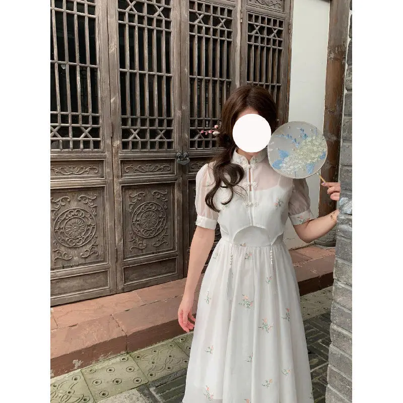 Kylethomasw Dress Sets 2024 Summer Women Chinese Style Floral Hight Waist Mesh Midi Dresses Elegant Casual Gentle Wind Female Dress Vestidos