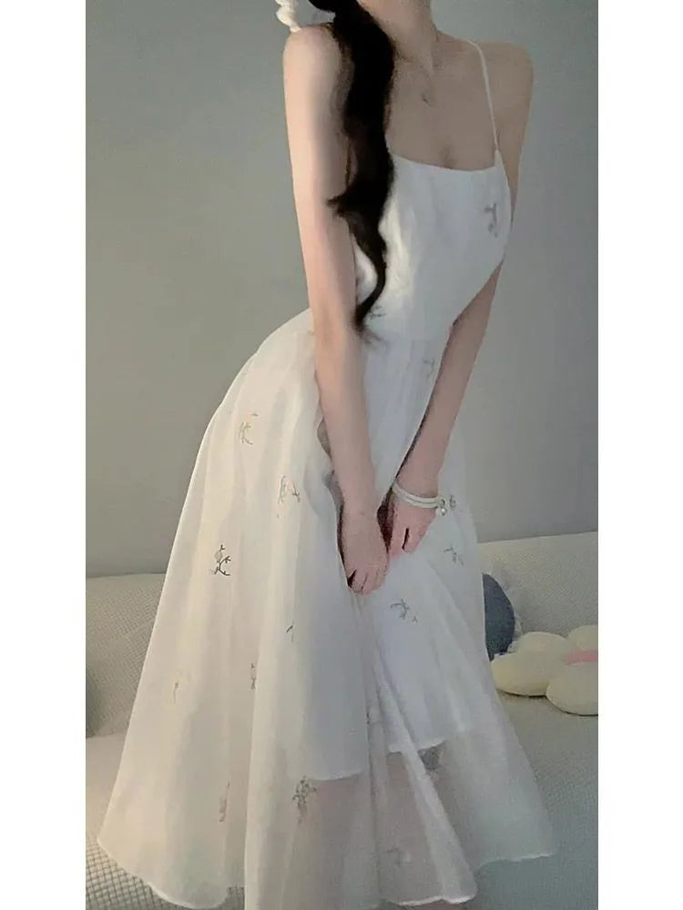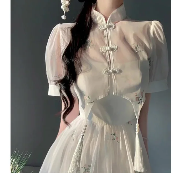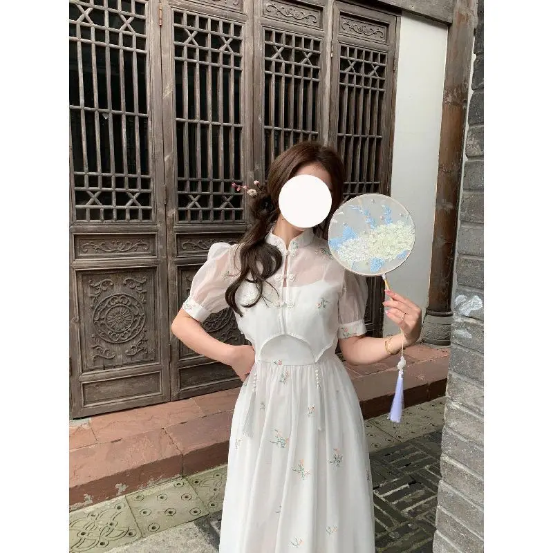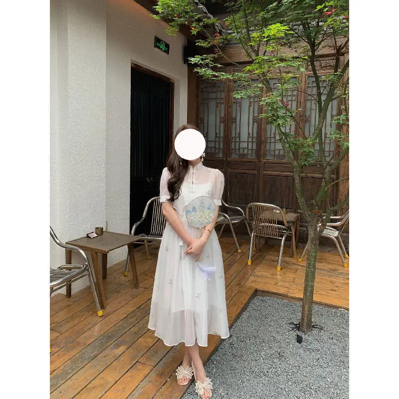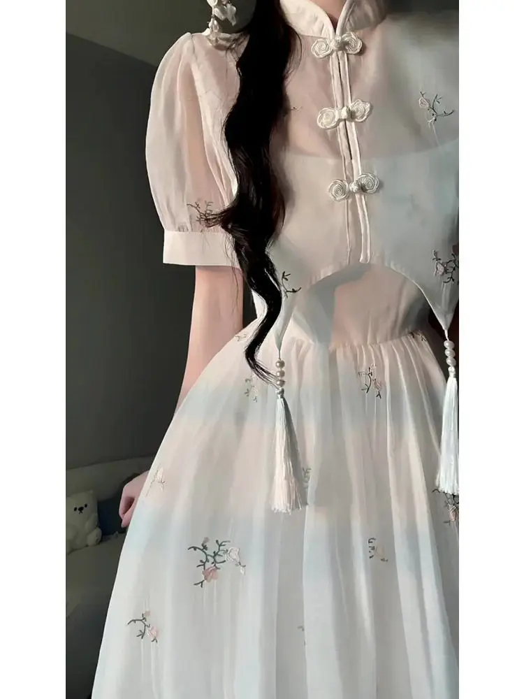 Kylethomasw Dress Sets 2024 Summer Women Chinese Style Floral Hight Waist Mesh Midi Dresses Elegant Casual Gentle Wind Female Dress Vestidos