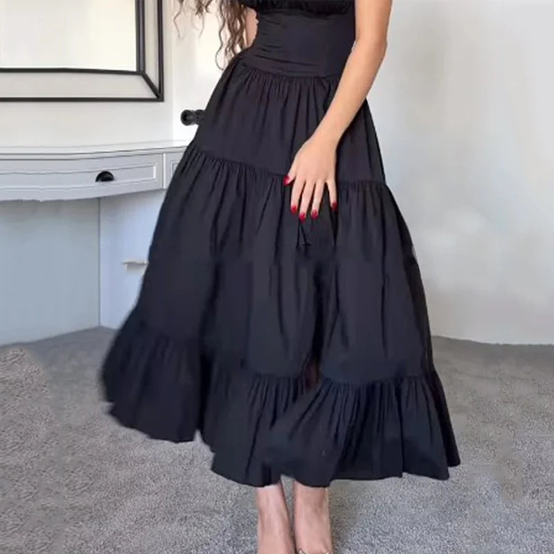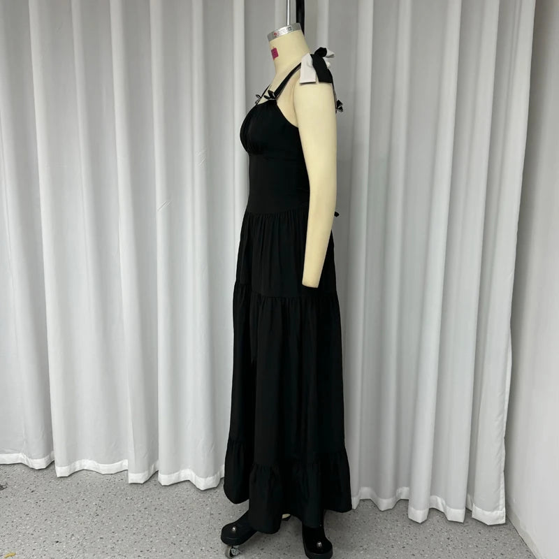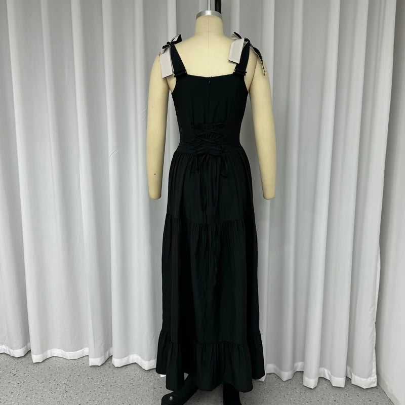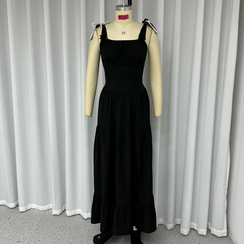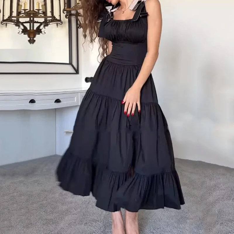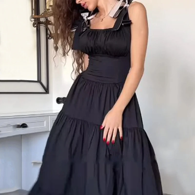 Kylethomasw Dresses Women's Summer Fashion Casual Square Neck Bow Strap Sleeveless Solid Black Pleated Party Long Dress Streetwear
