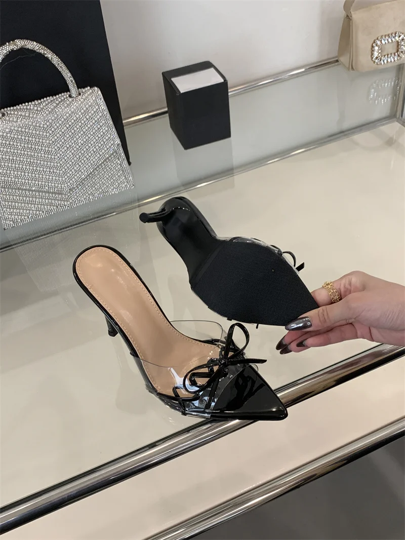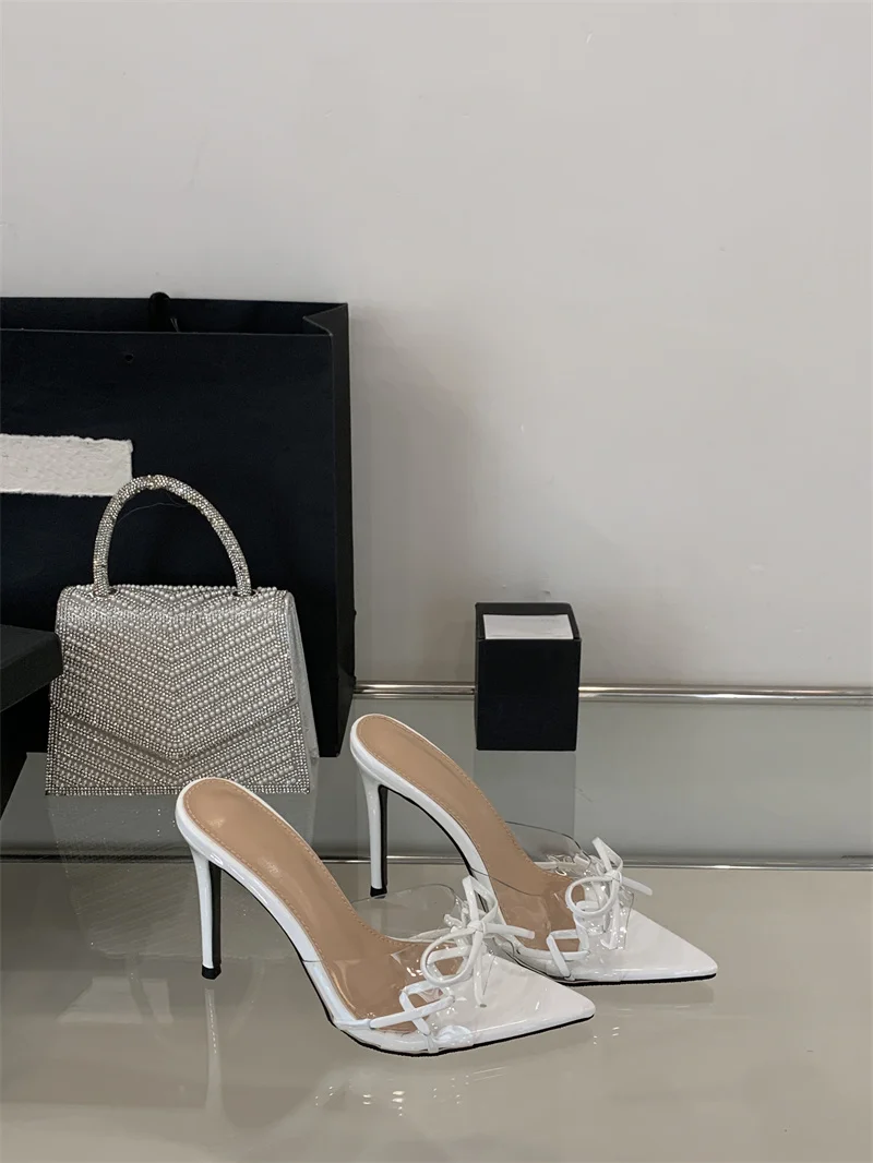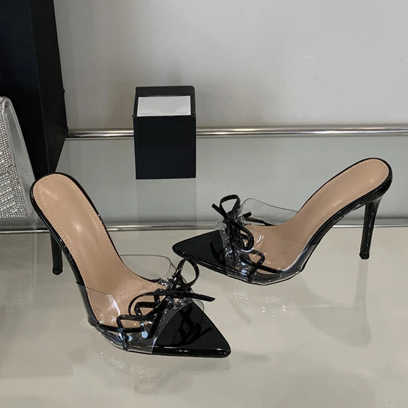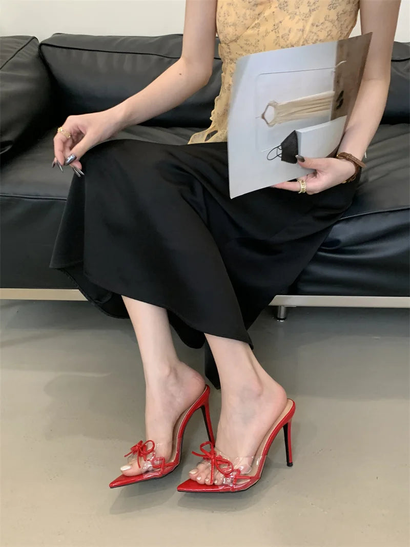 KYLETHOMASW - Elegant Pointed Toe Red High Heels Transparent Slippers Women Leather Bowknot Designer Sandal Summer Party Dress Shoes