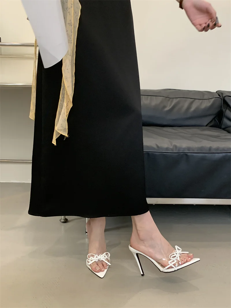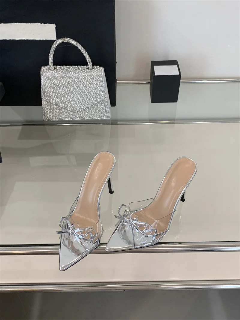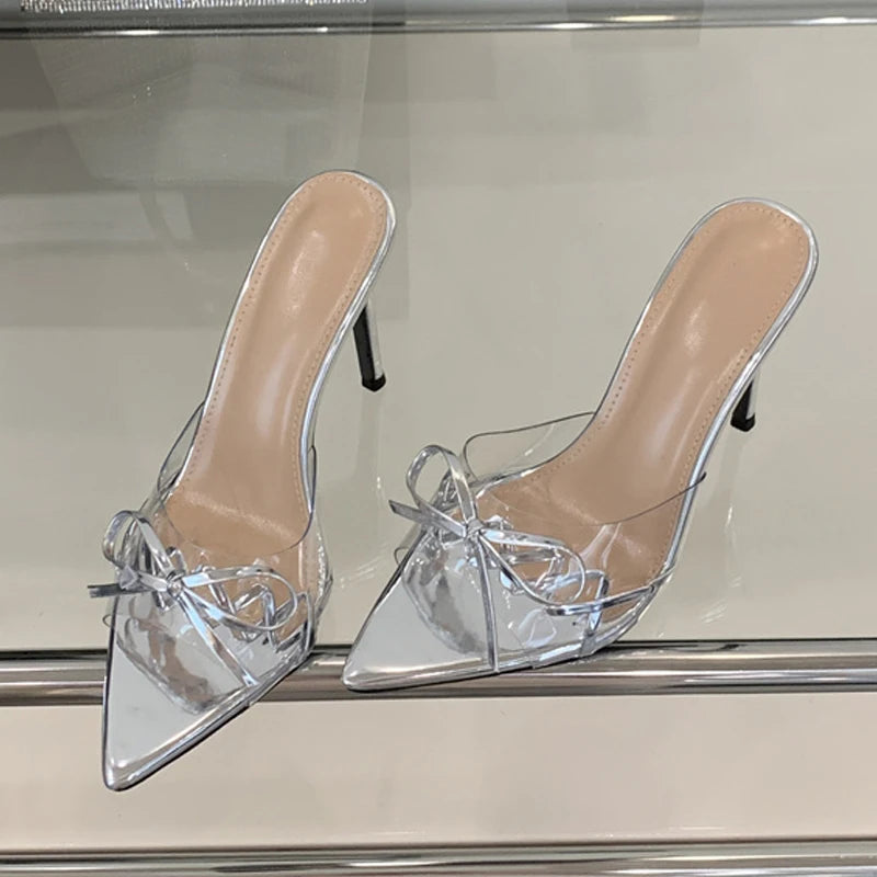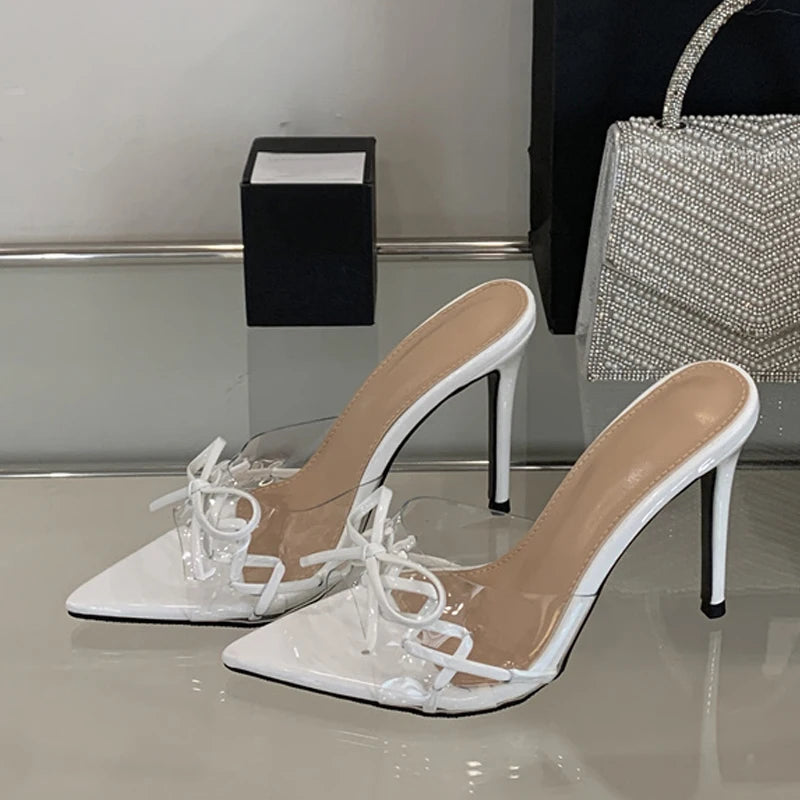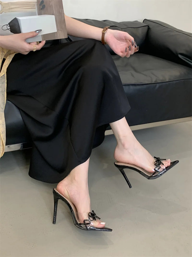 KYLETHOMASW - Elegant Pointed Toe Red High Heels Transparent Slippers Women Leather Bowknot Designer Sandal Summer Party Dress Shoes