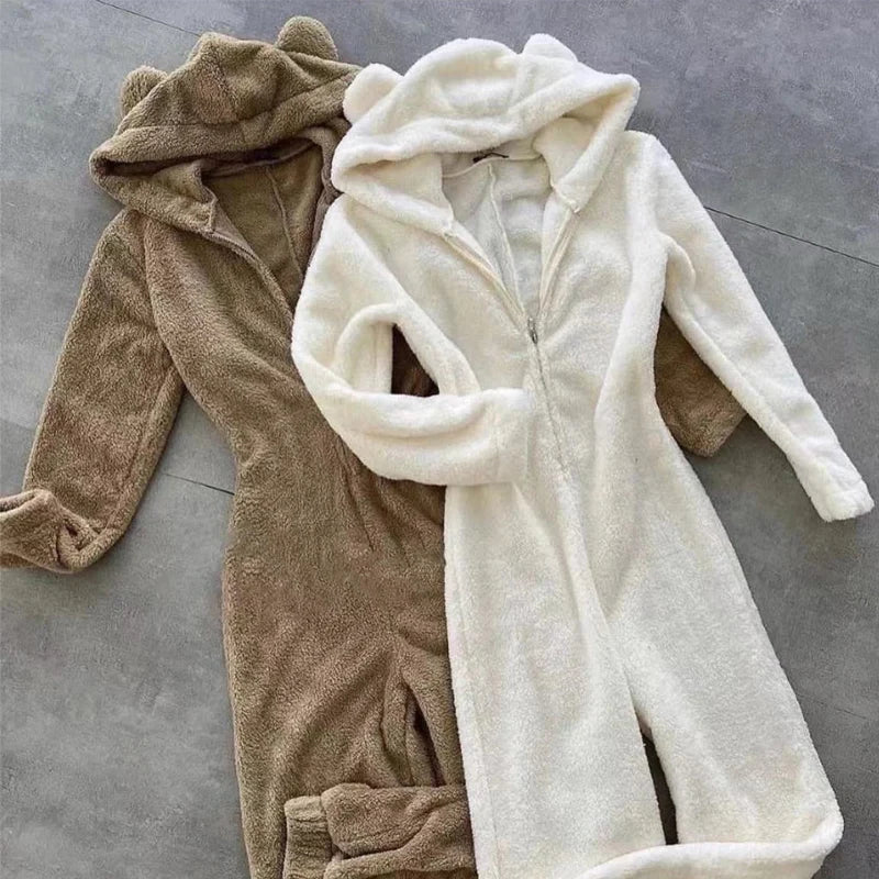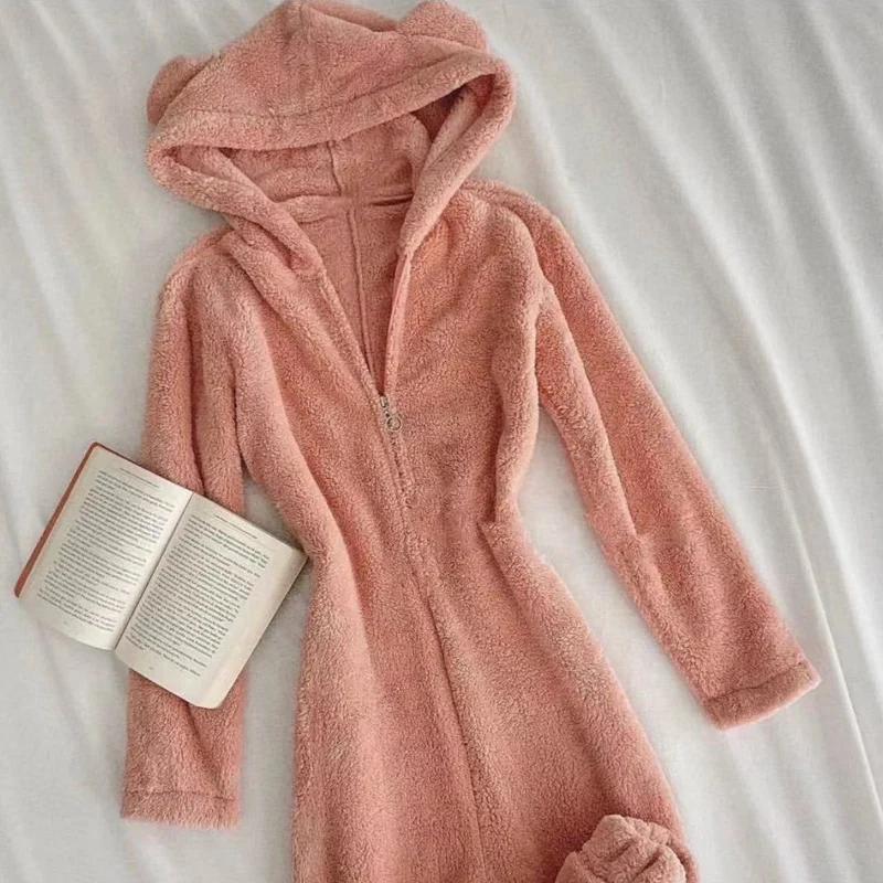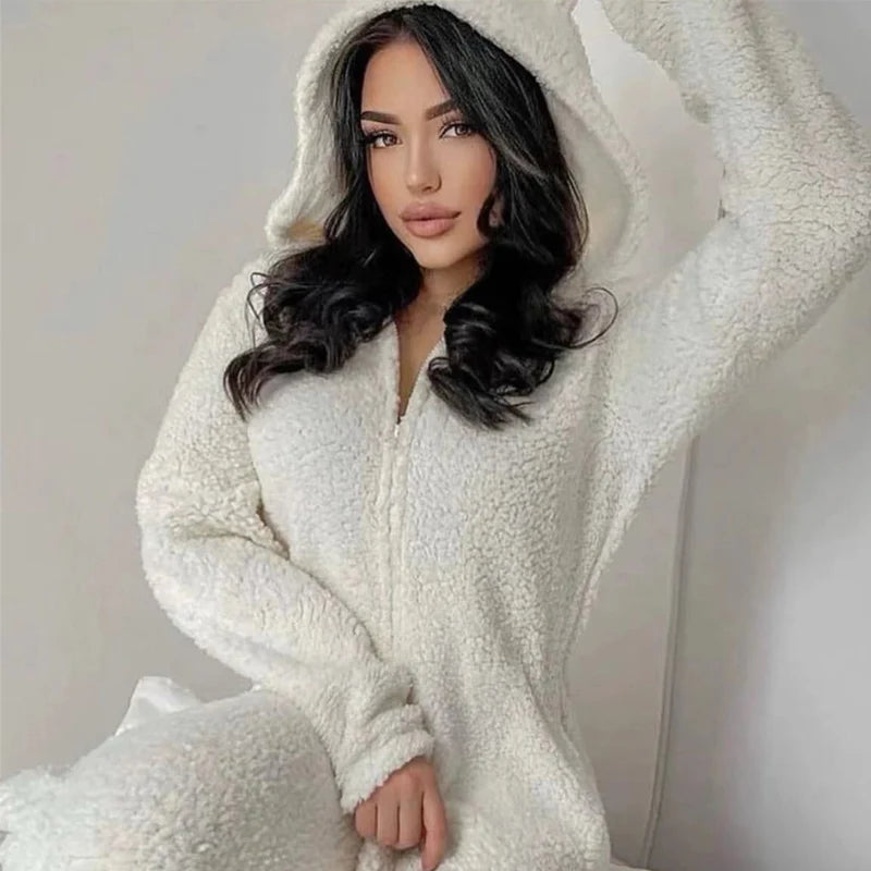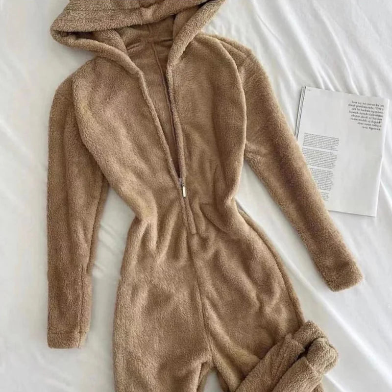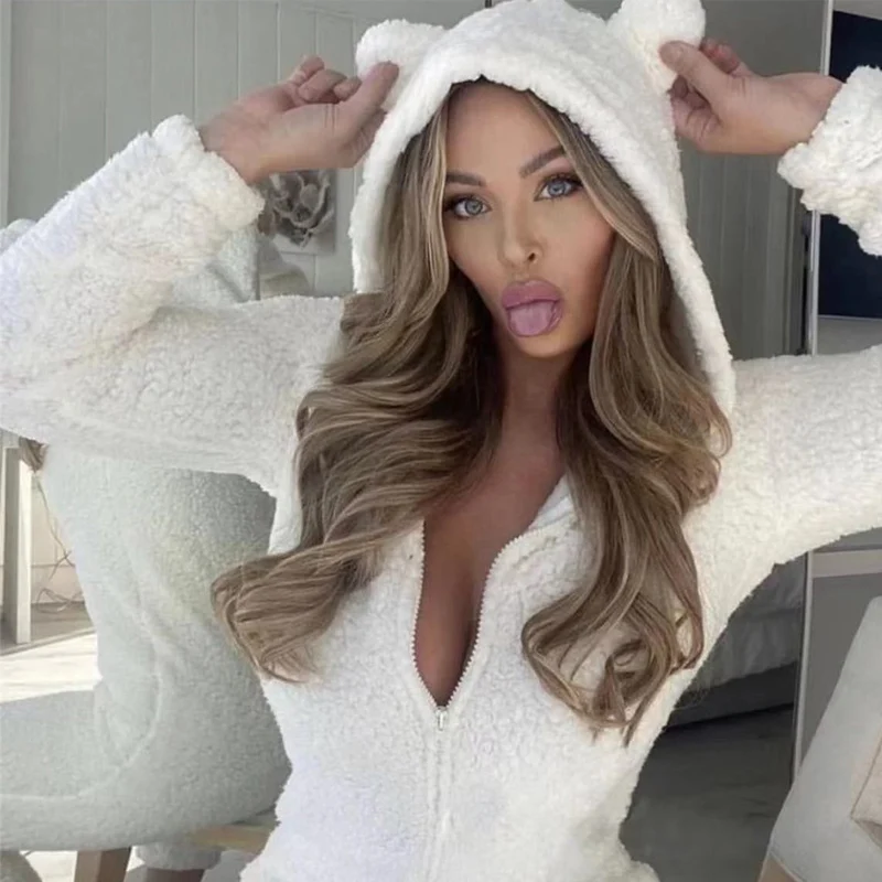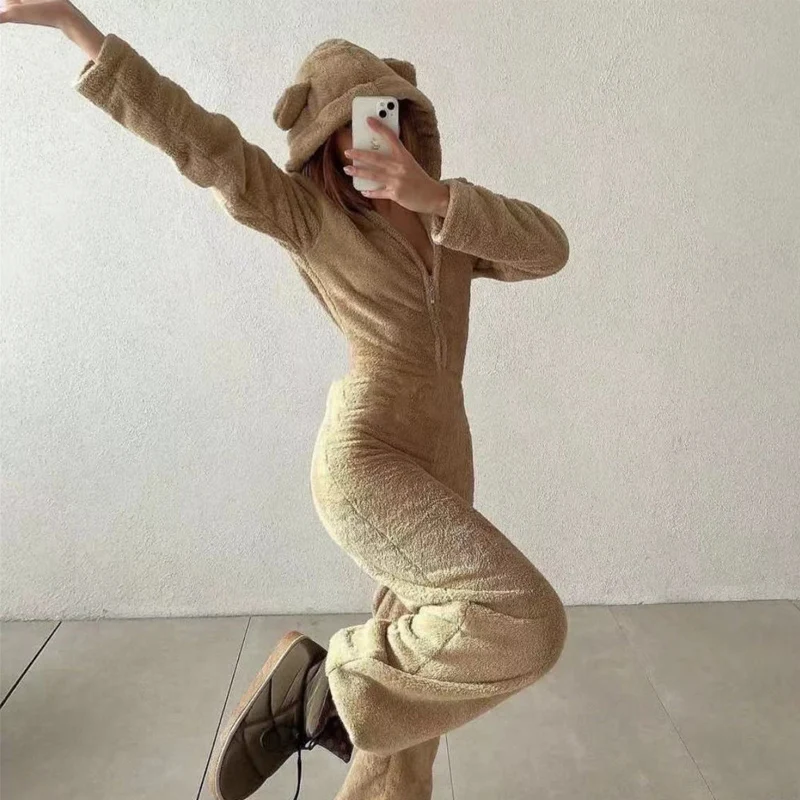 Kylethomasw Fall Winter Long Sleeve Soft Fleece Jumpsuits Women Fashion Cute Hear Hooded Zipper Playsuits Casual Solid Warm Sleepwear Romper