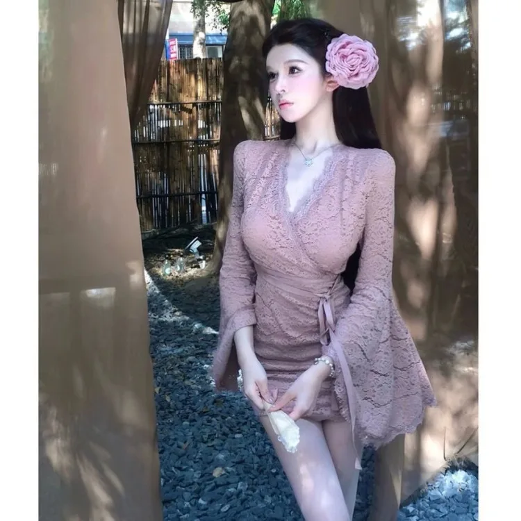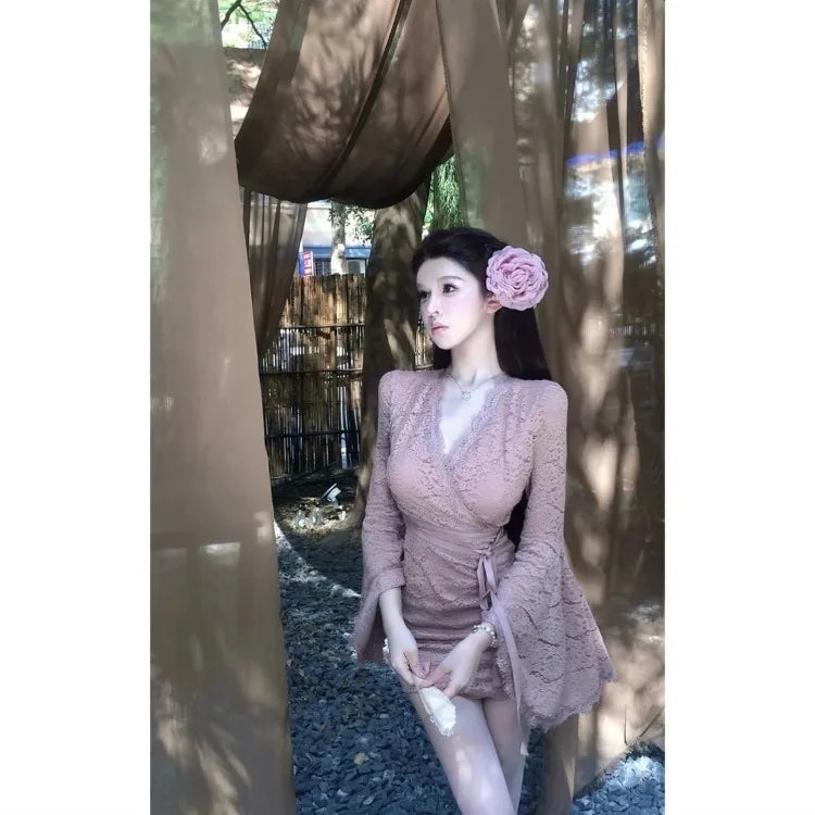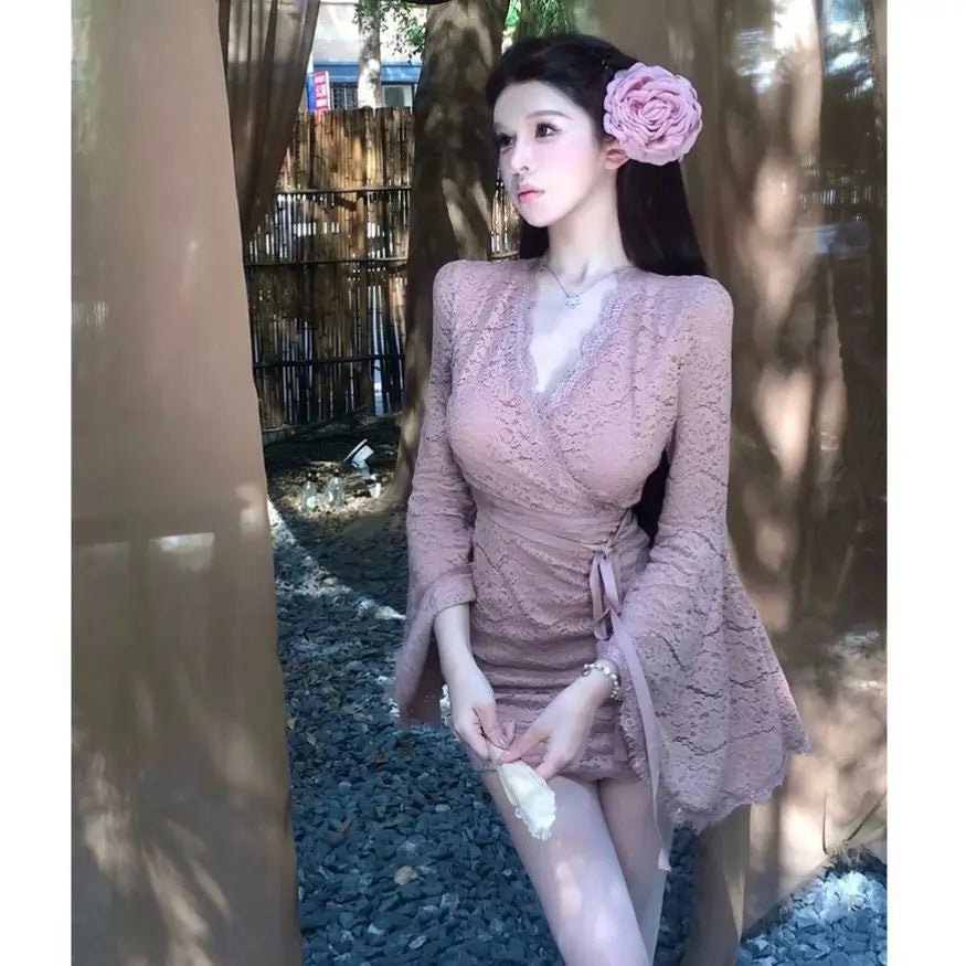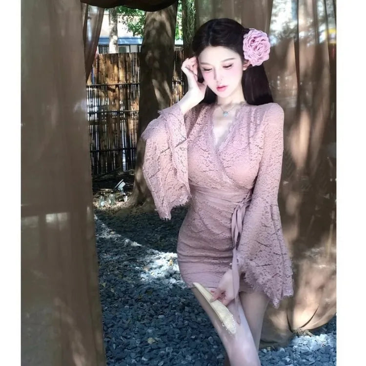 KYLETHOMASW - Gentle Woman Fragrance Dresses French Romance Skinny Temperament Fashion Dress Lace Flared Sleeve Chic Short Vestido
