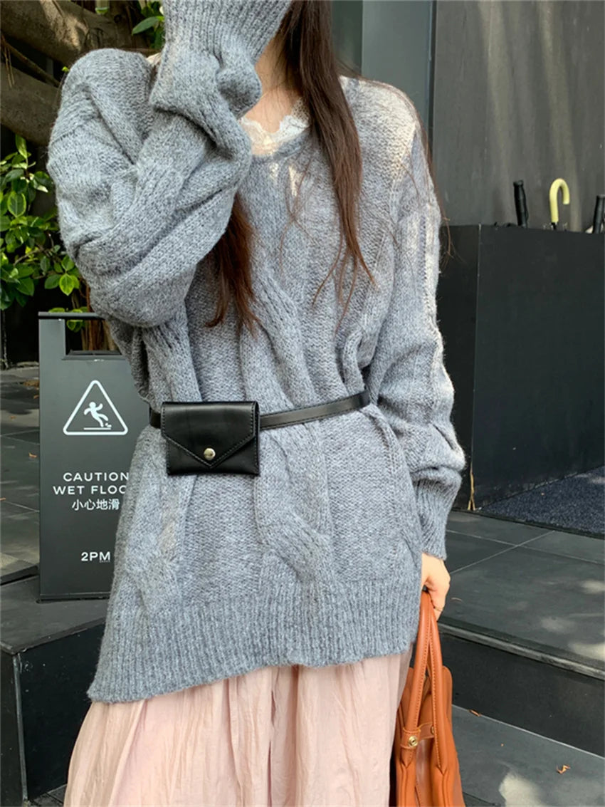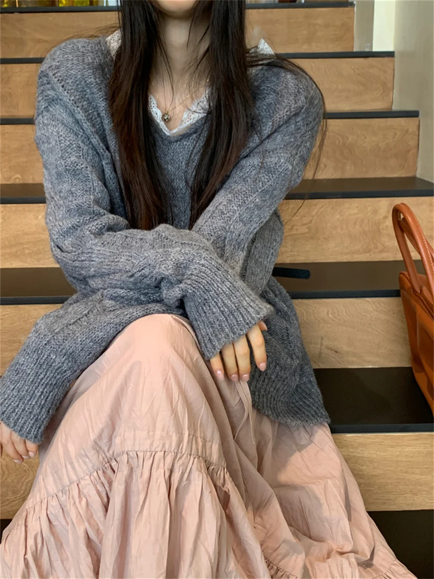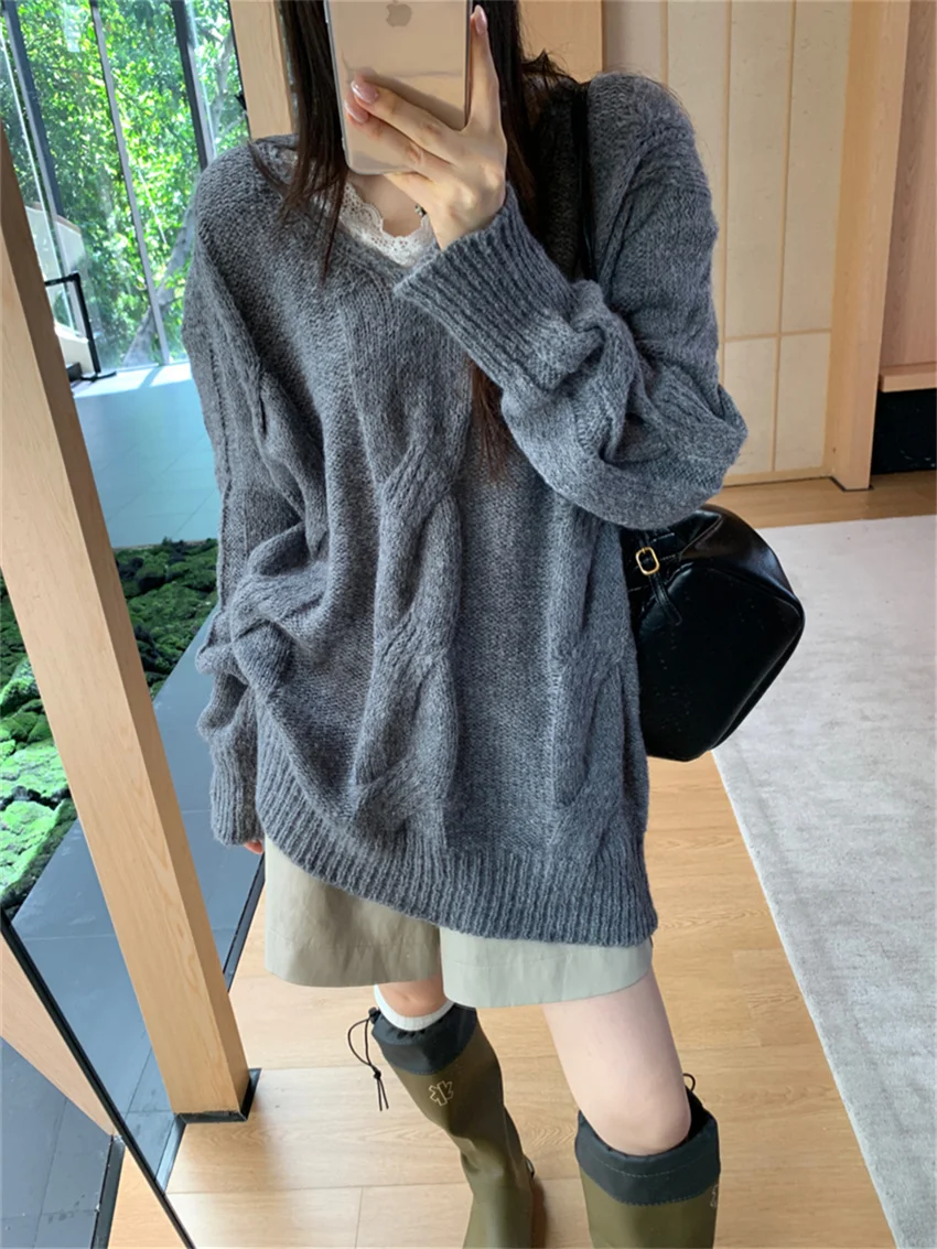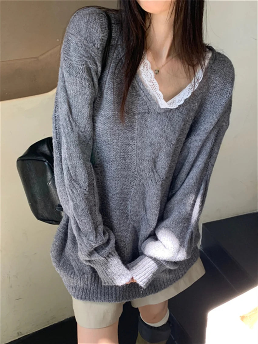KYLETHOMASW - Grey Women Mid-Length Sweaters Retro 2024 Knitted Lace Patchwork Slim New Autumn Sweet Chic Gentle Pullovers