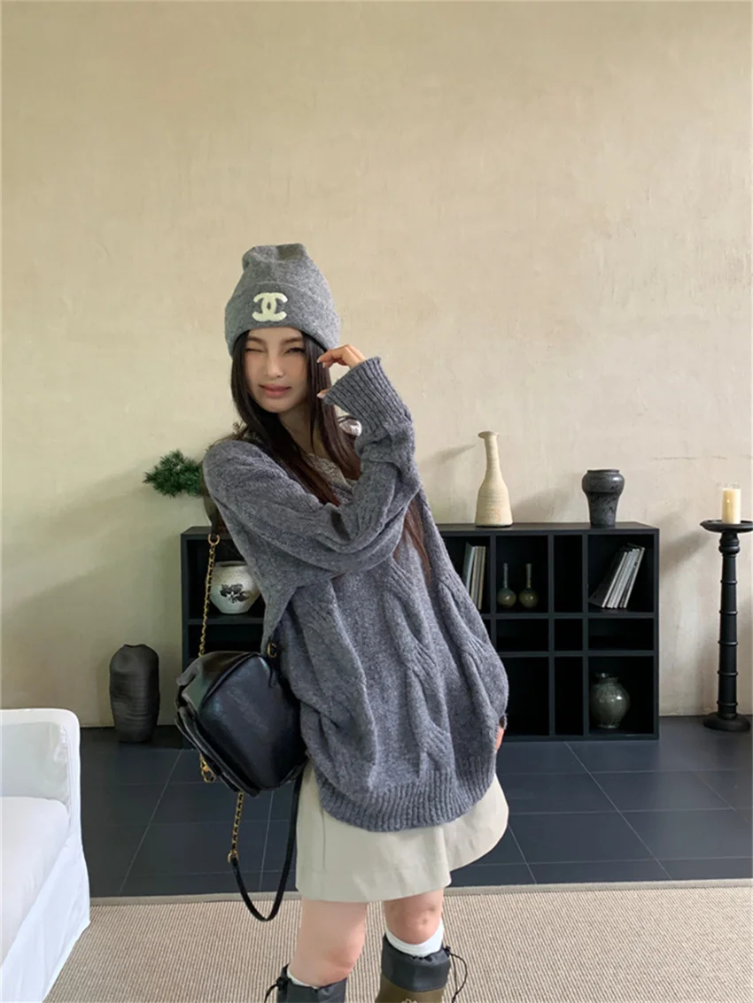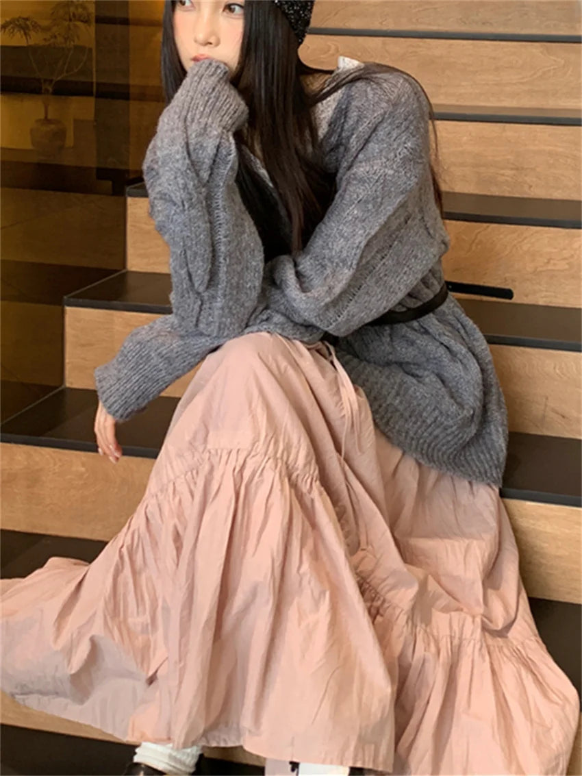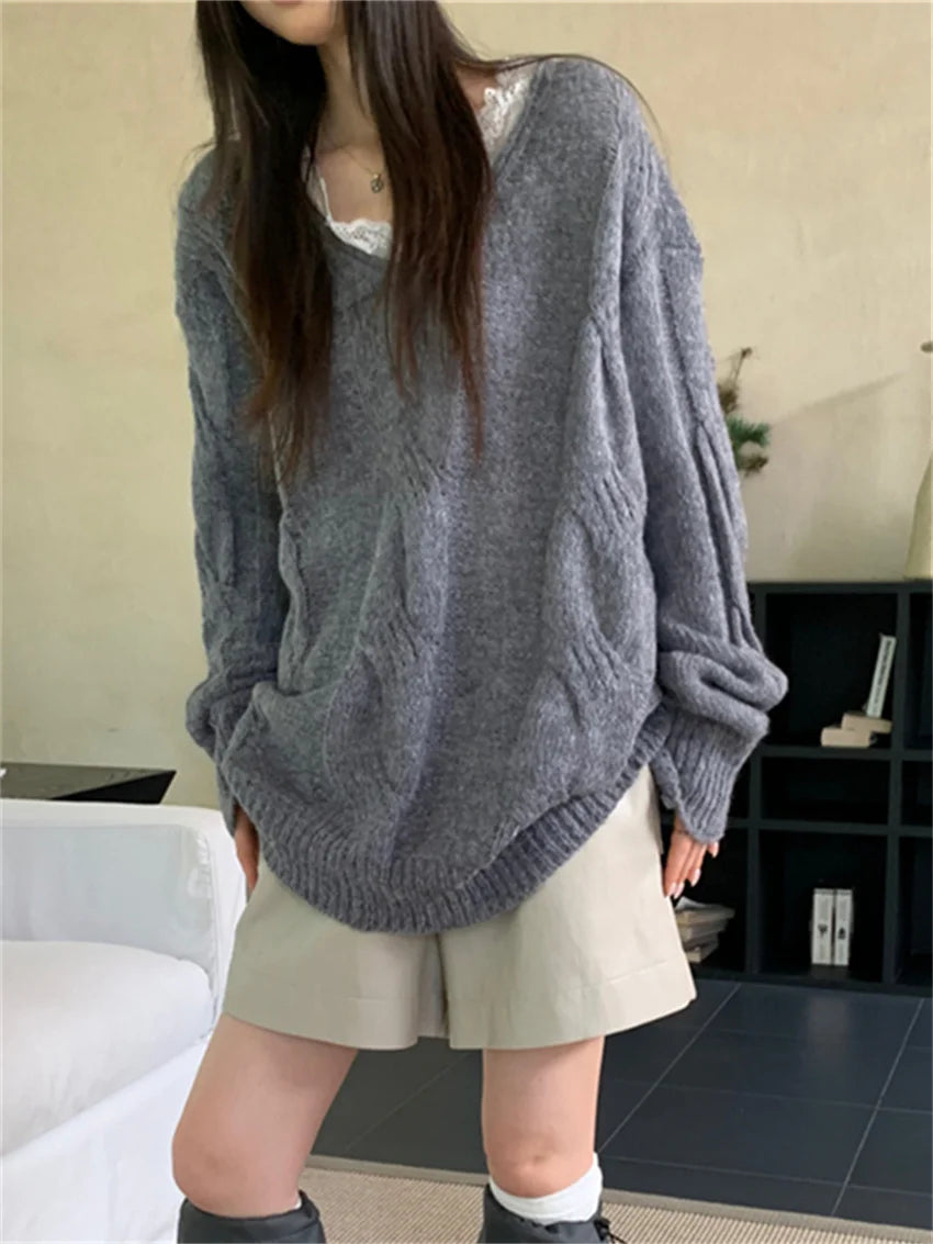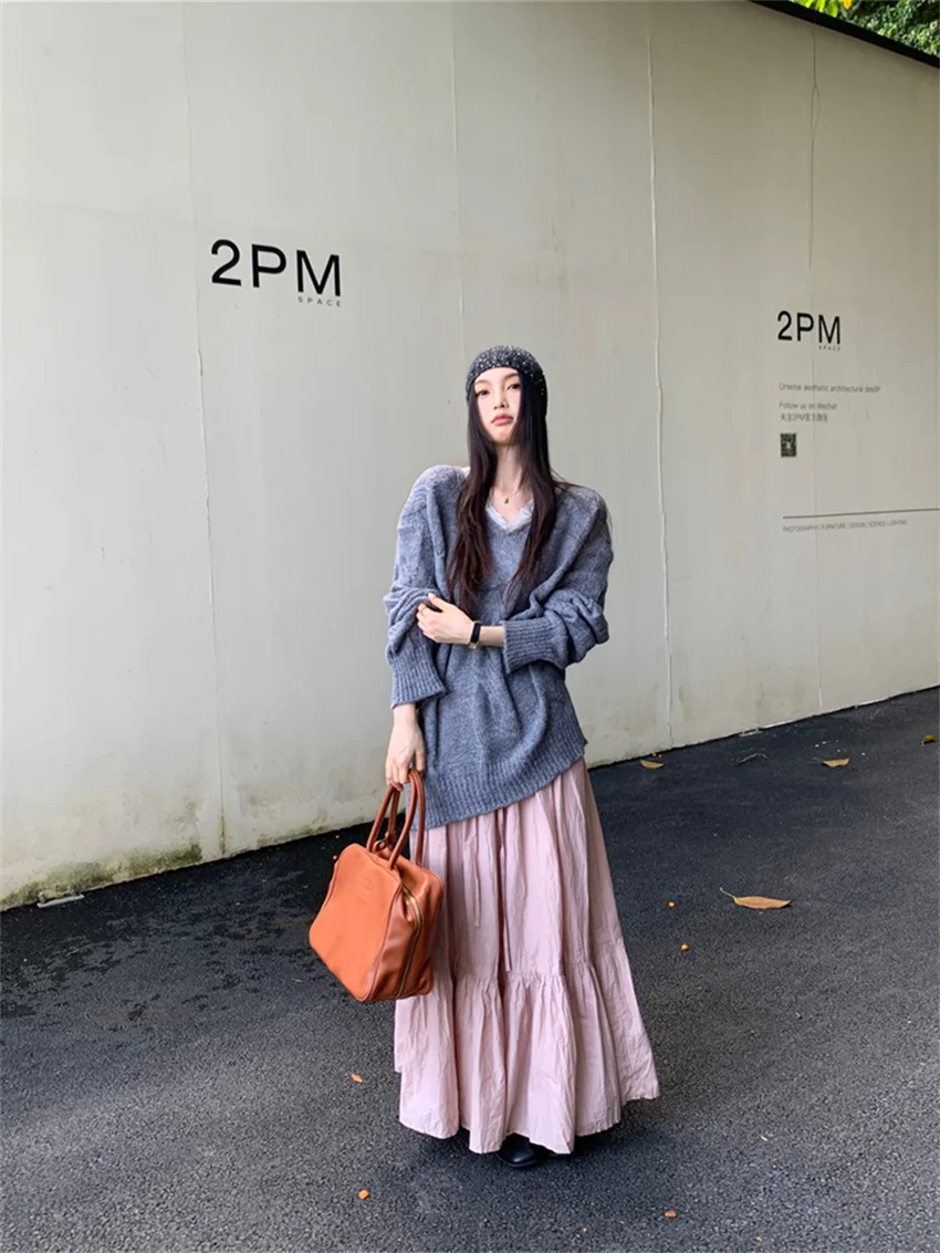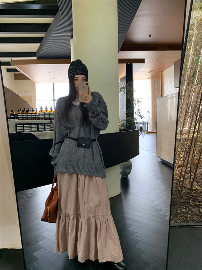 KYLETHOMASW - Grey Women Mid-Length Sweaters Retro 2024 Knitted Lace Patchwork Slim New Autumn Sweet Chic Gentle Pullovers