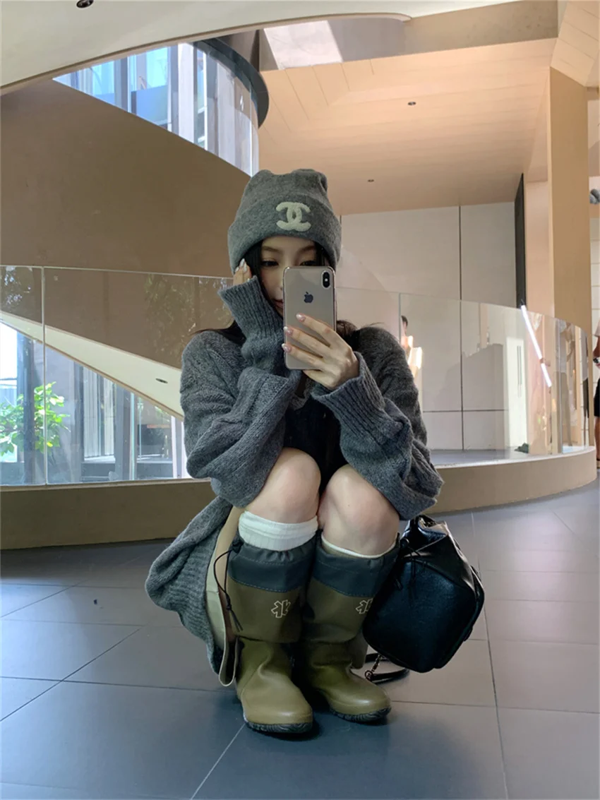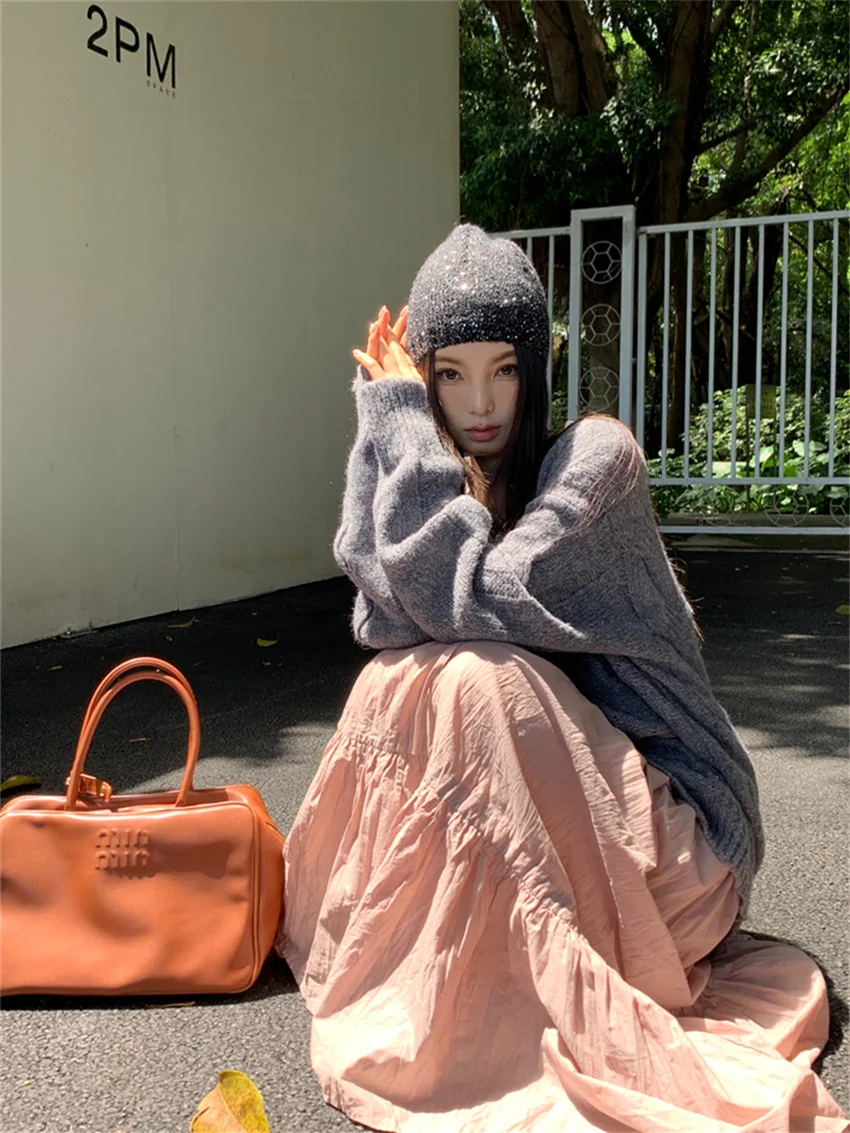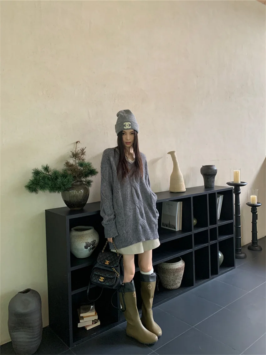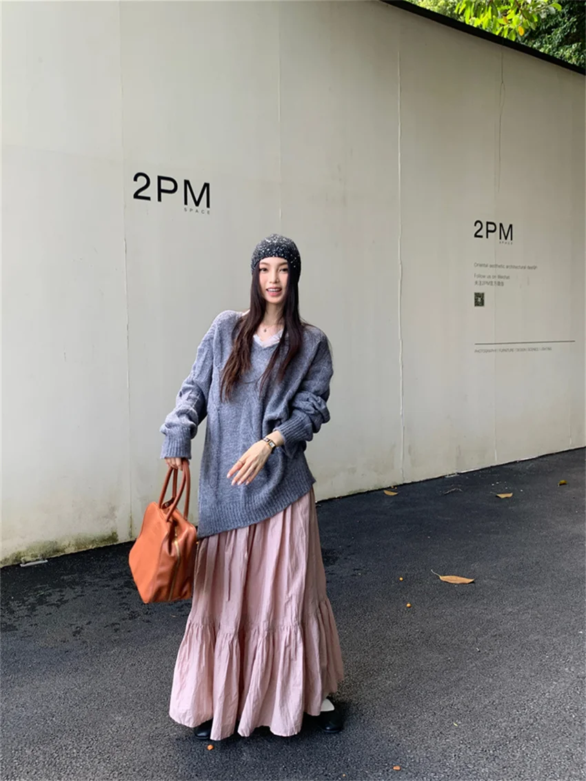KYLETHOMASW - Grey Women Mid-Length Sweaters Retro 2024 Knitted Lace Patchwork Slim New Autumn Sweet Chic Gentle Pullovers