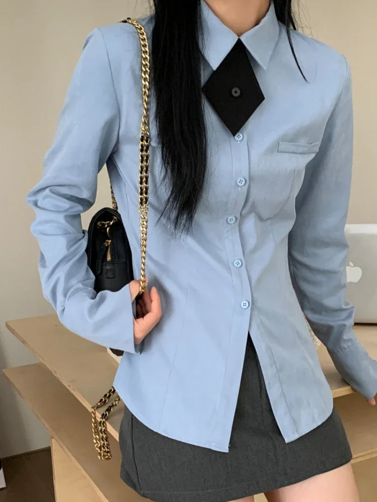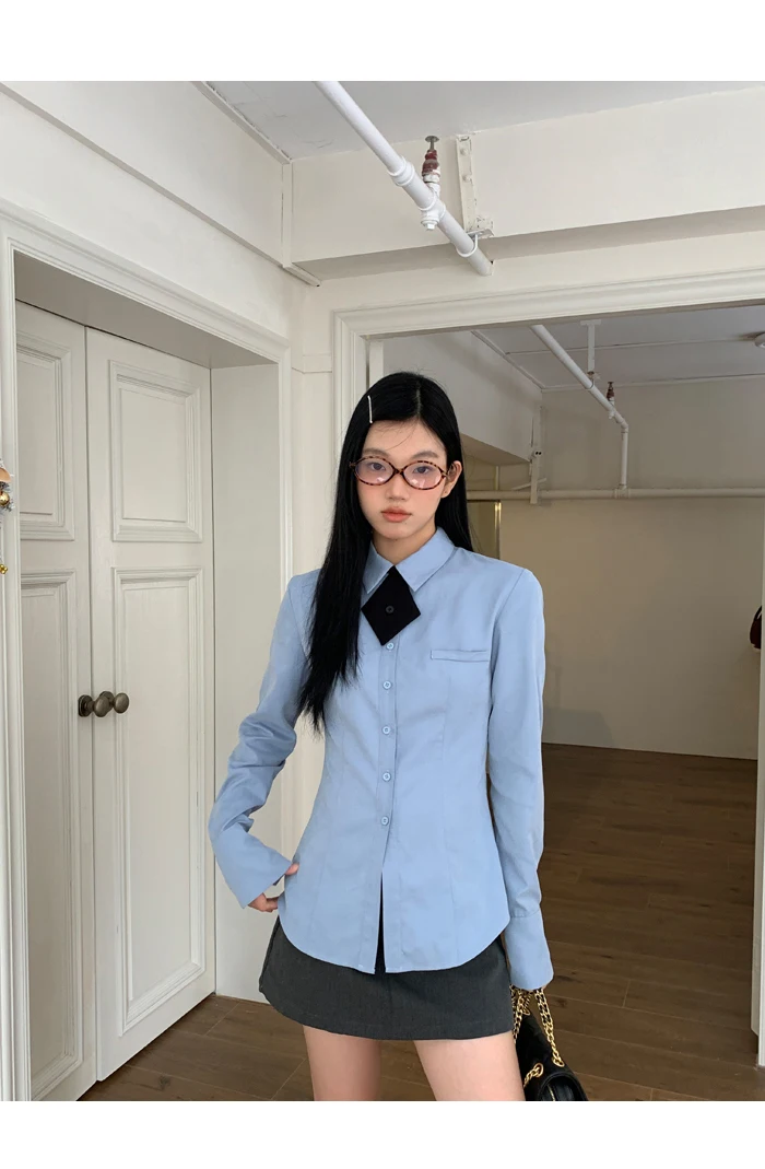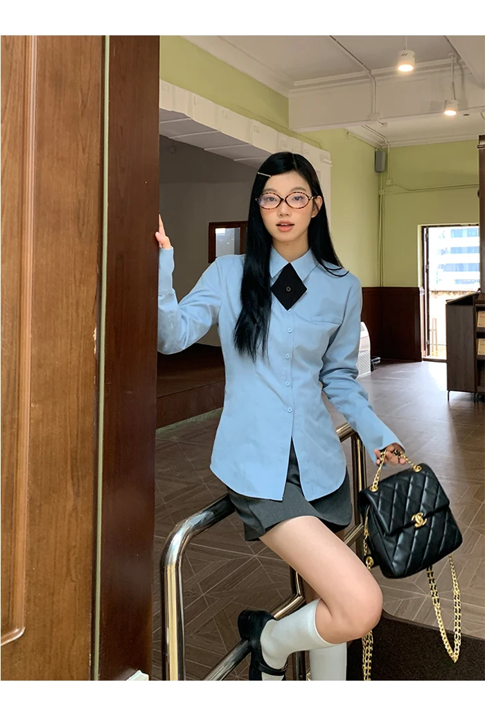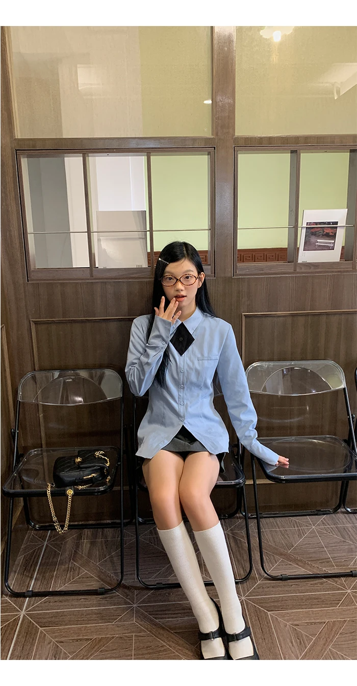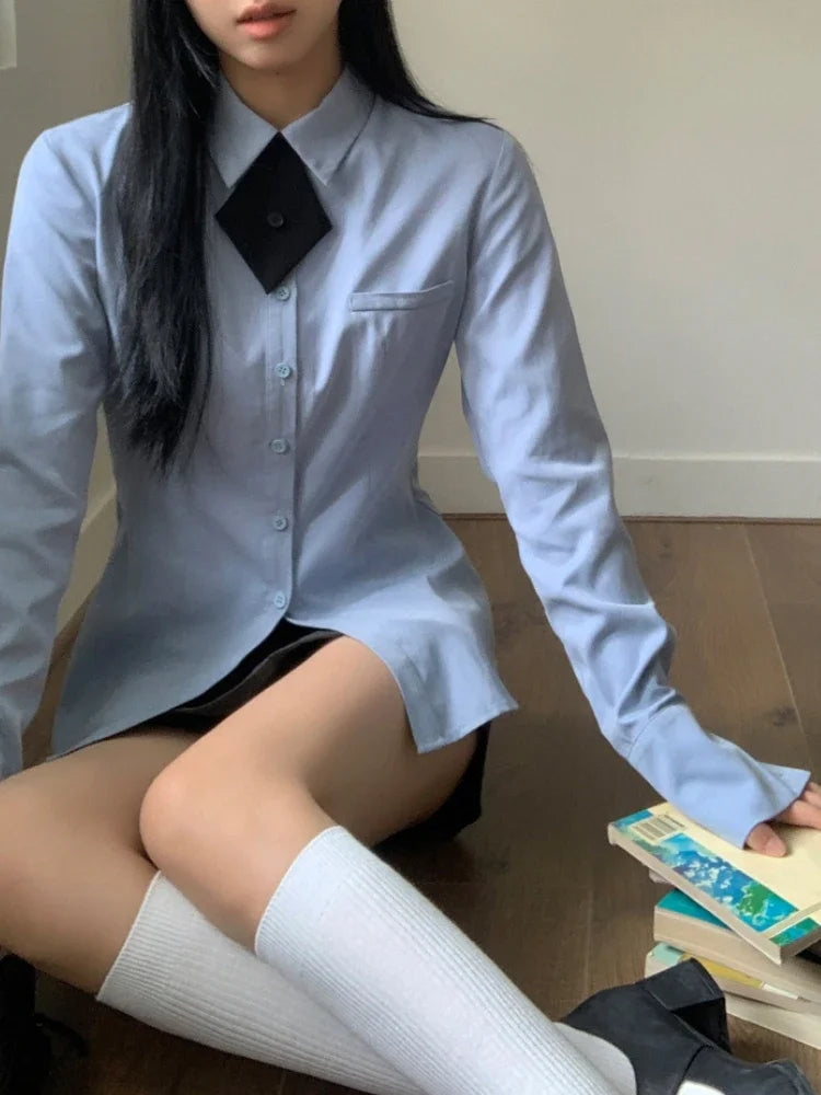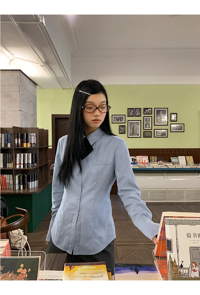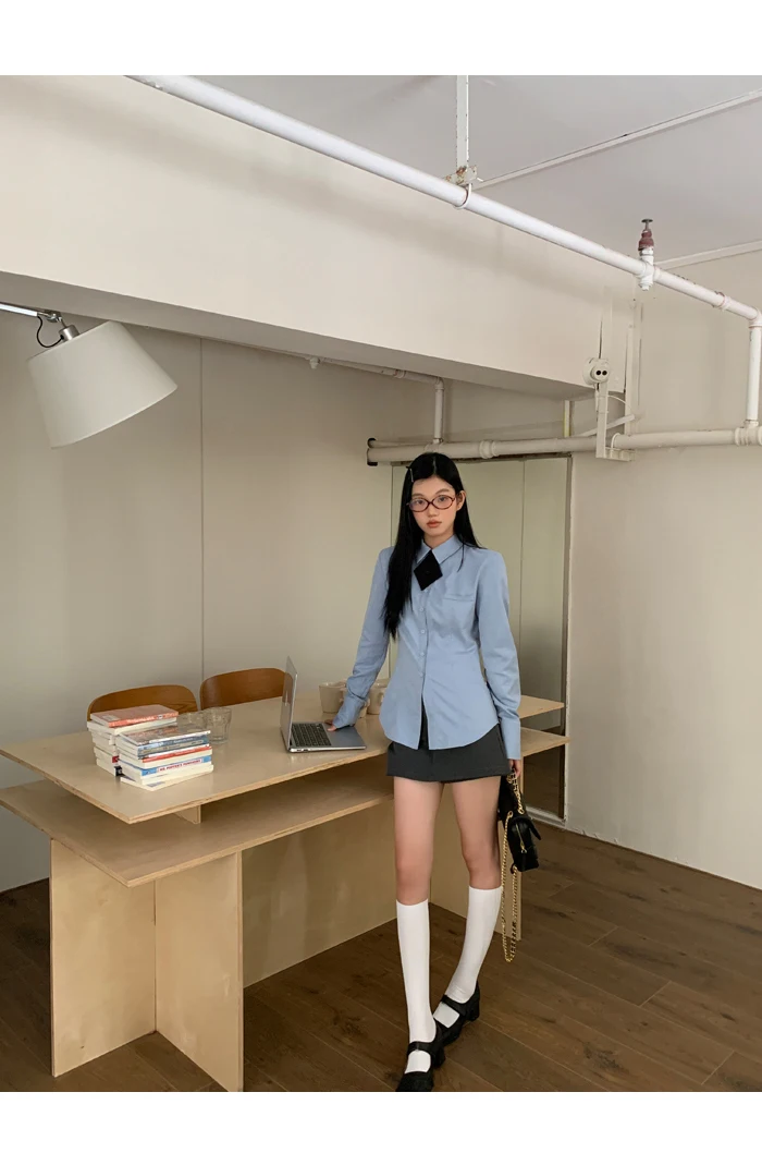 Kylethomasw Harajuku Blue Shirts for Women Slim Button Up Blouse with Tie Spring Summer Preppy Style Long Sleeve Uniform Clothes New