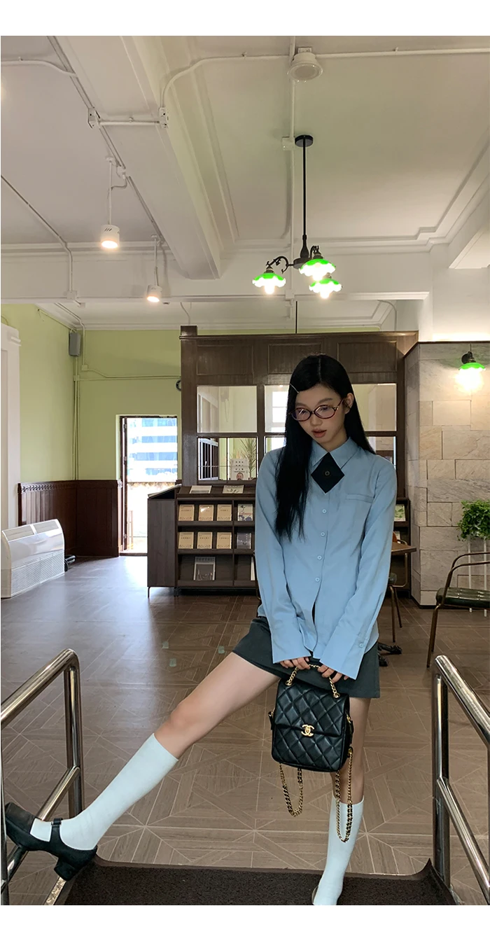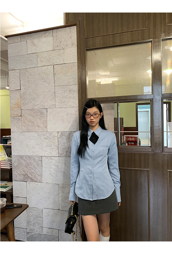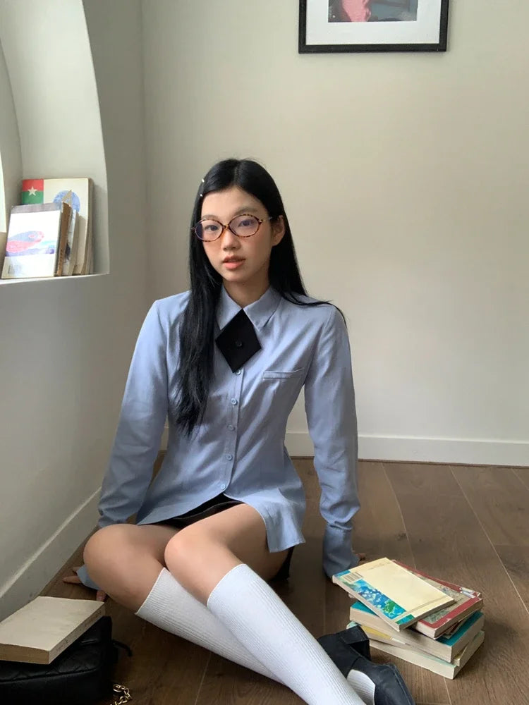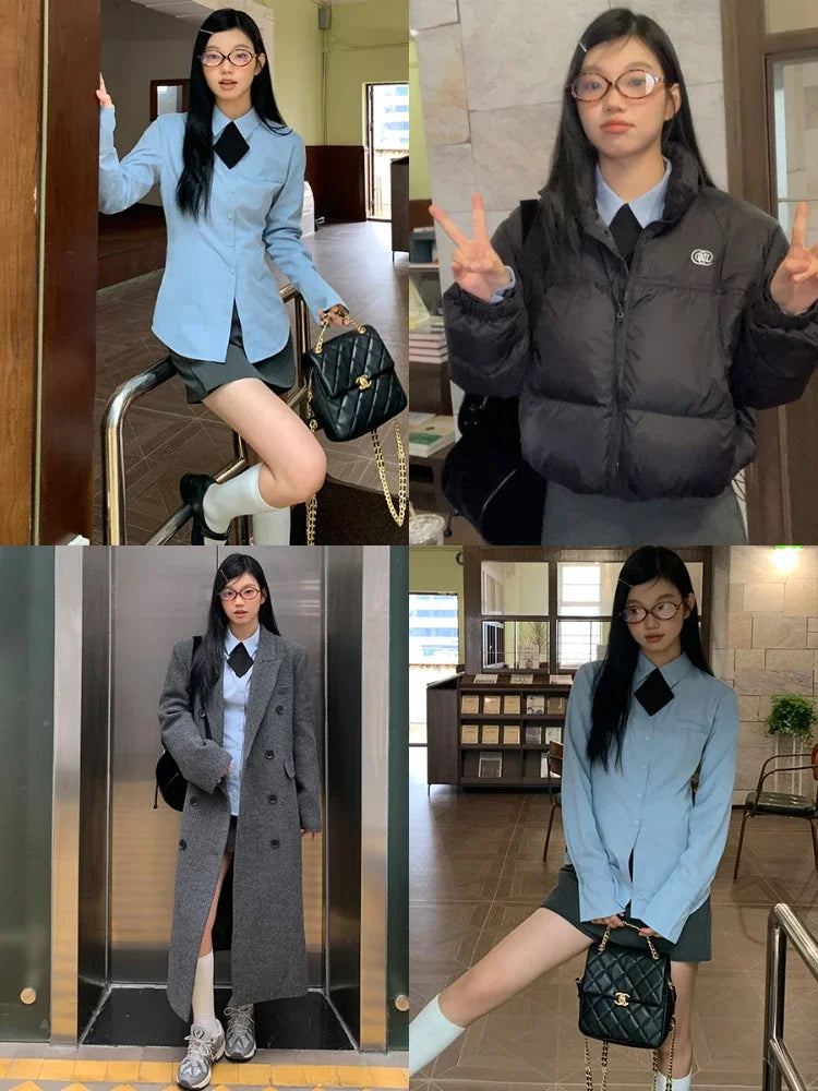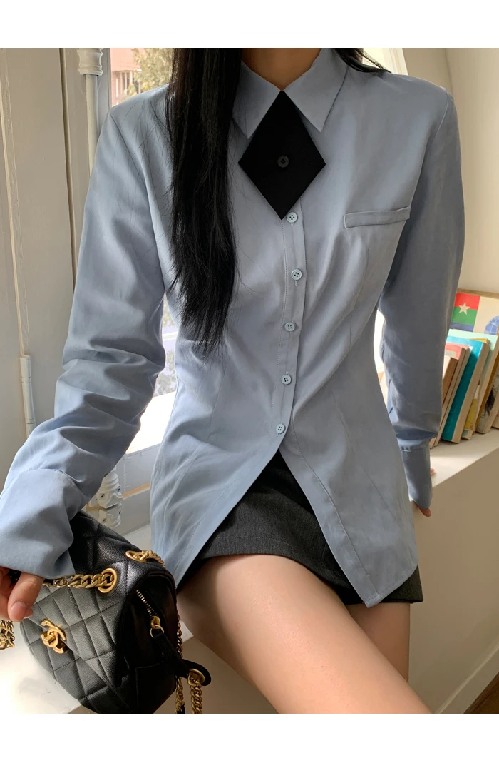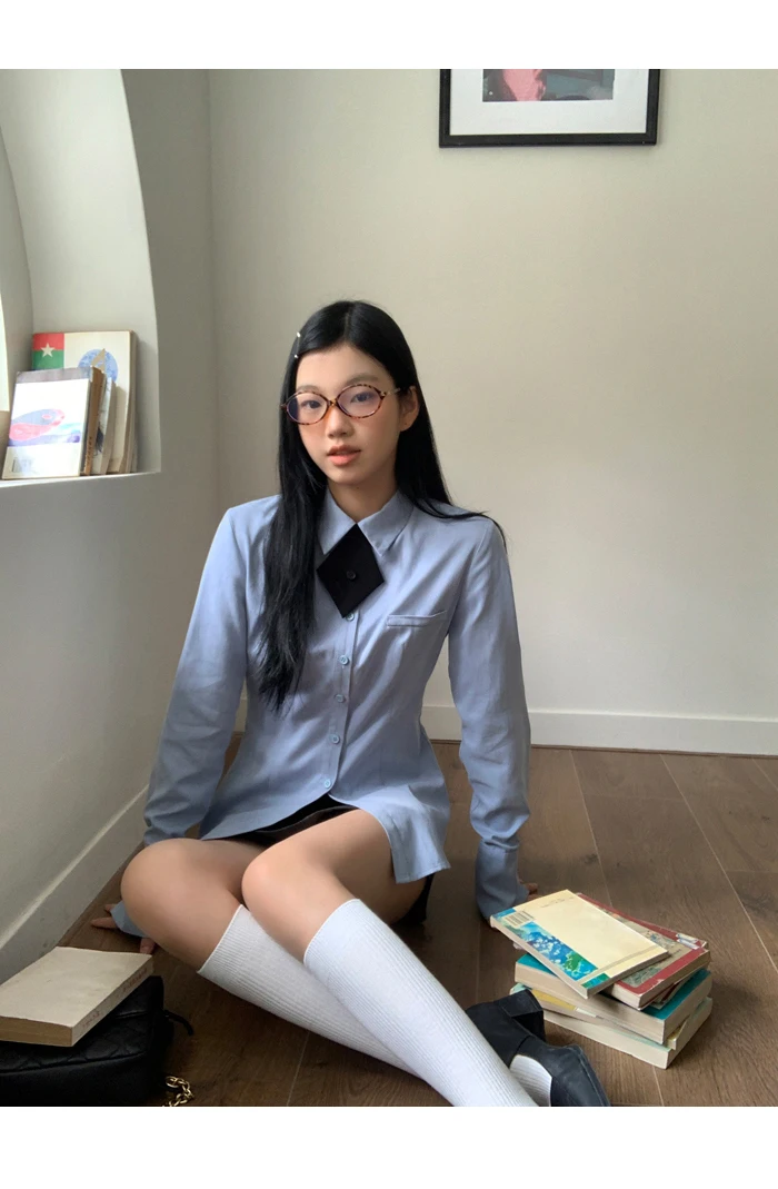 Kylethomasw Harajuku Blue Shirts for Women Slim Button Up Blouse with Tie Spring Summer Preppy Style Long Sleeve Uniform Clothes New