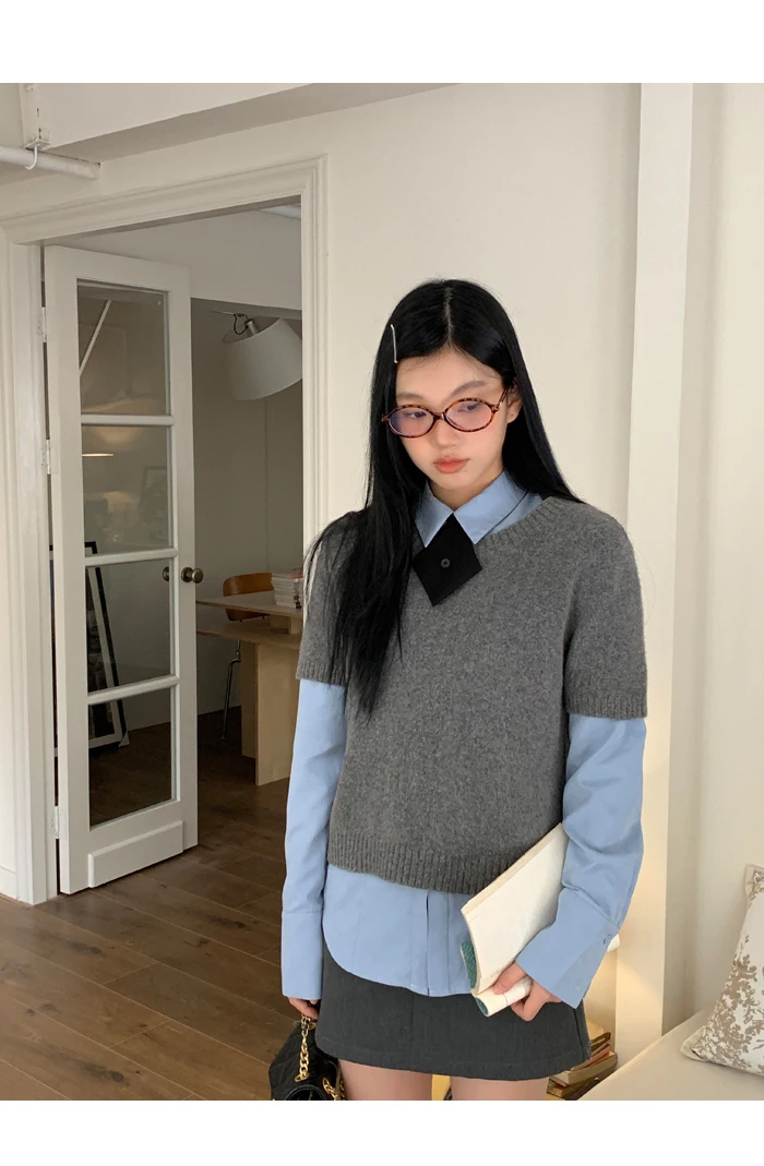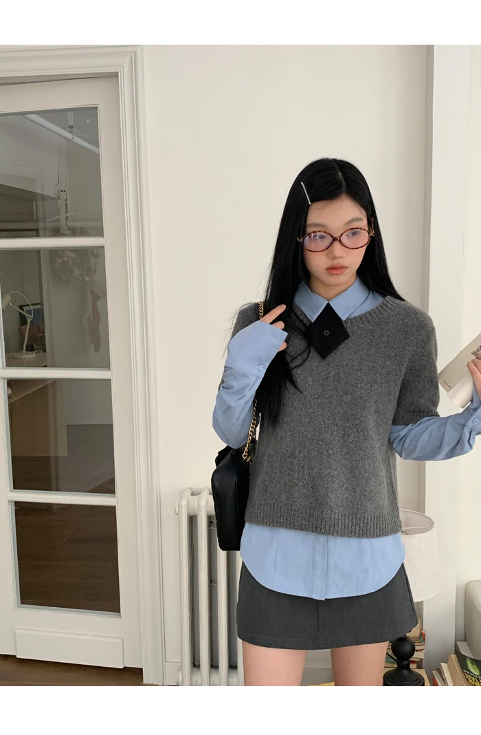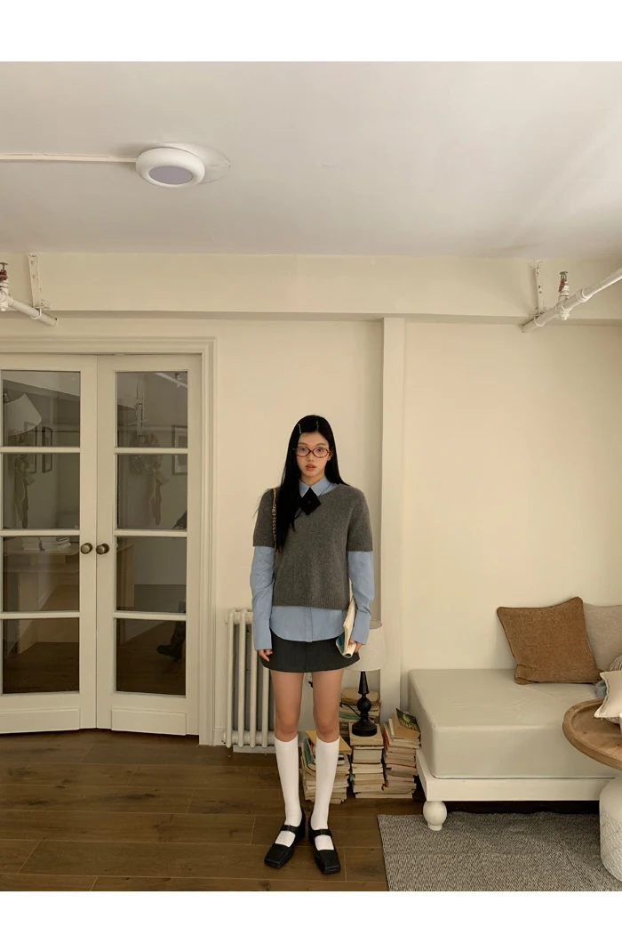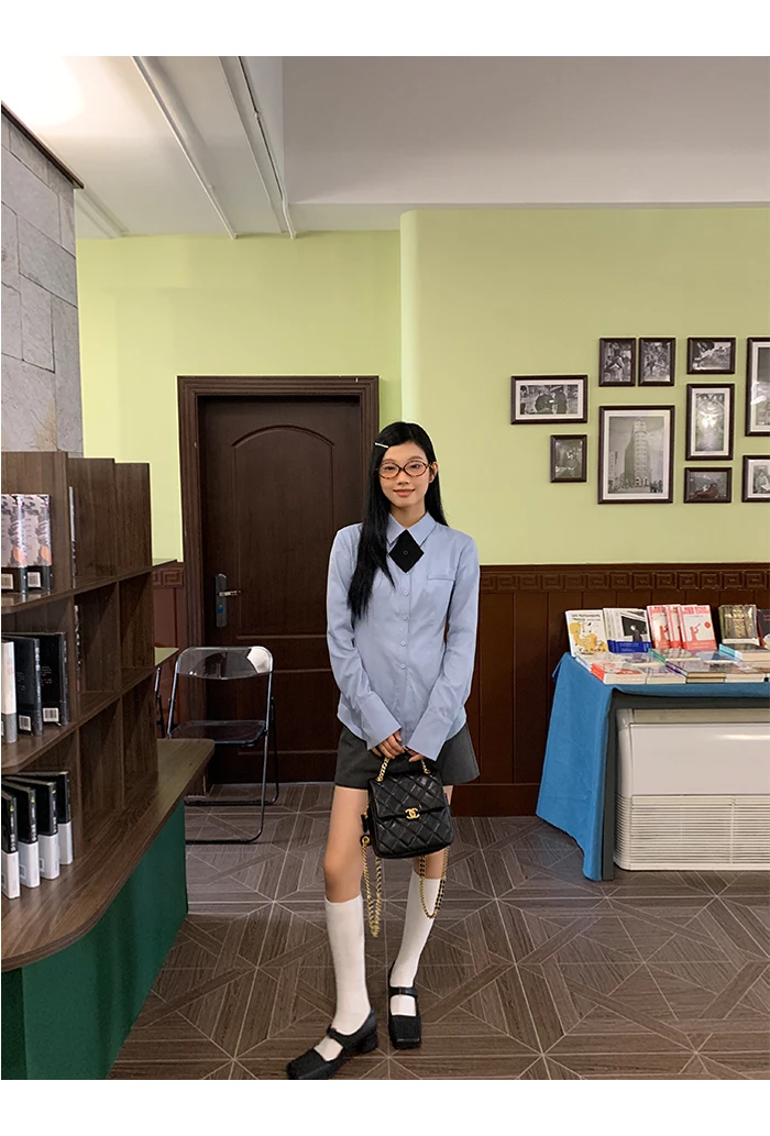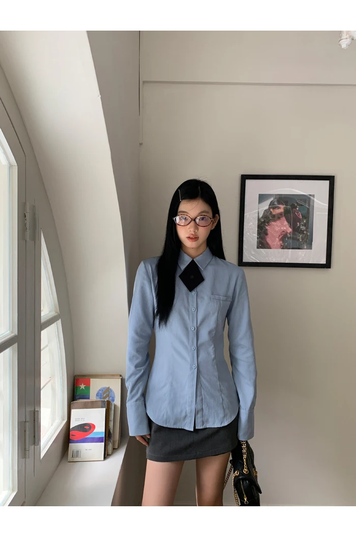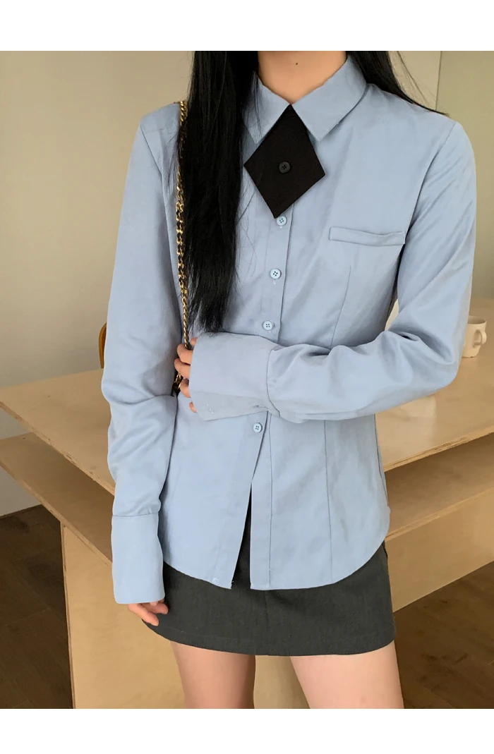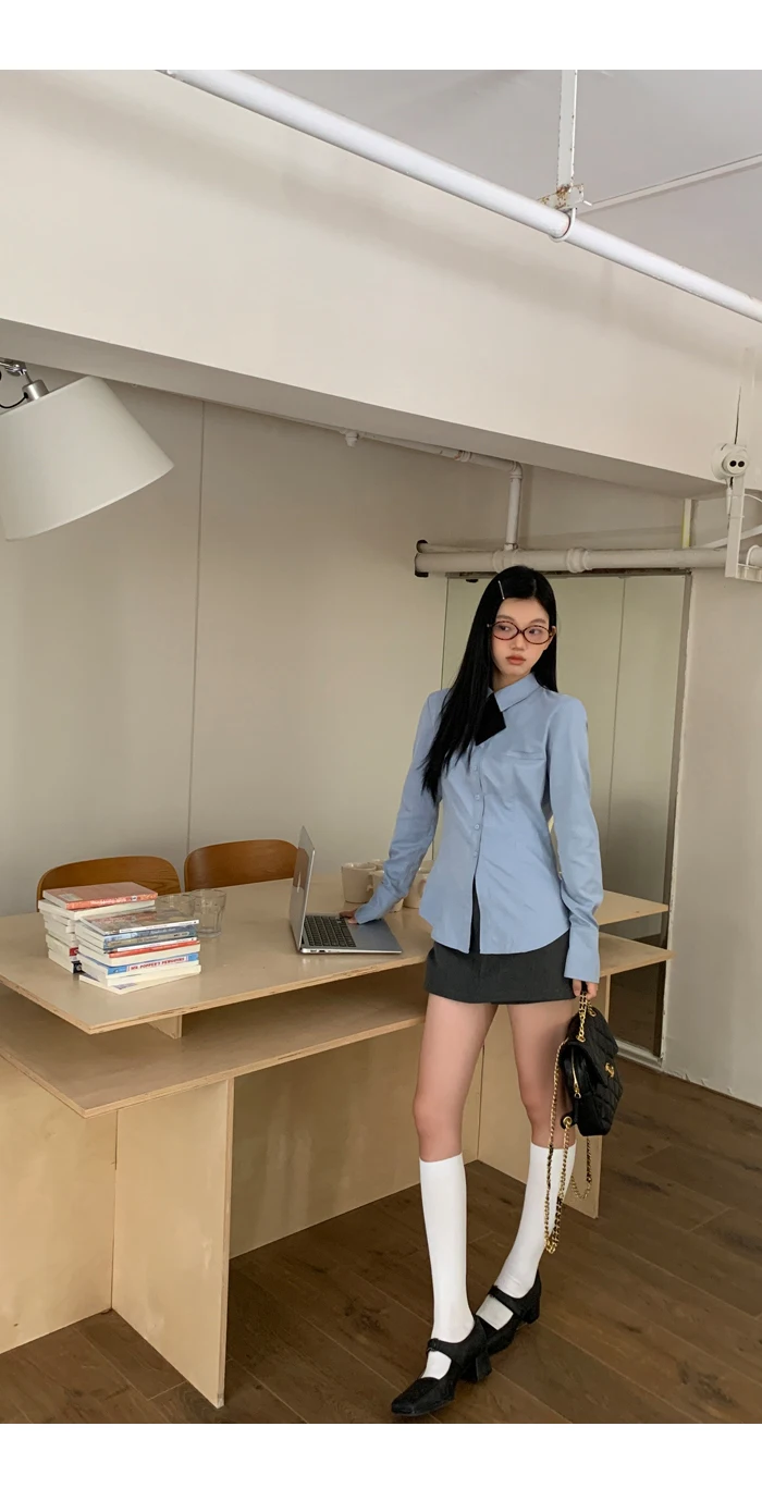 Kylethomasw Harajuku Blue Shirts for Women Slim Button Up Blouse with Tie Spring Summer Preppy Style Long Sleeve Uniform Clothes New