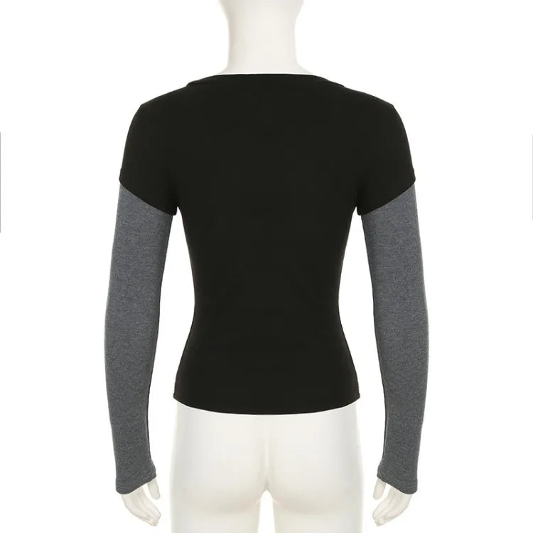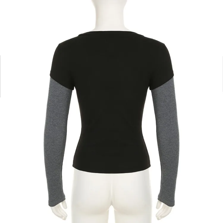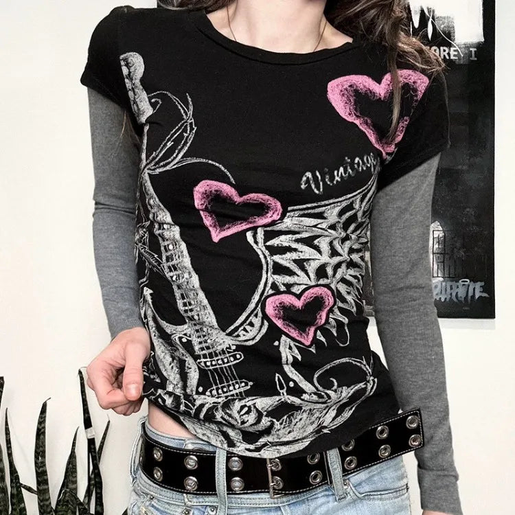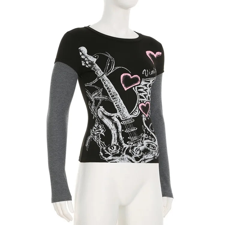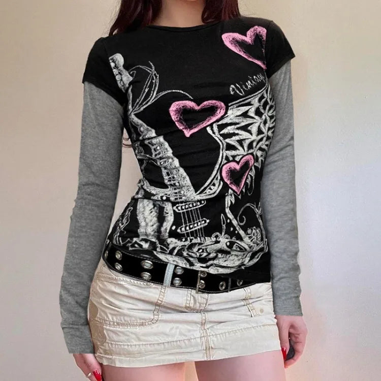 KYLETHOMASW - Heart Guitar Graffiti Printed Fake Two Piece Tops Mujer Early Spring New T-shirts for Women Y2k Slim Fit Long Sleeve Tee Shirt