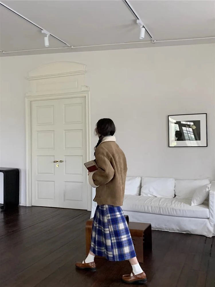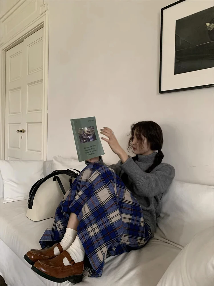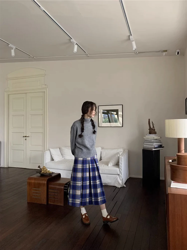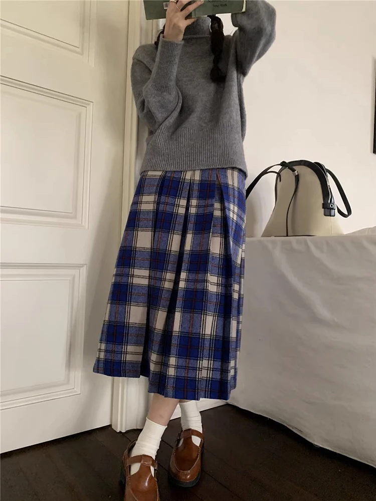 KYLETHOMASW - Japan Preppy Plaid Skirts for Woman Autumn Winter Vintage Woolen Plaid Pleated Long Skirt A-line Woolen Umbrella Skirt