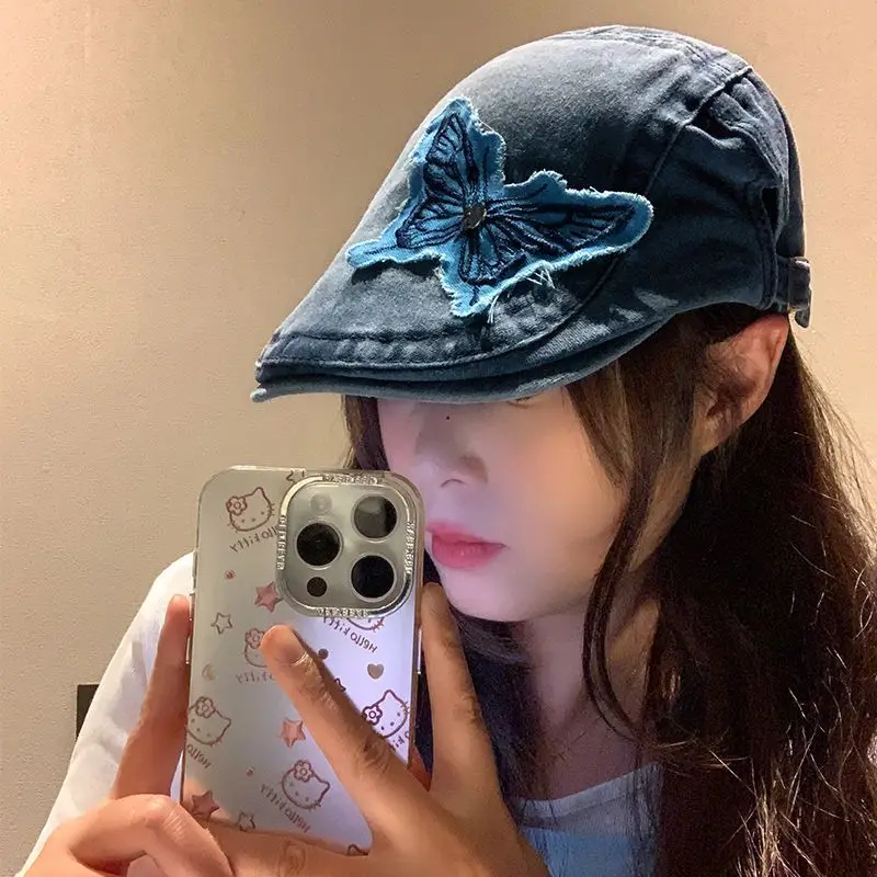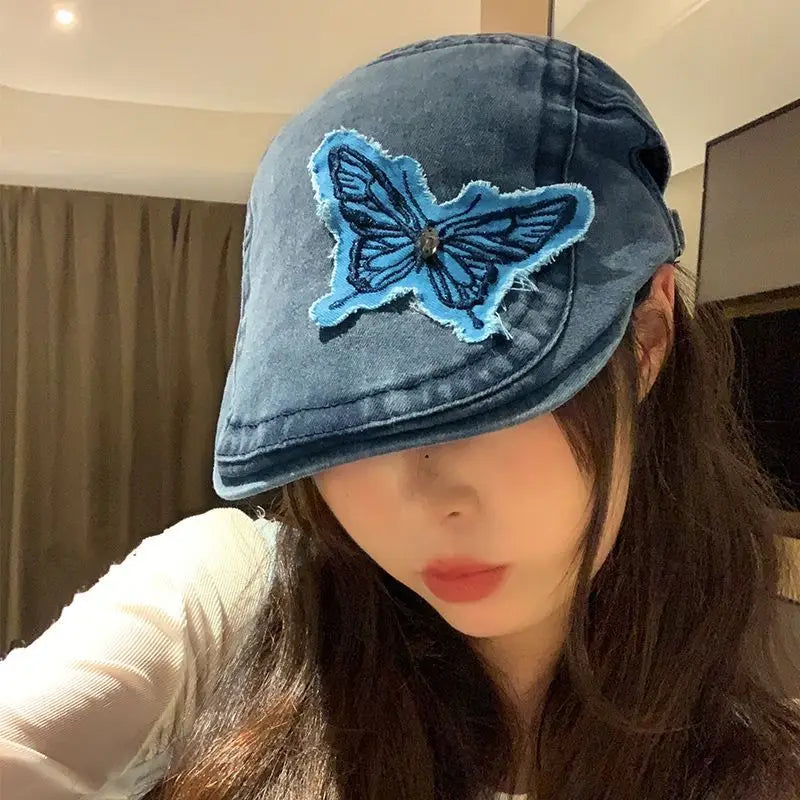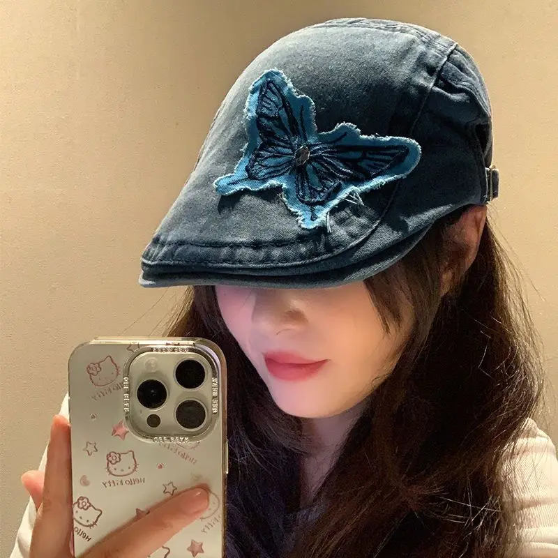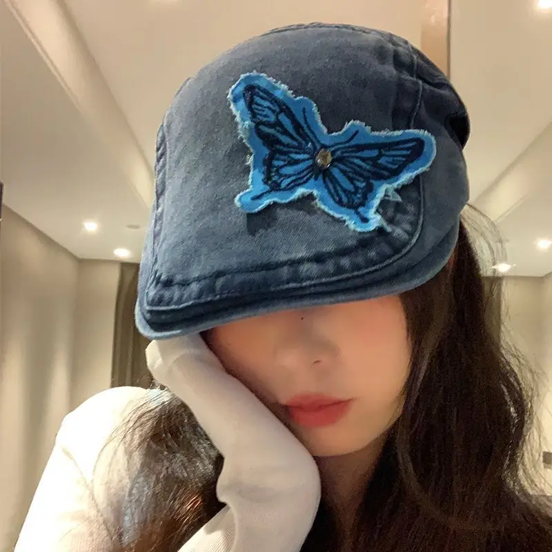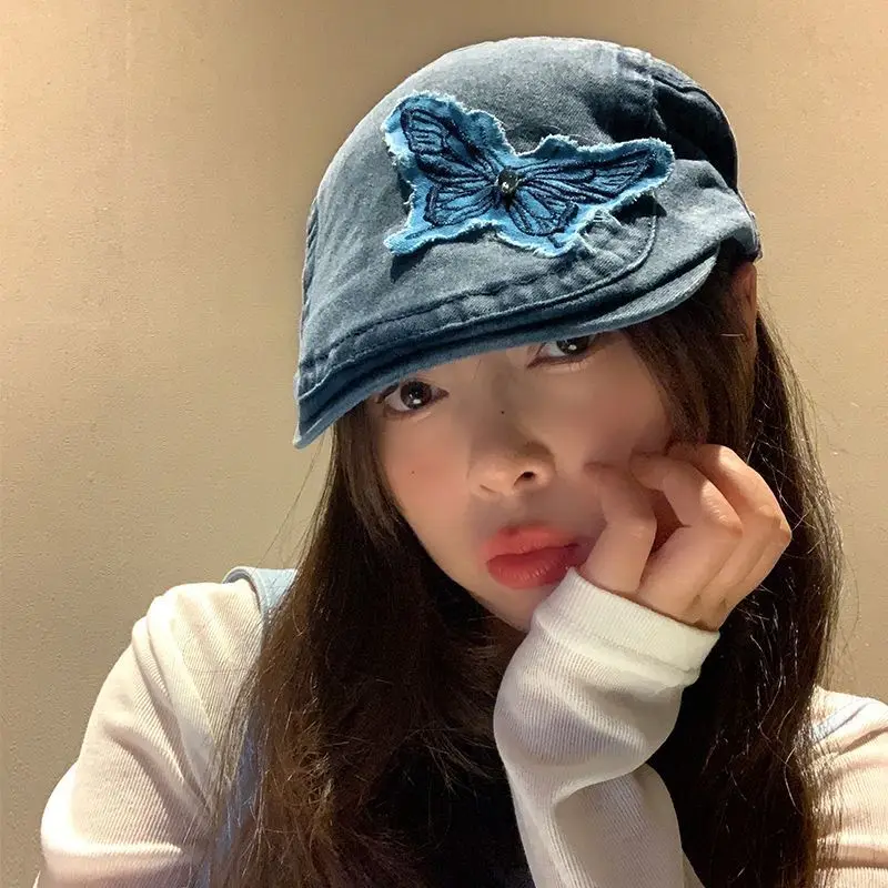 KYLETHOMASW - Japanese Retro Washed Vintage Butterfly Patch Cowboy Hat for Women Spring/Summer Hats Cute Beret Cape Beanie Bonnets for Women