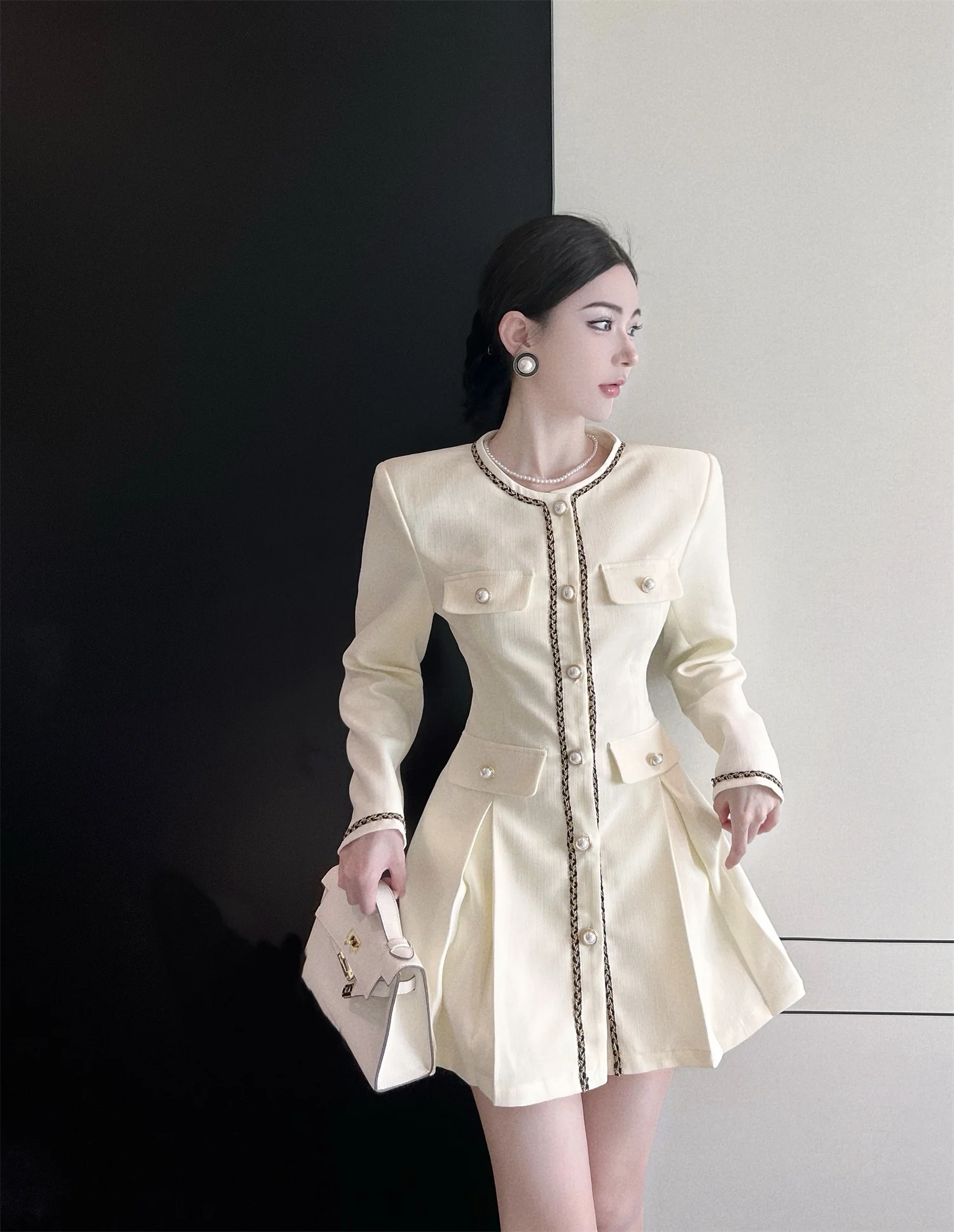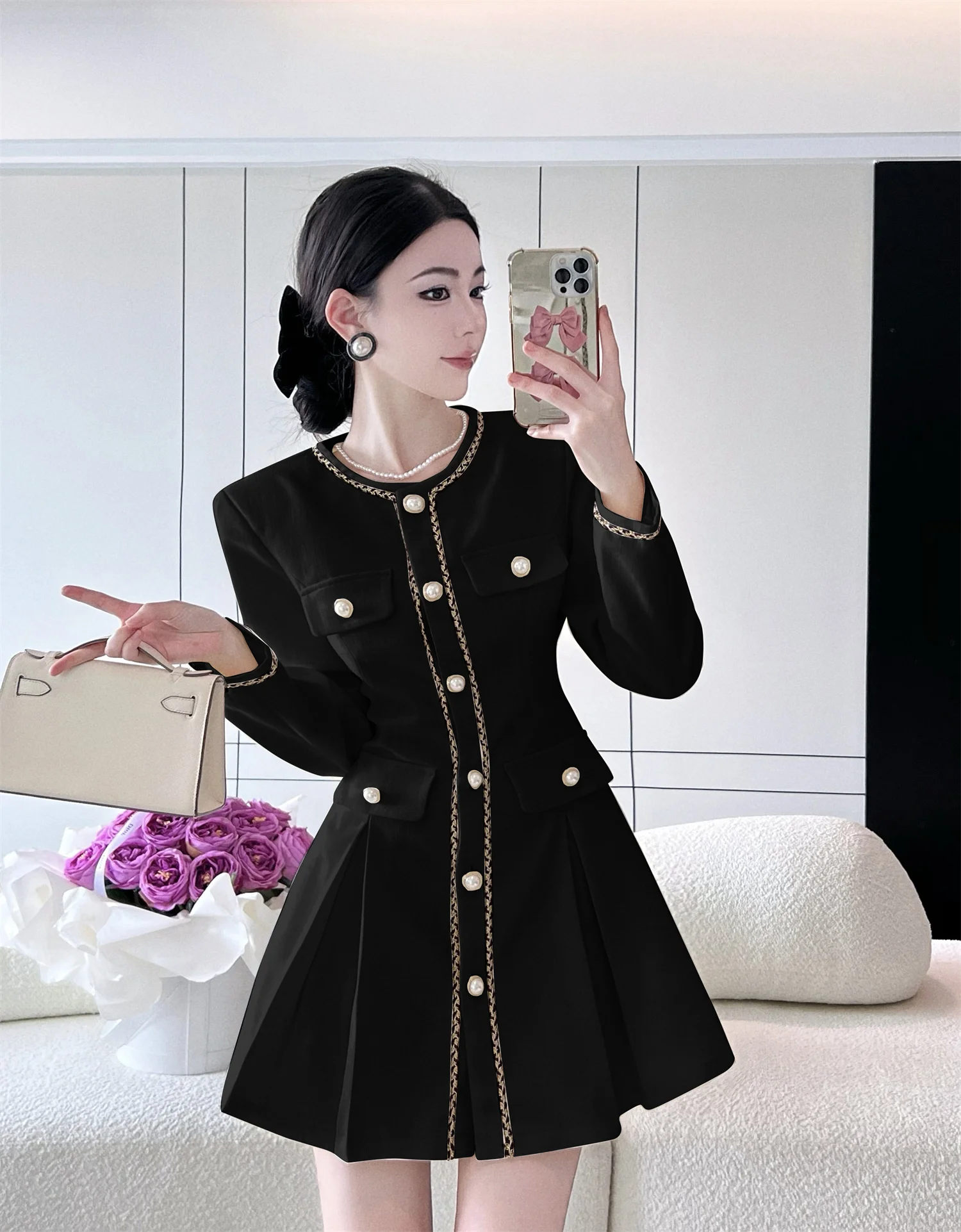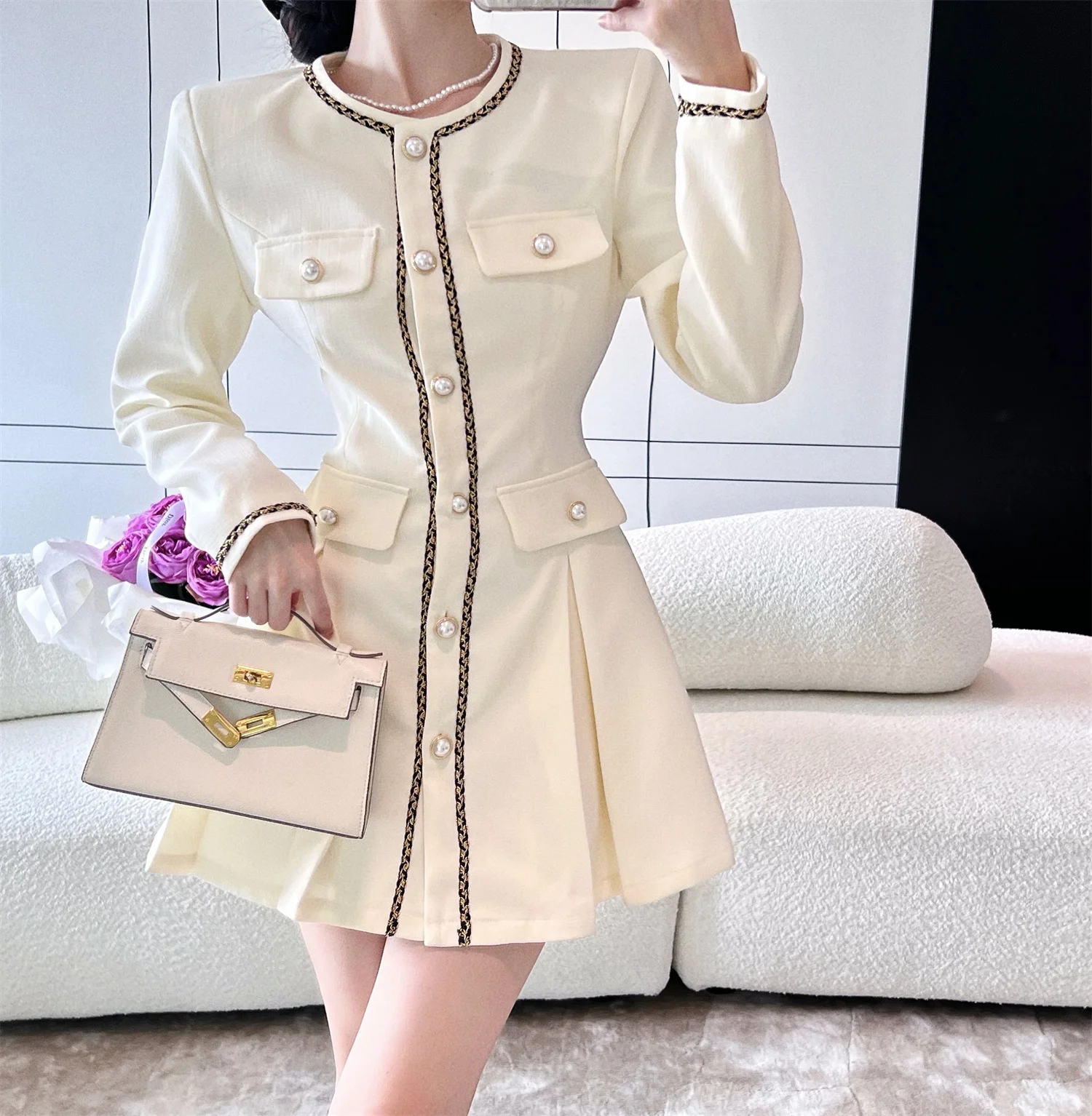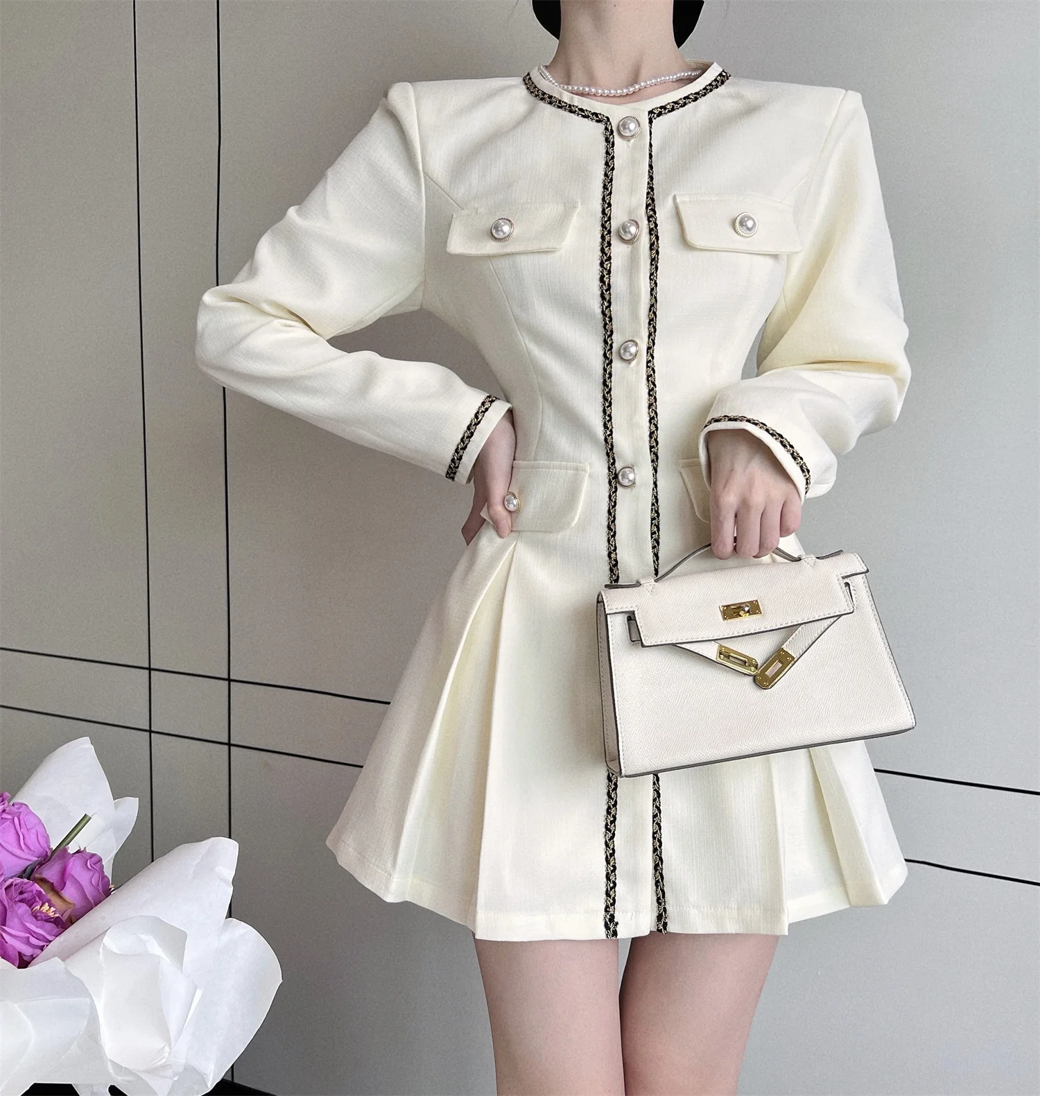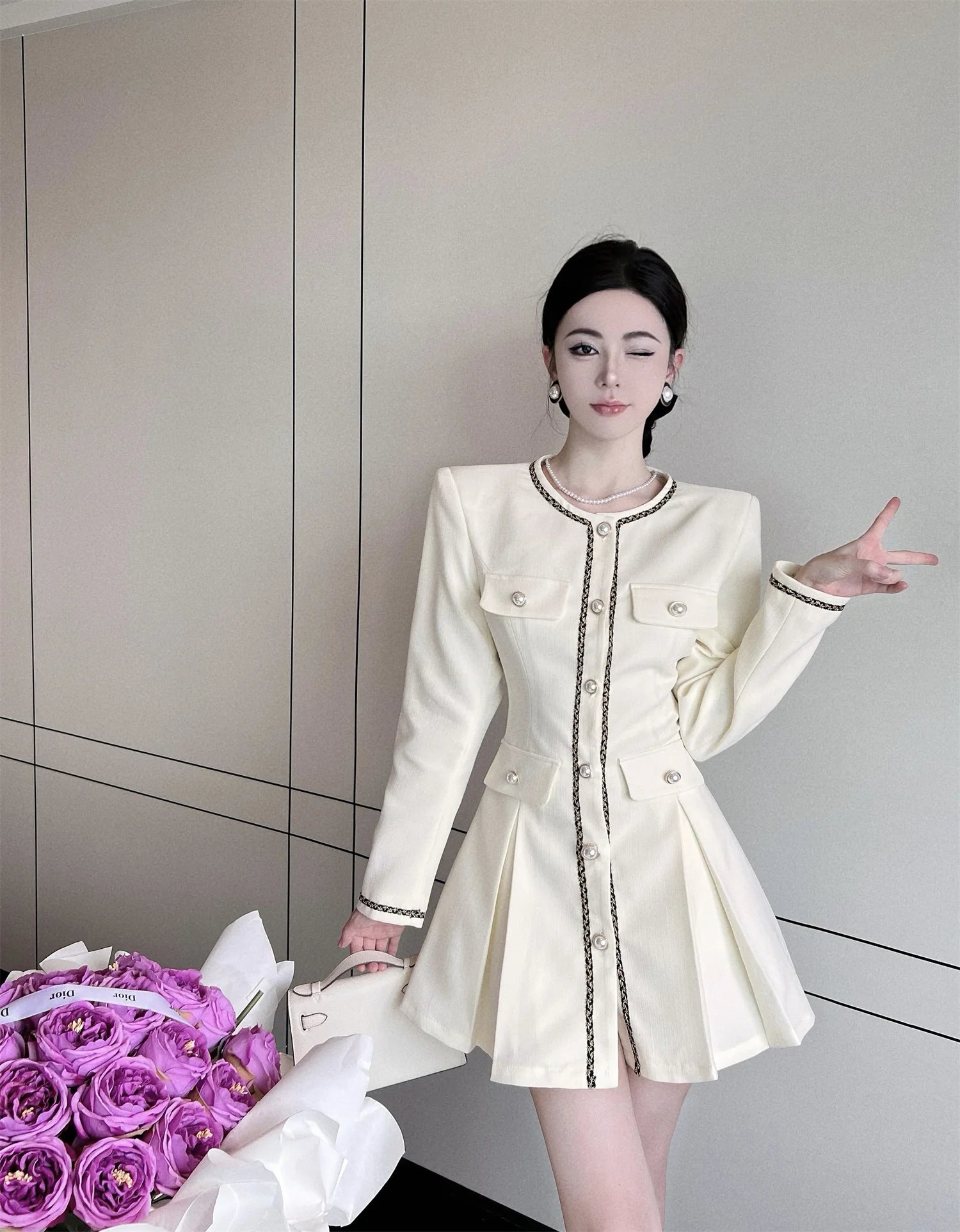 KYLETHOMASW - Korea Vintage Elegant O-neck Single Breasted A-line Mini Work Dress Office Autumn Winter Female Long Sleeve Women Dress