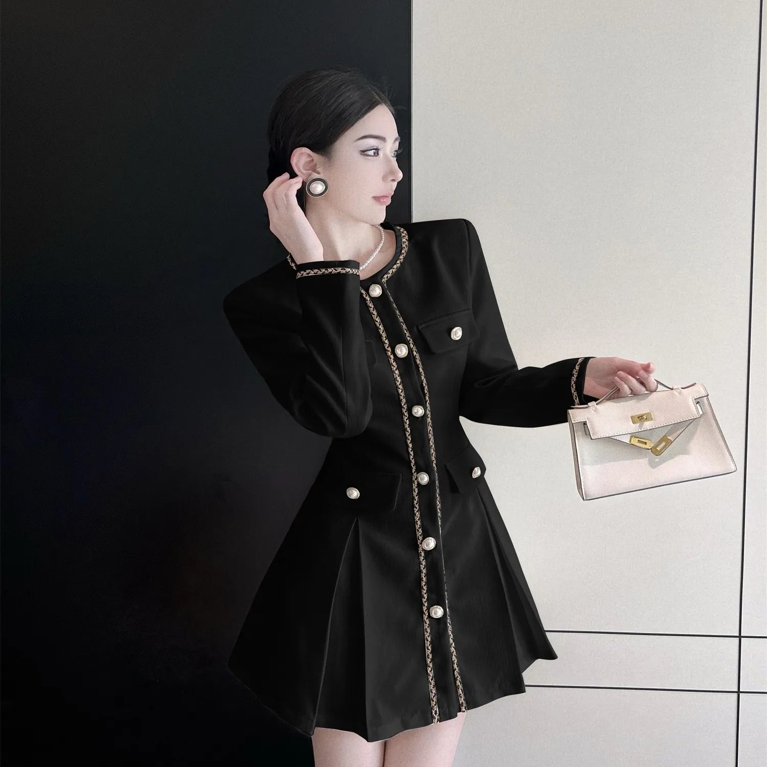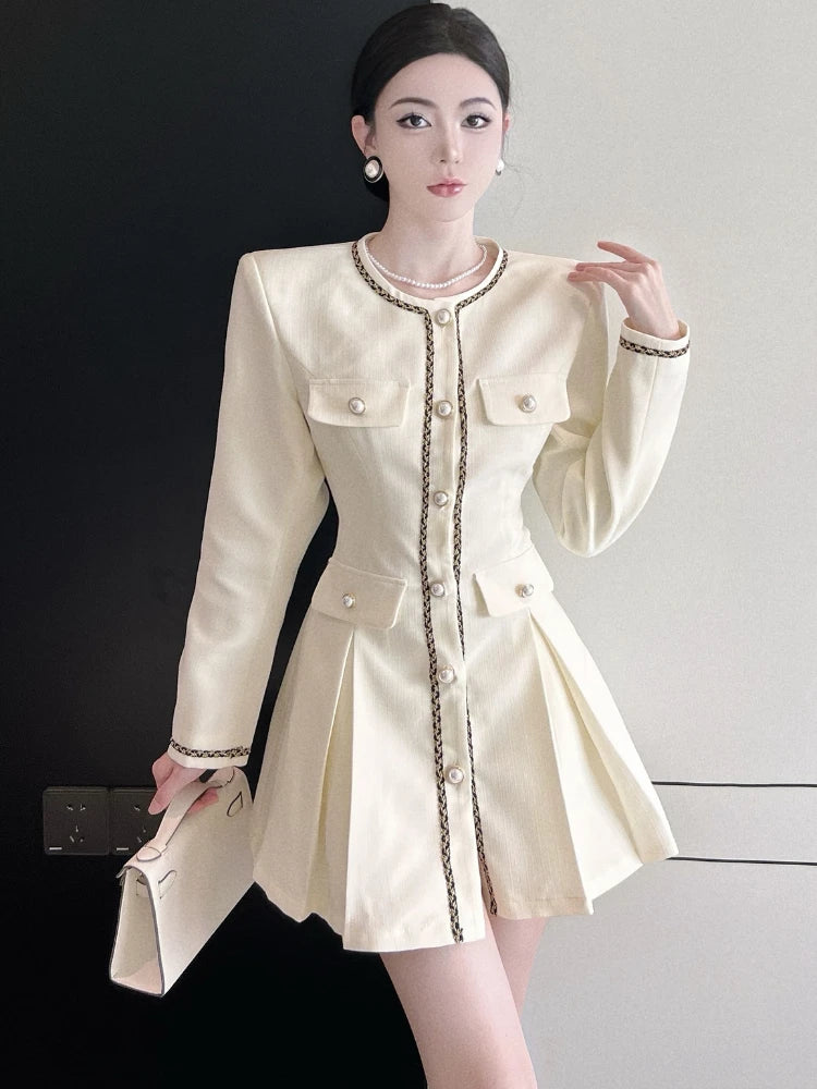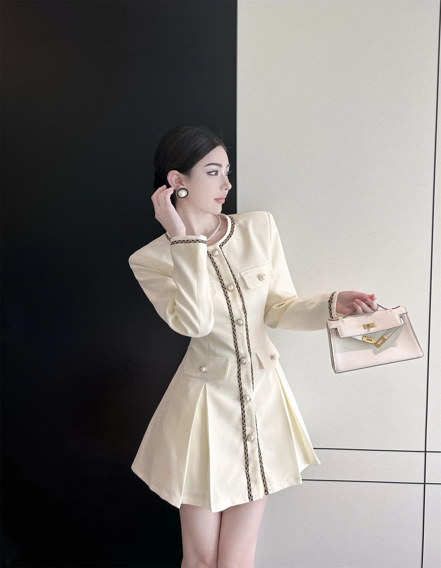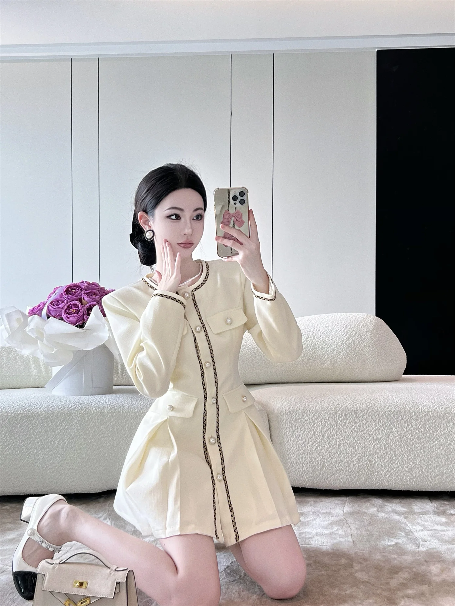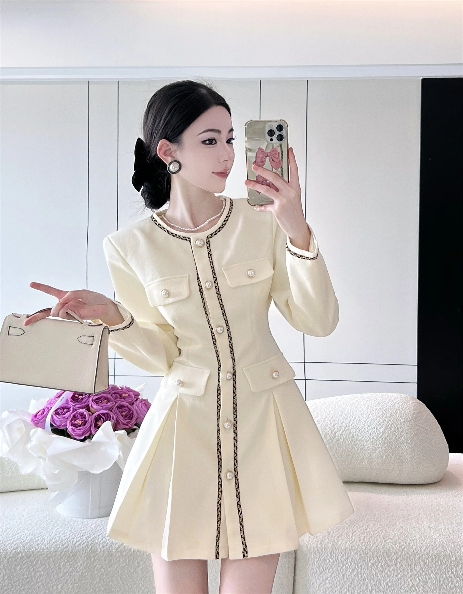 KYLETHOMASW - Korea Vintage Elegant O-neck Single Breasted A-line Mini Work Dress Office Autumn Winter Female Long Sleeve Women Dress