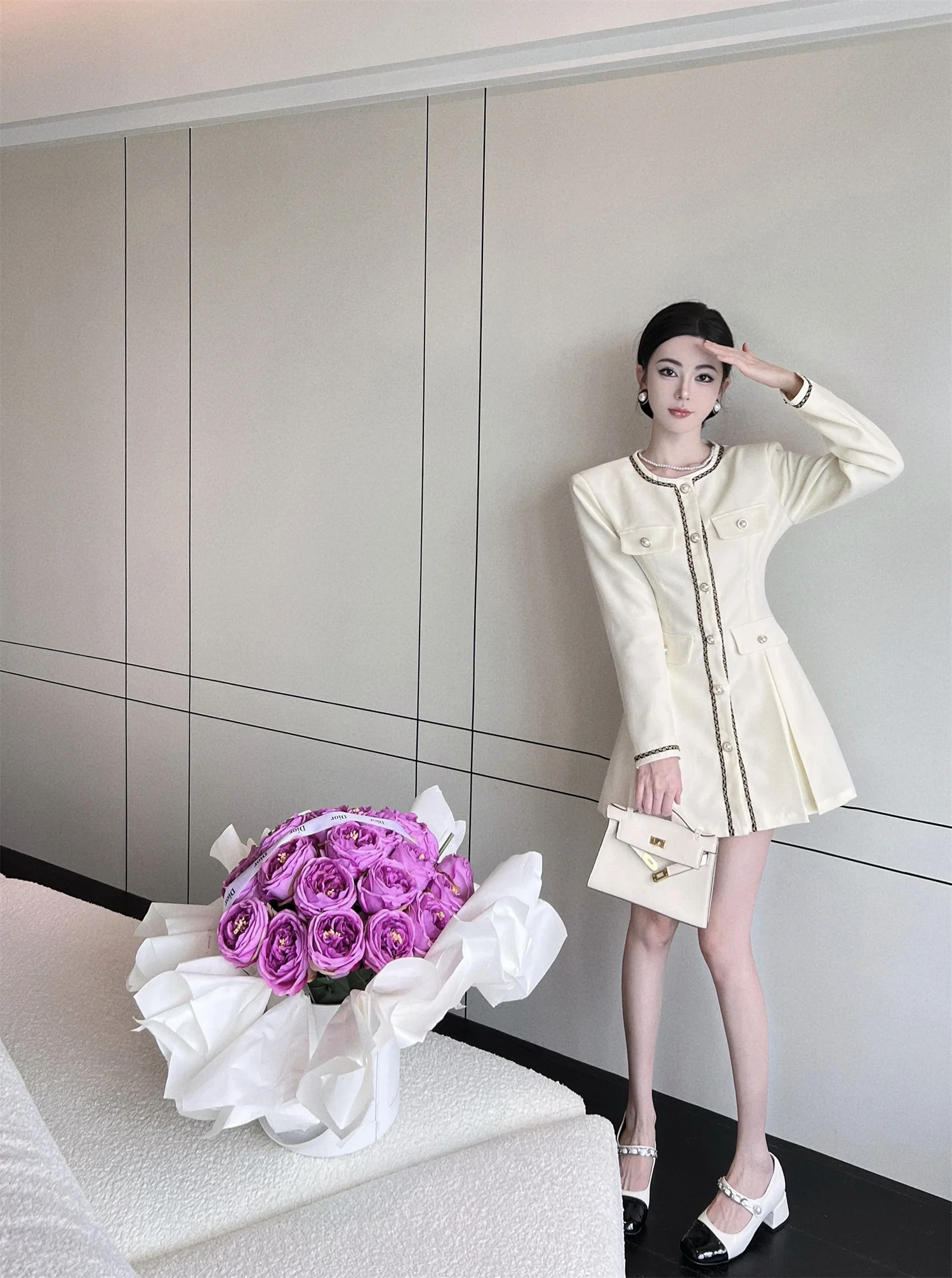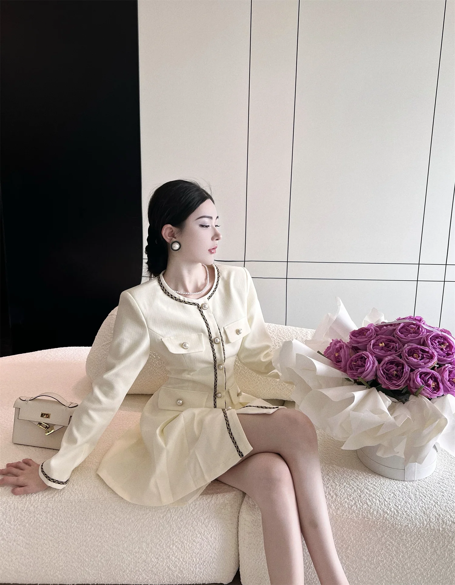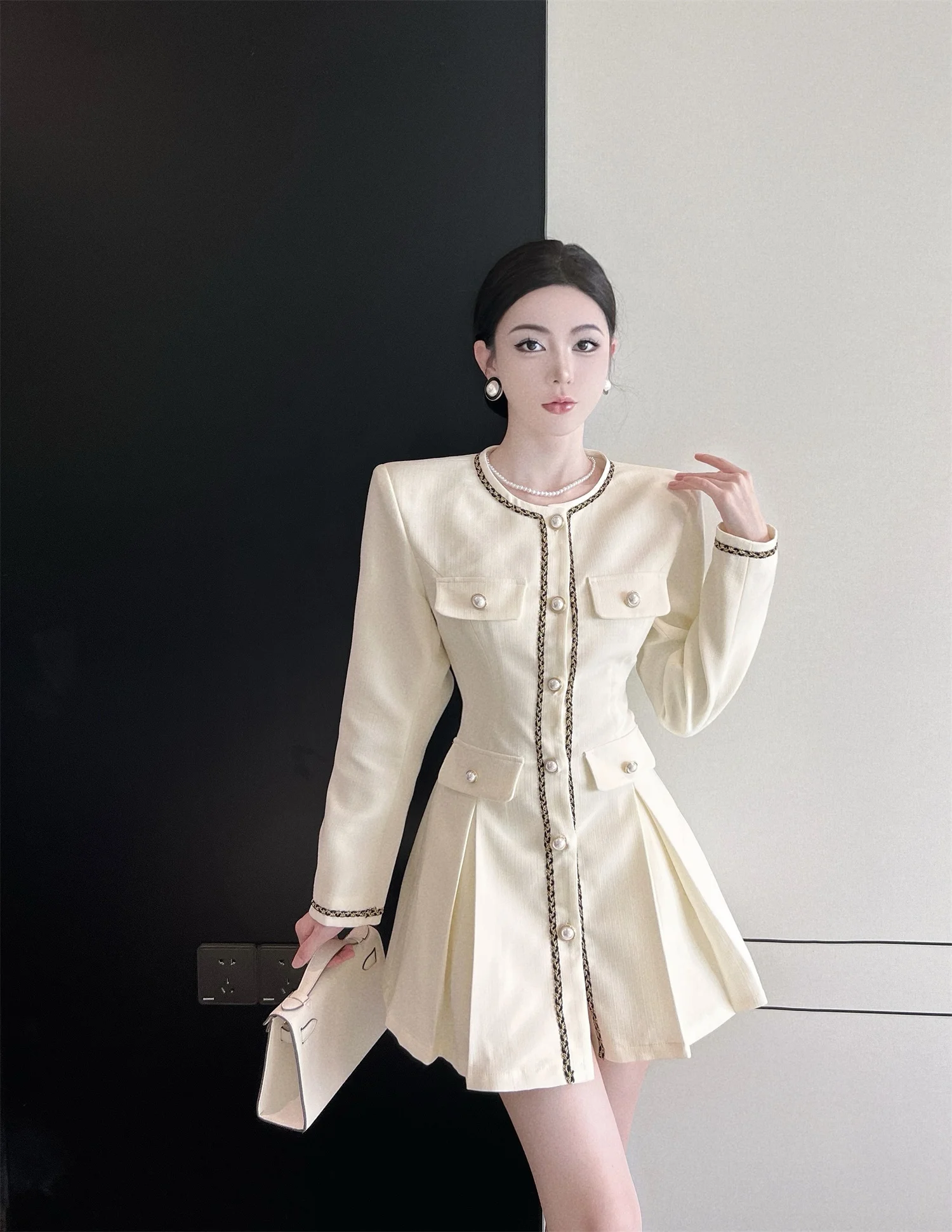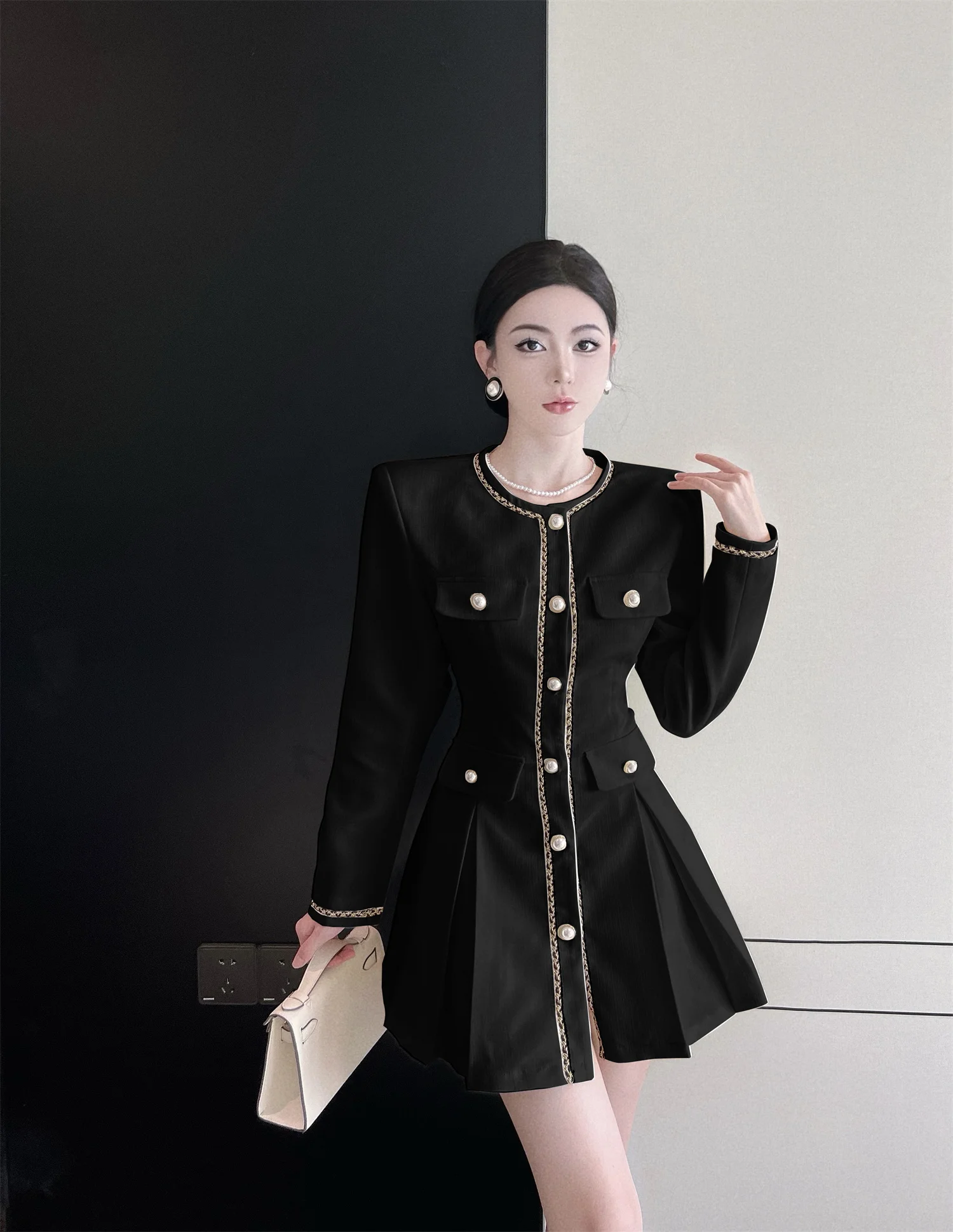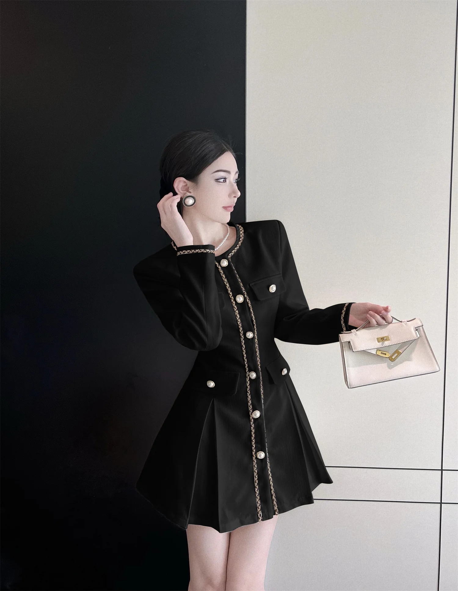 KYLETHOMASW - Korea Vintage Elegant O-neck Single Breasted A-line Mini Work Dress Office Autumn Winter Female Long Sleeve Women Dress