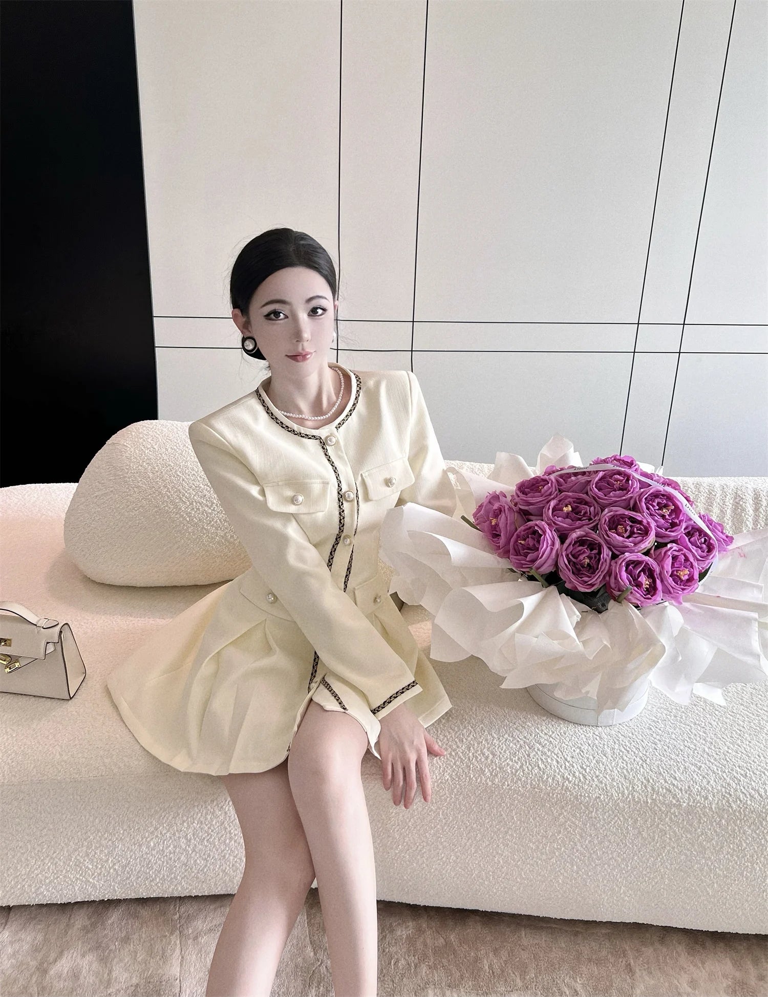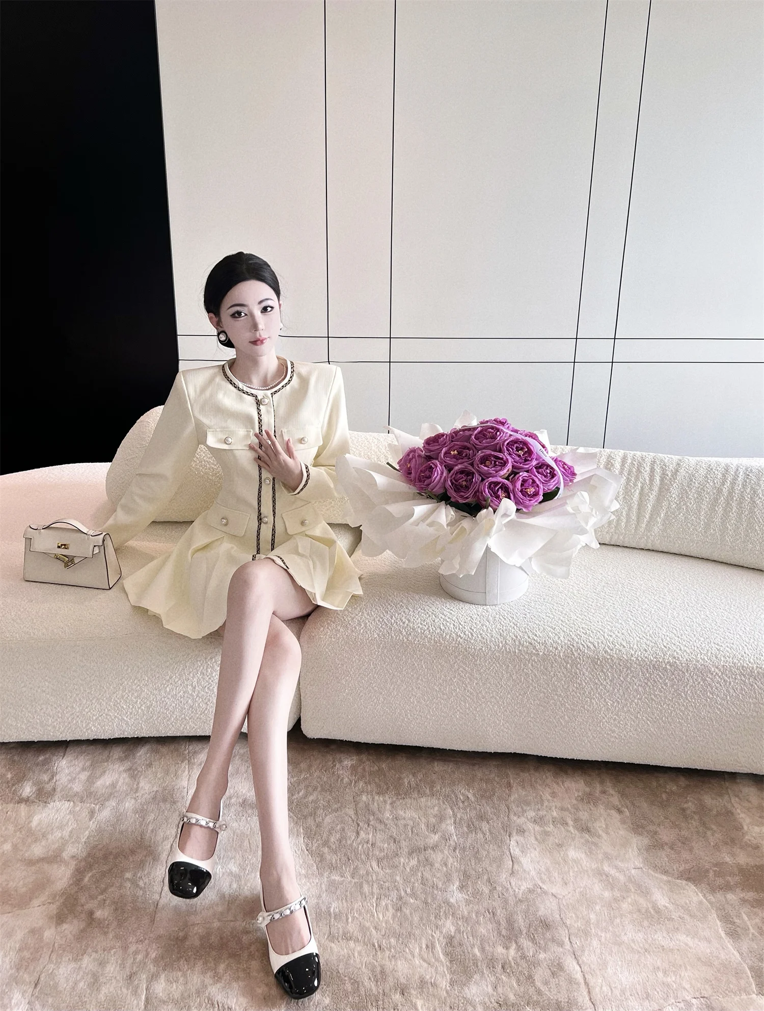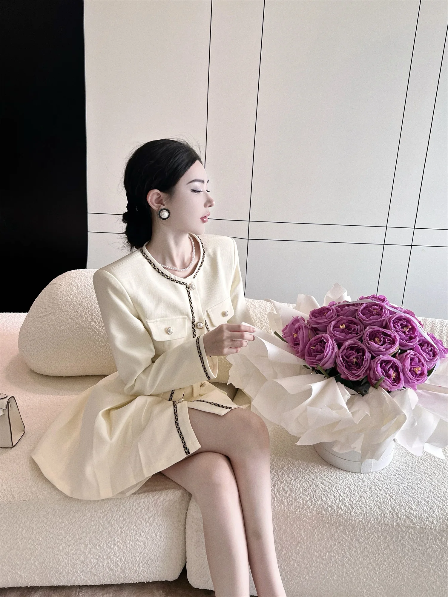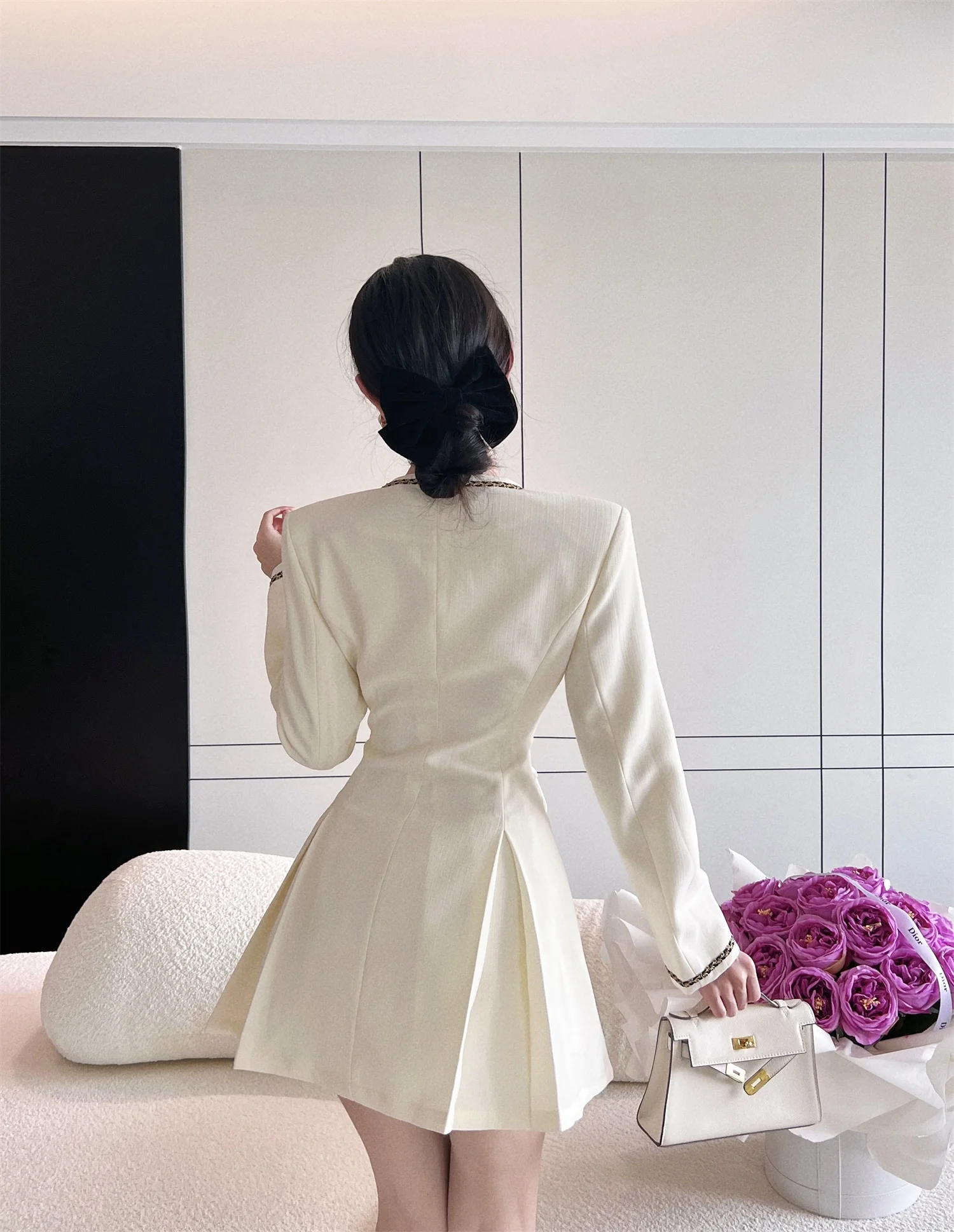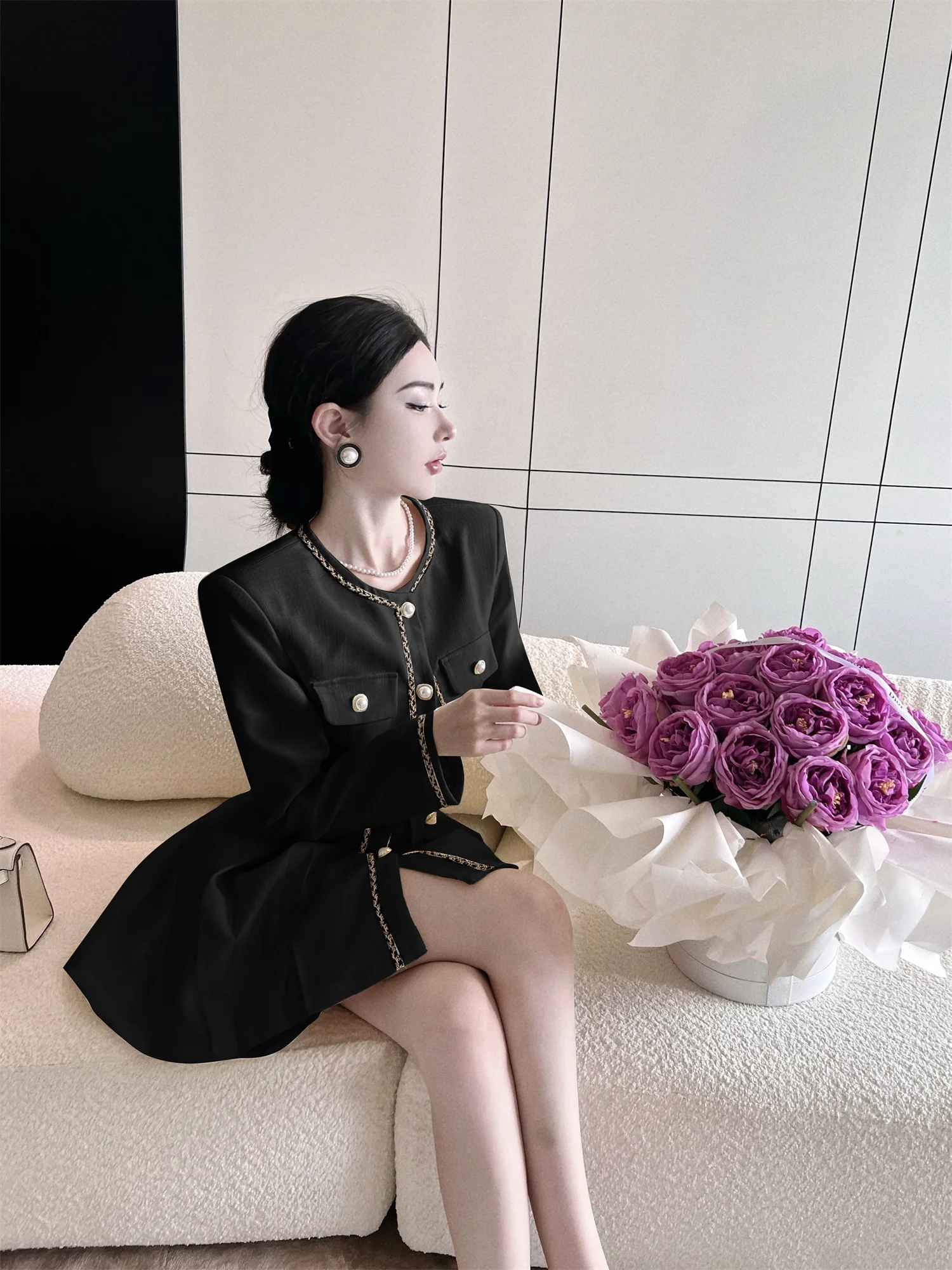 KYLETHOMASW - Korea Vintage Elegant O-neck Single Breasted A-line Mini Work Dress Office Autumn Winter Female Long Sleeve Women Dress