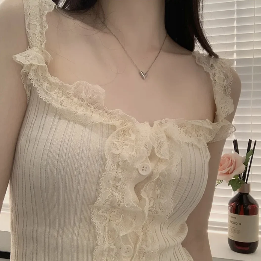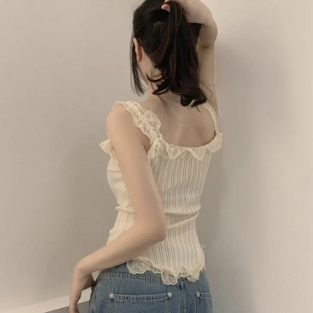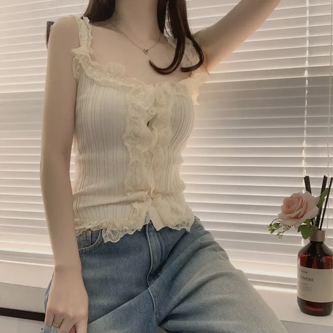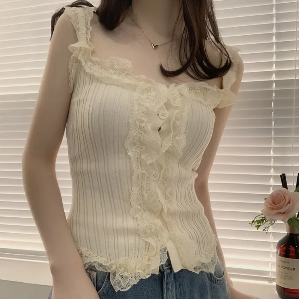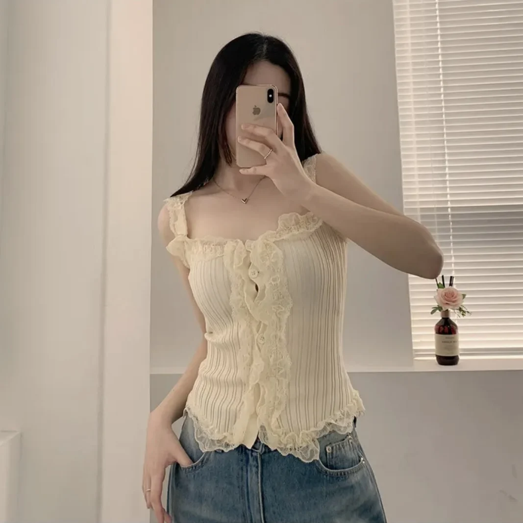KYLETHOMASW - Korean Lace Patchwork Knitted Vest Women Summer New Style Niche Age Reducing Outerwear Short Ice Silk Camisole Top